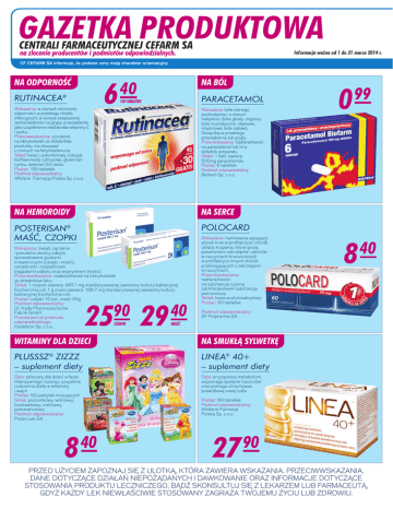 Gazetka produktowa Centrali farmaceutycznej CEFARM SA na zlecenie producentów i podmiotów odpowiedzialnych. Informacja ważna od 1 do 31 marca 2014 r. CF CEFARM SA informuje, że podane ceny mają charakter orientacyjny. Na odporność rutinacea® 6 40 na ból paracetamol 120 tabletek Wskazania: w stanach obniżonej odporności; w przebiegu chorób infekcyjnych; w okresie zwiększonej zachorowalności na grypę, przeziębienie; jako uzupełnienie niedoborów witaminy C i cynku. Przeciwwsakaznia: uczulenie na którykolwiek ze składników produktu; nie stosować u chorych na fenyloketonurię. Skład: kwas L-askorbinowy, rutozyd, bioflawonoidy cytrusowe, glukonian cynku, selenian (IV) sodu Postać: 120 tabletek Podmiot odpowiedzialny: Aflofarm Farmacja Polska Sp. z o.o. Wskazania: bóle różnego pochodzenia i o różnym natężeniu (bóle głowy, migreny, bóle reumatyczne, stawowe, mięśniowe, bóle zębów). Gorączka w przebiegu przeziębienia lub grypy. Przeciwskazania: nadwrażliwość na paracetamol lub inny składnik preparatu Skład: 1 tabl. zawiera 500mg paracetamolu Postać: 6 tabletek Podmiot odpowiedzialny: Biofarm Sp. z o.o. na hemoroidy NA SERCE posterisan® maść, czopki Polocard Wskazania: świąd, sączenie i pieczenie okolicy odbytu spowodowane guzkami krwawniczymi (czopki i maść), szczelinami i rozpadlinami (ragadami) odbytu oraz wypryskiem (maść). Przeciwwskazania: nadwrażliwość na którykolwiek ze składników leku. Skład: 1 czopek zawiera: 387,1 mg standaryzowanej zawiesiny kultury bakteryjnej Escherichia coli 1 g maści zawiera: 166,7 mg standaryzowanej zawiesiny kultury bakteryjnej Escherichia coli. Postać: czopki 10 szt., maść 25g Podmiot odpowiedzialny: Dr. Kade Pharmazeutische Fabrik GmbH Przedstawiciel podmiotu odpowiedzialnego: CZOPKI MAŚĆ Kadefarm Sp. z o.o. 25 29 90 40 Wskazania: hamowanie agregacji płytek krwi w profilaktyce chorób układu krążenia, które grożą powstaniem zakrzepów i zatorów w naczyniach krwionośnych w profilaktyce innych chorób przebiegających z zakrzepami w naczyniach. Przeciwwskazania: nadwrażliwość na substancję czynną lub którąkolwiek substancję pomocniczą. Skład: kwas acetylosalicylowy Postać: 60 tabletek 0 99 8 40 Podmiot odpowiedzialny: ZF Polpharma SA WITAMINY DLA DZIECI NA SMUKŁĄ SYLWETKĘ PLUSSSZ® ZIZZZ – suplement diety LINEA® 40+ – suplement diety Opis: polecany dla dzieci w fazie intensywnego rozwoju; uzupełnia codzienną dietę w witaminy i wapń Postać: 50 pastylek musujących Smak: poziomkowy, wiśniowy, truskawkowy, malinowy, pomarańczowy Podmiot odpowiedzialny: Polski Lek SA Opis: przyspiesza metabolizm, wspomaga spalanie tłuszczów oraz pomaga utrzymywać prawidłową masę ciała. Postać: 60 tabletek Podmiot odpowiedzialny: Aflofarm Farmacja Polska Sp. z o.o. 8 40 27 90 PRZED UŻYCIEM ZAPOZNAJ SIĘ Z ULOTKĄ, KTÓRA ZAWIERA WSKAZANIA, PRZECIWWSKAZANIA, DANE DOTYCZĄCE DZIAŁAŃ NIEPOŻĄDANYCH I DAWKOWANIE ORAZ INFORMACJE DOTYCZĄCE STOSOWANIA PRODUKTU LECZNICZEGO, BĄDŹ SKONSULTUJ SIĘ Z LEKARZEM LUB FARMACEUTĄ, GDYŻ KAŻDY LEK NIEWŁAŚCIWIE STOSOWANY ZAGRAŻA TWOJEMU ŻYCIU LUB ZDROWIU. NA MIGRENĘ Excedrin™ MigraStop Wskazania: doraźne leczenie bólu głowy oraz napadów migreny z aurą lub bez aury Przeciwwskazania: nadwrażliwość na substancję czynną lub jakikolwiek składnik produktu; Skład: 1 tabletka powlekana zawiera 250 mg kwasu acetylosalicylowego, 250 mg paracetamolu oraz 65 mg kofeiny. Postać: 10 lub 20 tabletek powlekanych Podmiot odpowiedzialny: Novartis Consumer Health GmbH, Niemcy na odbudowę flory bakteryjnej TRILAC® 10 CF CEFARM SA informuje, że podane ceny mają charakter orientacyjny. 40 10 tablETEK 15 90 14 40 20 tablETEK Wskazania: leczenie wspomagające po antybiotykoterapii, poantybiotykowe zapalenie jelit ze szczególnym uwzględnieniem leczenia wspomagającego rzekomobłoniastego zapalenia okrężnicy, głównie przy nawracającym rzekomobłoniastym zapaleniu okrężnicy, zapobieganie biegunce podróżnych. Przeciwskazania: nadwrażliwość na substancje czynne lub na którąkolwiek substancję pomocniczą, nadwrażliwość na białko mleka krowiego. Skład: 1 kapsułka zawiera 1,6 x 109 cfu bakterii kwasu mlekowego: Lactobacillus acidophilus (La-5) 37,5%, Lactobacillus delbrueckii subsp. bulgaricus (Lb-Y27) 25,0%, Bifidobacterium lactis (Bb-12) 37,5%. Postać: 20 kapsułek Podmiot odpowiedzialny: Allergon AB Syrop Prawoślazowy na odporność 47 ecomer® ecomer® gold – suplement diety Opis: standaryzowany, najwyższej jakości olej z wątroby rekina grenlandzkiego, najbogatsze źródło alkilogliceroli. Skład: olej z wątroby rekina grenlandzkiego (w tym 20% alkilogliceroli), żelatyna-skład otoczki kapsułki, glicerol-substancja utrzymująca wilgoć. Postać: 60 lub 120 kapsułek Producent: Krotex-Poland Sp. z o.o. test ciążowy systane® ULTRA AMIL TEST CIĄŻOWY Opis: leczenie objawów suchego oka, przynoszą czasową ulgę przy pieczeniu i podrażnieniu spowodowanym suchością oka, mogą być używane do nawilżania lub przywracania wilgotności miękkich soczewek kontaktowych. Postać: krople do oczu 10 ml Podmiot odpowiedzialny: Alcon Polska Sp. z o.o. • wiarygodny – dokładność ponad 99,9%; • prosty – wystarczy nanieść próbkę moczu na płytkę; • szybki – wynik już po 3 minutach; • wygodny - test możesz wykonać o każdej porze dnia. 23 na oczy Vitapil® z biotyną – suplement diety nutrof® total – suplement diety Opis: wspomagająco jako uzupełnienie diety w witaminy i składniki mineralne szczególnie w problemach związanych z kondycją włosów. Opis: zawiera luteinę, zeaksantynę, minerały i witaminy, a także kwasy omega-3 oraz resweratrol; z powodu zawartości cynku, miedzi, witaminy C i E, które przyczyniają się do ochrony struktur komórkowych, przed działaniem oksydacyjnym. Podmiot odpowiedzialny: Holbex Sp. z o.o. 29 90 90 120 kapsułek 42 90 5 90 60 kapsułek Podmio