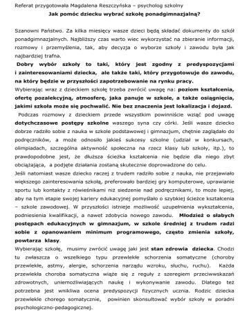 Referat przygotowała Magdalena Reszczyńska – psycholog szkolny Jak pomóc dziecku wybrać szkołę ponadgimnazjalną? Szanowni Państwo. Za kilka miesięcy wasze dzieci będą składać dokumenty do szkół ponadgimnazjalnych. Najbliższy czas warto wiec wykorzystać na zbieranie informacji, rozmowy i przemyślenia, tak, aby decyzja o wyborze szkoły i zawodu była jak najbardziej trafna. Dobry wybór szkoły to taki, który jest zgodny z predyspozycjami i zainteresowaniami dziecka, ale takŜe taki, który przygotowuje do zawodu, na który będzie w przyszłości zapotrzebowanie na rynku pracy. Wybierając wraz z dzieckiem szkołę trzeba zwrócić uwagę na: poziom kształcenia, ofertę pozalekcyjną, atmosferę, jaka panuje w szkole, a takŜe osiągnięcia, jakimi szkoła moŜe się pochwalić. Nie bez znaczenia jest lokalizacja i dojazd. Podczas rozmowy z dzieckiem przede wszystkim powinniście wziąć pod uwagę dotychczasowe postępy szkolne waszego syna czy córki. Jeśli wasze dziecko dobrze radziło sobie z nauka w szkole podstawowej i gimnazjum, chętnie zaglądało do podręczników, a może odnosiło jakieś sukcesy szkolne (udział w konkursach, olimpiadach, szczególna aktywność społeczna na rzecz klasy lub szkoły, itp.), to prawdopodobne jest, że dłuższa ścieżka kształcenia nie będzie dla niego zbyt obciążająca, a podjęte działania zostaną skutecznie doprowadzone do celu. Jeśli natomiast wasze dziecko raczej z trudem radziło sobie z nauka, nie przejawiało większego zainteresowania szkołą, preferowało bardziej gry komputerowe, uprawianie sportu lub kontakty z rówieśnikami niż siedzenie nad podręcznikami, to może lepiej, aby na tym etapie swojej kariery edukacyjnej pomyślało o szybkiej ścieżce kształcenia – szkole zawodowej. W przyszłości istnieje możliwość uzupełnienia wykształcenia, podniesienia kwalifikacji, a nawet zdobycia nowego zawodu. MłodzieŜ o słabych postępach edukacyjnych w gimnazjum, w szkole średniej z trudem radzi sobie z opanowaniem minimum programowego, często zmienia szkoły, powtarza klasy. Wybierając szkołę, musimy zwrócić uwagę jaki jest stan zdrowia dziecka. Chodzi tu zwłaszcza o wszelkiego typu przewlekłe schorzenia somatyczne przewlekłe, astmy, alergie, schorzenia narządu wzroku, słuchu, ruchu). (choroby Każda przewlekła choroba somatyczna wiąże się z reguły z szeregiem przeciwwskazań zdrowotnych, uniemożliwiających naukę i wykonywanie zawodu. Dlatego też potrzebna jest wnikliwa ocena predyspozycji fizycznych ucznia. Rodzic dziecka przewlekle chorego somatycznie, psychologiczno-pedagogicznej. powinien skonsultować wybór szkoły w poradni RóŜnorodna oferta daje wiele moŜliwości i gwarantując wszystkim uczniom kontynuację nauki po kaŜdym etapie kształcenia W GDAŃSKU młodzieŜ ma do wyboru : • 18 publicznych liceum ogólnokształcących, oferujących naukę w ponad 80 oddziałach o bardzo różnorodnych profilach, specyfice i tradycji, w tym: klasy z programami autorskimi, dwujęzyczne i sportowe, artystyczne • 39 zawodów w technikach • 30 zawodów w zasadniczych szkołach zawodowych • niepubliczne licea ogólnokształcące, niepubliczne technikum Liceum Ogólnokształcące Nauka trwa 3 lata. Zapewnia wykształcenie ogólne na poziomie średnim i przygotowuje do egzaminu maturalnego. Absolwenci liceów ogólnokształcących po ukończeniu ostatniej klasy uzyskują wykształcenie średnie, co daje im możliwość ubiegania się o przyjęcie do szkół policealnych. Po zdaniu egzaminu maturalnego uzyskują prawo do ubiegania się o przyjęcie na studia wyższe. W trzyletnich liceach ogólnokształcących uczniowie realizują od 2 do 4 przedmiotów w zakresie rozszerzonym (przy znacząco zwiększonej liczbie godzin!), co umożliwi pogłębianie zainteresowań i gruntowne przygotowanie do kontynuacji nauki na wybranych kierunkach studiów. W klasie I trwa kontynuacja kształcenia ogólnego we wszystkich dziedzinach we wszystkich profilach. Uczniowie wszystkich profili zasadniczo realizują zajęcia wg tej samej siatki godzin. Od klasy II są nadal realizowane przedmioty maturalne oraz wybrane zgodnie z rozszerzeniem, uzupełniające i mogą być realizowane zajęcia dodatkowe autorstwa szkoły. I tak: o uczniowie profili matematyczno-przyrodniczych będą realizowali przedmiot uzupełniający „historia i społeczeństwo”, który poszerza wiedzę w zakresie nauk humanistycznych, o uczniowie profili humanistycznych przedmiot uzupełniający „przyroda”, który poszerza wiedzę w zakresie nauk matematyczno-przyrodniczych. wybierając profil uczniowie decydują, których przedmiotów od drugiej klasy będą się uczyć w zakresie rozszerzonym, a których w podstawowym. Wybór przedmiotów w zakresie rozszerzonym to wstęp do wyboru przedmiotów zdawanych na maturze, z których wyniki uwzględniane są przy rekrutacji na poszczególne kierunki studiów. Technikum Nauka trwa 4 lata. Przygotowuje do egzaminów potwierdzających kwalifikacje zawodowe – ułatwiającego szybkie rozpoczęcie pracy zawodowej oraz egzaminu maturalnego umożliwiającego kontynuację nauki na uczelniach wyższych. W programie są zarówno przedmioty ogólne (takie jak w liceum ogólnokształcącym) jak i zawodowe; 50% zajęć realizowanych w kształceniu zawodowym stanowi kształcenie praktyczne. W trakcie nauki w technikum uczeń zdaje egzaminy zawodowe, po każdym otrzymuje świadectwo potwierdzające daną kwalifikację zawodową. Ich liczba zależy od zawodu – są to najczęściej dwie lub trzy kwalifikacje. Po ukończeniu technikum otrzymuje dyplom potwierdzający kwalifikacje zawodowe. Jednocześnie może przystąpić do egzaminu maturalnego. Po uzyskaniu matury absolwent technikum ma otwarte drzwi na studia wyższe. Absolwenci często wybierają studia na kierunkach zgodnych ze swoim wyuczonym w technikum zawodem. Jeśli po ukończeniu technikum chce się zmienić zawód, to ró