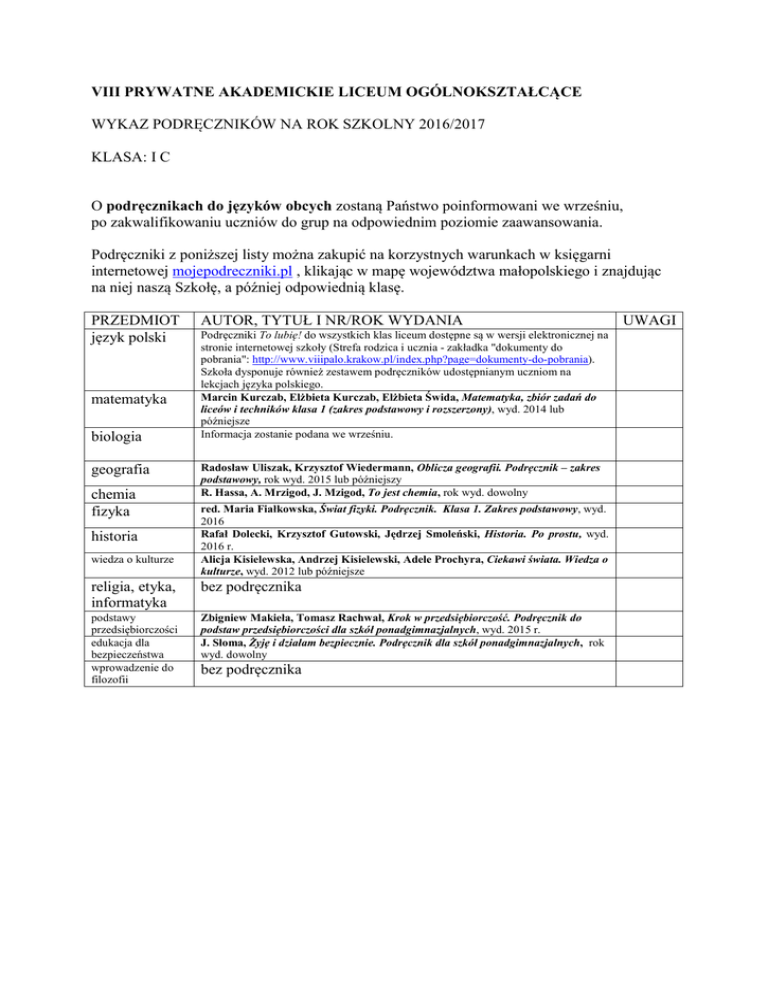 VIII PRYWATNE AKADEMICKIE LICEUM OGÓLNOKSZTAŁCĄCE WYKAZ PODRĘCZNIKÓW NA ROK SZKOLNY 2016/2017 KLASA: I C O podręcznikach do języków obcych zostaną Państwo poinformowani we wrześniu, po zakwalifikowaniu uczniów do grup na odpowiednim poziomie zaawansowania. Podręczniki z poniższej listy można zakupić na korzystnych warunkach w księgarni internetowej mojepodreczniki.pl , klikając w mapę województwa małopolskiego i znajdując na niej naszą Szkołę, a później odpowiednią klasę. PRZEDMIOT język polski matematyka biologia geografia chemia fizyka historia wiedza o kulturze AUTOR, TYTUŁ I NR/ROK WYDANIA Podręczniki To lubię! do wszystkich klas liceum dostępne są w wersji elektronicznej na stronie internetowej szkoły (Strefa rodzica i ucznia - zakładka "dokumenty do pobrania": http://www.viiipalo.krakow.pl/index.php?page=dokumenty-do-pobrania). Szkoła dysponuje również zestawem podręczników udostępnianym uczniom na lekcjach języka polskiego. Marcin Kurczab, Elżbieta Kurczab, Elżbieta Świda, Matematyka, zbiór zadań do liceów i techników klasa 1 (zakres podstawowy i rozszerzony), wyd. 2014 lub późniejsze Informacja zostanie podana we wrześniu. Radosław Uliszak, Krzysztof Wiedermann, Oblicza geografii. Podręcznik – zakres podstawowy, rok wyd. 2015 lub późniejszy R. Hassa, A. Mrzigod, J. Mzigod, To jest chemia, rok wyd. dowolny red. Maria Fiałkowska, Świat fizyki. Podręcznik. Klasa 1. Zakres podstawowy, wyd. 2016 Rafał Dolecki, Krzysztof Gutowski, Jędrzej Smoleński, Historia. Po prostu, wyd. 2016 r. Alicja Kisielewska, Andrzej Kisielewski, Adele Prochyra, Ciekawi świata. Wiedza o kulturze, wyd. 2012 lub późniejsze religia, etyka, informatyka bez podręcznika podstawy przedsiębiorczości edukacja dla bezpieczeństwa wprowadzenie do filozofii Zbigniew Makieła, Tomasz Rachwał, Krok w przedsiębiorczość. Podręcznik do podstaw przedsiębiorczości dla szkół ponadgimnazjalnych, wyd. 2015 r. J. Słoma, Żyję i działam bezpiecznie. Podręcznik dla szkół ponadgimnazjalnych, rok wyd. dowolny bez podręcznika UWAGI