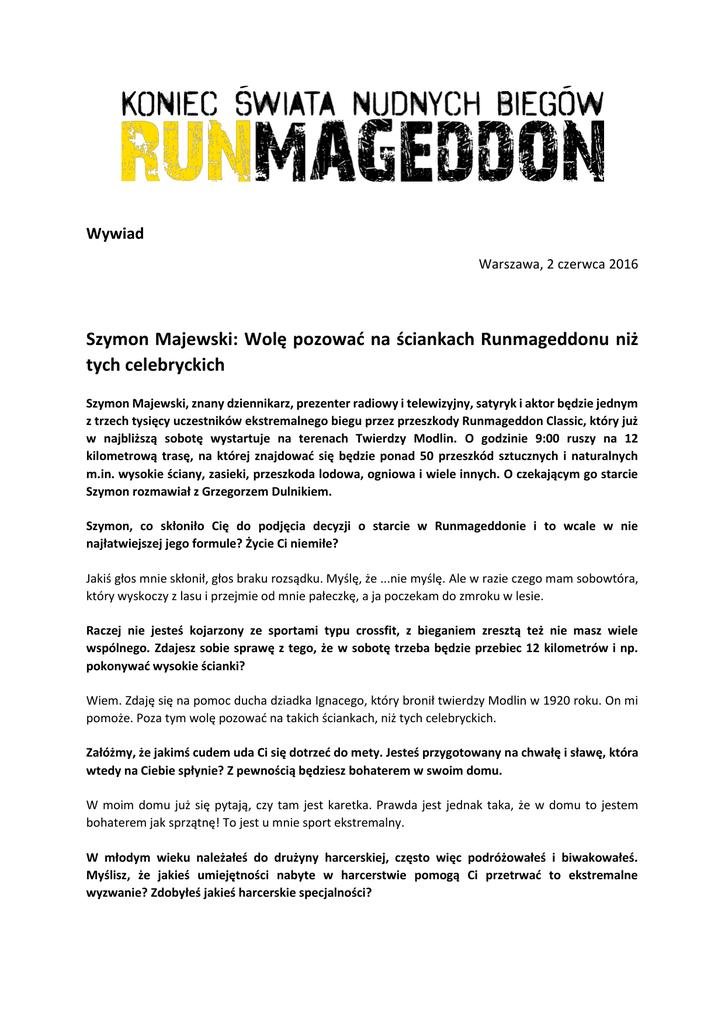 Wywiad Warszawa, 2 czerwca 2016 Szymon Majewski: Wolę pozować na ściankach Runmageddonu niż tych celebryckich Szymon Majewski, znany dziennikarz, prezenter radiowy i telewizyjny, satyryk i aktor będzie jednym z trzech tysięcy uczestników ekstremalnego biegu przez przeszkody Runmageddon Classic, który już w najbliższą sobotę wystartuje na terenach Twierdzy Modlin. O godzinie 9:00 ruszy na 12 kilometrową trasę, na której znajdować się będzie ponad 50 przeszkód sztucznych i naturalnych m.in. wysokie ściany, zasieki, przeszkoda lodowa, ogniowa i wiele innych. O czekającym go starcie Szymon rozmawiał z Grzegorzem Dulnikiem. Szymon, co skłoniło Cię do podjęcia decyzji o starcie w Runmageddonie i to wcale w nie najłatwiejszej jego formule? Życie Ci niemiłe? Jakiś głos mnie skłonił, głos braku rozsądku. Myślę, że ...nie myślę. Ale w razie czego mam sobowtóra, który wyskoczy z lasu i przejmie od mnie pałeczkę, a ja poczekam do zmroku w lesie. Raczej nie jesteś kojarzony ze sportami typu crossfit, z bieganiem zresztą też nie masz wiele wspólnego. Zdajesz sobie sprawę z tego, że w sobotę trzeba będzie przebiec 12 kilometrów i np. pokonywać wysokie ścianki? Wiem. Zdaję się na pomoc ducha dziadka Ignacego, który bronił twierdzy Modlin w 1920 roku. On mi pomoże. Poza tym wolę pozować na takich ściankach, niż tych celebryckich. Załóżmy, że jakimś cudem uda Ci się dotrzeć do mety. Jesteś przygotowany na chwałę i sławę, która wtedy na Ciebie spłynie? Z pewnością będziesz bohaterem w swoim domu. W moim domu już się pytają, czy tam jest karetka. Prawda jest jednak taka, że w domu to jestem bohaterem jak sprzątnę! To jest u mnie sport ekstremalny. W młodym wieku należałeś do drużyny harcerskiej, często więc podróżowałeś i biwakowałeś. Myślisz, że jakieś umiejętności nabyte w harcerstwie pomogą Ci przetrwać to ekstremalne wyzwanie? Zdobyłeś jakieś harcerskie specjalności? Tak byłem np. kuchcikiem. Doświadczenie z harcerstwa mi się przyda, pomoże mi wycofać się w las i bez wstydu przeżyć tam do nocy, żeby uciec na pociąg do Warszawy. To przygotuj się na dłuższy pobyt w lesie, bo jak dobrze pójdzie Runmageddon skończy się nad ranem! Z racji Twojego wysokiego wzrostu możesz okazać się bardzo pomocny dla innych uczestników biegu, choćby przy przerzucaniu ich przez wysokie ściany. Postawisz na współpracę na trasie czy raczej pobiegniesz na wynik? Współpraca. Koszt przerzucenia przez Majewskiego na drugą stronę 100 zł plus VAT. Do nocy trochę zarobię. Jestem dobrą tyczką, zawsze miałem kij w.......mrowisku. Jest jakaś przeszkoda, której boisz się najbardziej? Boję się najbardziej przeszkody w postaci tego, że mam 49 lat, suche kolana, skrzywienie kręgosłupa i przepuklinę pępkową. O reszcie przeszkód nie chcę nawet wiedzieć! Dziękuję za rozmowę. Grzegorz Dulnik *** O biegu Runmageddon (www.runmageddon.pl) Runmageddon to największy cykl ekstremalnych biegów przez przeszkody w Polsce. Organizatorami imprezy są Fundacja Runmageddon oraz firma Extreme Events. Runmageddon zwiastuje koniec ery nudnych biegów ulicznych oferując jego uczestnikom ekstremalne wrażenia. To wydarzenie nastawione na dobrą zabawę, do której pretekstem jest wysiłek fizyczny i rywalizacja o miano najtwardszego zawodnika. Uczestnik prąc naprzód wspinają się, czołgają, brną w błocie, skaczą, a także mierzą się z wodą oraz ogniem. Imprezy pod szyldem Runmageddonu odbywają się w formułach Intro (3 km i +15 przeszkód), Rekrut (6km i +30 przeszkód), Classic (12km i + 50 przeszkód) oraz Hardcore (21km i +70 przeszkód). Cechą, która wyróżnia Runnmageddon wśród innych biegów przeszkodowych jest gęstość rozmieszczenia przeszkód na trasie oraz pomysłowość w ich budowaniu. Runmageddon jako pierwszy w Europie zorganizował we wrześniu 2015 nocny bieg przeszkodowy. W maju 2016 zorganizował Górski Festiwal Runmageddonu, podczas którego odbył się po raz pierwszy na świecie bieg w formule ULTRA na dystansie ponad 44km i ponad 140 przeszkód. Kontakt dla mediów: Marcin Dulnik Rzecznik prasowy Runmageddon Agencja In Fact PR [email protected] mobile: 660 722 822