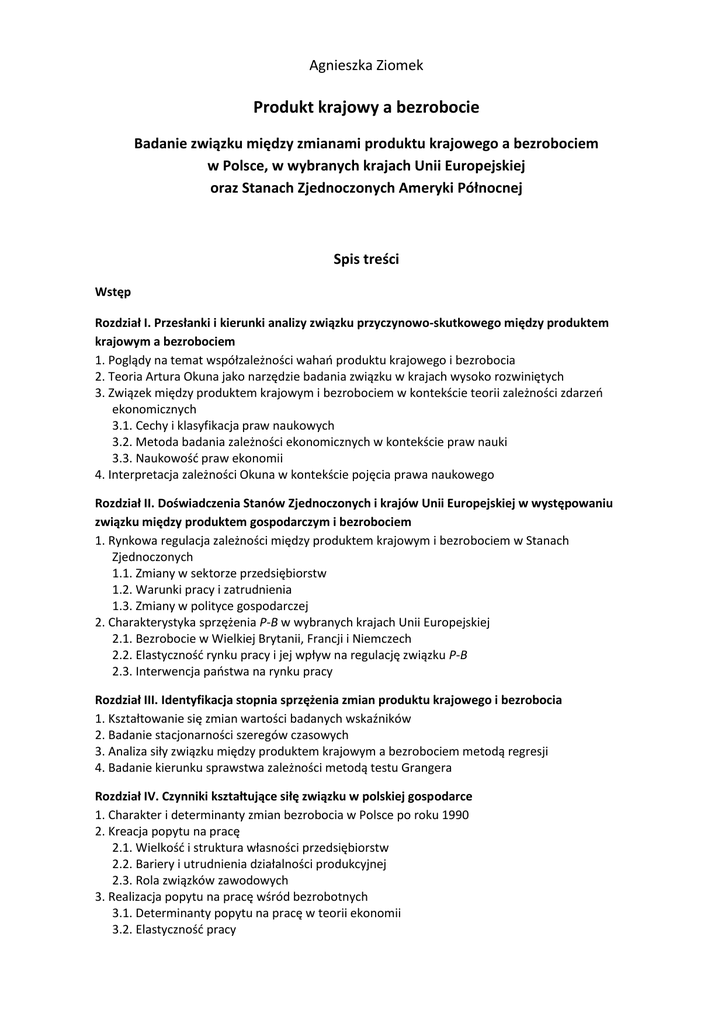 Agnieszka Ziomek Produkt krajowy a bezrobocie Badanie związku między zmianami produktu krajowego a bezrobociem w Polsce, w wybranych krajach Unii Europejskiej oraz Stanach Zjednoczonych Ameryki Północnej Spis treści Wstęp Rozdział I. Przesłanki i kierunki analizy związku przyczynowo-skutkowego między produktem krajowym a bezrobociem 1. Poglądy na temat współzależności wahań produktu krajowego i bezrobocia 2. Teoria Artura Okuna jako narzędzie badania związku w krajach wysoko rozwiniętych 3. Związek między produktem krajowym i bezrobociem w kontekście teorii zależności zdarzeń ekonomicznych 3.1. Cechy i klasyfikacja praw naukowych 3.2. Metoda badania zależności ekonomicznych w kontekście praw nauki 3.3. Naukowość praw ekonomii 4. Interpretacja zależności Okuna w kontekście pojęcia prawa naukowego Rozdział II. Doświadczenia Stanów Zjednoczonych i krajów Unii Europejskiej w występowaniu związku między produktem gospodarczym i bezrobociem 1. Rynkowa regulacja zależności między produktem krajowym i bezrobociem w Stanach Zjednoczonych 1.1. Zmiany w sektorze przedsiębiorstw 1.2. Warunki pracy i zatrudnienia 1.3. Zmiany w polityce gospodarczej 2. Charakterystyka sprzężenia P-B w wybranych krajach Unii Europejskiej 2.1. Bezrobocie w Wielkiej Brytanii, Francji i Niemczech 2.2. Elastyczność rynku pracy i jej wpływ na regulację związku P-B 2.3. Interwencja państwa na rynku pracy Rozdział III. Identyfikacja stopnia sprzężenia zmian produktu krajowego i bezrobocia 1. Kształtowanie się zmian wartości badanych wskaźników 2. Badanie stacjonarności szeregów czasowych 3. Analiza siły związku między produktem krajowym a bezrobociem metodą regresji 4. Badanie kierunku sprawstwa zależności metodą testu Grangera Rozdział IV. Czynniki kształtujące siłę związku w polskiej gospodarce 1. Charakter i determinanty zmian bezrobocia w Polsce po roku 1990 2. Kreacja popytu na pracę 2.1. Wielkość i struktura własności przedsiębiorstw 2.2. Bariery i utrudnienia działalności produkcyjnej 2.3. Rola związków zawodowych 3. Realizacja popytu na pracę wśród bezrobotnych 3.1. Determinanty popytu na pracę w teorii ekonomii 3.2. Elastyczność pracy 3.3. Mobilność przestrzenna 4. Rola i polityka państwa w stymulowaniu związku 4.1. Działania państwa kształtujące warunki produkcji 4.2. Działania państwa w dziedzinie rynku pracy Rozdział V. Modelowe ujęcie systemu procesów określających występowanie zależności P-B 1. Metoda dynamiki systemowej 2. Struktura modelu zależności P-B 3. Model matematyczny i schemat graficzny modelu zależności P-B Podsumowanie Bibliografia