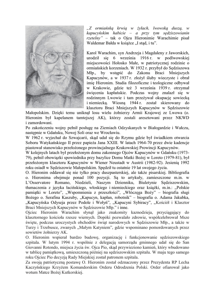„Z ormiańską krwią w żyłach, lwowską duszą, w kapucyńskim habicie – a przy tym sędziszowianin rzetelny” – tak o Ojcu Hieronimie Warachimie pisał Waldemar Bałda w książce „I stąd, i tu”. Karol Warachim, syn Andrzeja i Magdaleny z Jaworskich, urodził się 6 września 1916 r. w podlwowskiej miejscowości Hołosko Małe, w patriotycznej rodzinie o ormiańskich korzeniach. W 1932 r. przybył do Sędziszowa Młp., by wstąpić do Zakonu Braci Mniejszych Kapucynów, a w 1937 r. złożył śluby wieczyste i obrał imię Hieronim. Studia filozoficzne i teologiczne odbywał w Krakowie, gdzie też 3 września 1939 r. otrzymał święcenia kapłańskie. Podczas wojny znalazł się w rodzinnym Lwowie i tam przeżywał okupację sowiecką i niemiecką. Wiosną 1944 r. został skierowany do klasztoru Braci Mniejszych Kapucynów w Sędziszowie Małopolskim. Dzięki temu uniknął losu wielu żołnierzy Armii Krajowej ze Lwowa (o. Hieronim był kapelanem tamtejszej AK), którzy zostali aresztowani przez NKWD i zamordowani. Po zakończeniu wojny pełnił posługę na Ziemiach Odzyskanych w Białogardzie i Wałczu, następnie w Gdańsku, Nowej Soli oraz we Wrocławiu. W 1962 r. wyjechał do Szwajcarii, skąd udał się do Rzymu gdzie był świadkiem otwarcia Soboru Watykańskiego II przez papieża Jana XXIII. W latach 1964-70 przez dwie kadencje piastował stanowisko przełożonego prowincjalnego Krakowskiej Prowincji Kapucynów. W kolejnych latach był przełożonym domu zakonnego Ojców Kapucynów w Gdańsku (197379), pełnił obowiązki spowiednika przy bazylice Domu Matki Bożej w Loreto (1979-81), był przełożonym klasztoru Kapucynów w Wiener Neustadt w Austrii (1982-92). Jesienią 1992 roku osiadł w Sędziszowie Małopolskim. Spędził tu ostatnie 19 lat swojego życia. O. Hieronim oddawał się nie tylko pracy duszpasterskiej, ale także pisarskiej. Bibliografia o. Hieronima obejmuje ponad 100 pozycji. Są to artykuły, zamieszczone m.in. w L’Osservatore Romano, Niedzieli, Naszym Dzienniku, Biuletynie Sędziszowskim, tłumaczenia z języka łacińskiego, włoskiego i niemieckiego oraz książki, m.in.: „Polskie pamiątki w Loreto”, „Wspomnienia z przeszłości”, „Włóczęga Boży” – biografia sługi Bożego o. Serafina Kaszuby, „Kapucyn, kapłan, robotnik” – biografia o. Adama Jakubka, „Kapucyńska Odyseja przez Podole i Wołyń”, „Kapucyni Sybiracy”, „Kościół i Klasztor Braci Mniejszych Kapucynów w Sędziszowie Młp.” i inne. Ojciec Hieronim Warachim słynął jako znakomity kaznodzieja, przyciągający do klasztornego kościoła rzesze wiernych. Dopóki pozwalało zdrowie, współcelebrował Msze święte, podczas uroczystych obchodów świąt narodowych w Sędziszowie Młp., a także w Turzy i Trzebusce, zwanych „Małym Katyniem”, gdzie wspominano pomordowanych przez sowietów żołnierzy AK. O. Hieronim wspierał bardzo budowę, organizację i funkcjonowanie sędziszowskiego szpitala. W lutym 1994 r. wspólnie z delegacją samorządu gminnego udał się do San Giovanni Rotondo, miejsca życia św. Ojca Pio, skąd przywieziono kamień, który wbudowano w tablicę pamiątkową, umieszczoną później na sędziszowskim szpitalu. W maju tego samego roku Ojciec Pio decyzją Rady Miejskiej został patronem szpitala. Za swoją patriotyczną postawę O. Hieronim został odznaczony przez Prezydenta RP Lecha Kaczyńskiego Krzyżem Komandorskim Orderu Odrodzenia Polski. Order ofiarował jako wotum Matce Bożej Kutkorskiej. O. Hieronim zawsze emanował radością i pokojem, jego pogoda ducha udzielała się wszystkim, którzy się z Nim zetknęli. Był człowiekiem o wielkiej kulturze osobistej, skromnym i pokornym. Zmarł 23 czerwca 2011 r., w uroczystość Bożego Ciała, przeżywszy 94 lata, w tym 80 w zakonie i 72 w kapłaństwie. Rada Miejska w Sędziszowie Małopolskim Uchwałą Nr XVI/164/16 z dnia 25 lutego 2016 r. w uznaniu zasług, nadała pośmiertnie Ojcu Hieronimowi Warachimowi tytuł Honorowy Obywatel Miasta Sędziszów Małopolski.