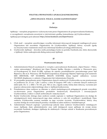 I POLITYKA PRYWATNOŚCI APLIKACJI KONKURSOWEJ „OPEN FINANCE- POLICZ, ZANIM ZAINWESTUJESZ” §1 Definicje: Aplikacja – narzędzie programowe wykorzystywane przez Organizatora do przeprowadzenia Konkursu, w szczególności: zarządzania zawartymi w niej treściami, grafiką, komunikacją z jej Użytkownikami. Aplikacja jest dostępna pod adresem https://www.facebook.com/OpenFinance 1. 2. Click mail – narzędzie umożliwiające wysyłkę informacji dotyczących kampanii mailingowych przez Organizatora lub newsletter Organizatora do Użytkowników Aplikacji, którzy wyrazili zgodę na otrzymywanie wiadomości email oraz informacji handlowych drogą elektroniczną. Użytkownik Aplikacji – dowolna osoba posiadająca konto na portalu Facebook.com, która skorzystała z Aplikacji i która zaakceptowała dialog autoryzacji Aplikacji. §2 Przetwarzanie danych: 1. 2. 3. 4. 5. Administratorem Danych uzyskanych w związku z prowadzonym Konkursem „Open Finance – Policz, zanim zainwestujesz” (Konkurs) jest Open Finance Spółka Akcyjna z siedzibą w Warszawie przy ul. Przyokopowej 33, (kod: 01-208), wpisana do rejestru przedsiębiorców prowadzonego przez Sąd Rejonowy dla m.st. Warszawy XII Wydział Gospodarczy Krajowego Rejestru Sądowego pod numerem KRS 0000196186, NIP 5213280836, REGON 015672908, której kapitał zakładowy wynosi 542.500,00 zł(opłacony w całości), ( Organizator lub Administrator Danych). W przypadku gromadzenia przez Organizatora danych osobowych Użytkownika są one przetwarzane na podstawie art. 23 ust. 1 pkt 1 ustawy z dnia 29 sierpnia 1997 roku o ochronie danych osobowych (tekst jedn. Dz. U. z 2002 r. Nr 101, poz. 926 ze zm.). Zgoda osoby, której dane dotyczą, wyrażana jest poprzez odznaczenie odpowiedniego okna w Aplikacji konkursowej. Przedmiotowe dane osobowe są zbierane w celach marketingowych polegających przede wszystkim na oferowaniu przez Organizatora produktów kredytowych, finansowych i inwestycyjnych Użytkownikom, a także w celach archiwalnych i statystycznych. Każdy Użytkownik, którego dane osobowe zostały zapisane w Aplikacji Organizatora ma dostęp do udostępnionych treści stanowiących jego dane osobowe w celu ich weryfikacji i modyfikacji. Dane osobowe Użytkownika zostaną usunięte na jego wyraźne życzenie. Użytkowników, którzy chcą uzyskać dostęp do swoich danych prosimy o kontakt na adres mailowy: [email protected]. Administrator Danych zapisuje i przechowuje jedynie dane osobowe Użytkowników instalujących nasze Aplikacje, dane administratorów oraz osób dodających nasze aplikacje do swojej strony na portalu Facebook, dodające Aplikację do ulubionych i biorące udział w Konkursie prowadzonym przez Organizatora. §3 Korzystanie z Aplikacji: Korzystanie z Aplikacji wymaga wyrażenia zgody przez Użytkownika na dostęp Aplikacji do jego danych osobowych zawartych w serwisie Facbook.com w sekcjach: „podstawowe informacje o mnie” oraz „moje zdjęcia” (imię i nazwisko, fotografie, adres e-mail, link do profilu Użytkownika itp.), a w niektórych przypadkach również innych danych osobowych, na przekazanie których Użytkownik wyraził zgodę. W żadnym wypadku pozostałe Aplikacje Organizatora, inne niż wyżej wymieniona Aplikacja konkursowa nie będą używały danych osobowych Użytkownika, ani nie będą publikowały w jego imieniu żadnych informacji, jeśli Użytkownik nie wyraził na to uprzednio mailowej wyraźnej zgody. Aplikacja nie zbiera ani nie przechowuje żadnych danych wykraczających poza zakres informacji niezbędnych dla jej poprawnego funkcjonowania. §4. Cookies: W celu zindywidualizowania Aplikacji, możemy używać plików cookies (informacji zapisywanych przez serwer na komputerze Użytkownika, które serwer może odczytać przy każdorazowym połączeniu się z danego komputera). Cookies dostarczają danych statystycznych o ruchu Użytkowników i korzystaniu przez nich z poszczególnych stron serwisu. Użytkownik może w każdej chwili wyłączyć w swojej przeglądarce opcję przyjmowania cookies, co jednak może spowodować utrudnienia w korzystaniu z Aplikacji. Pliki cookies nie służą Organizatorowi do zbierania zindywidualizowanych informacji o Użytkowniku (takich jak: imię i nazwisko, płeć, dane kontaktowe itp.). Zindywidualizowane informacje o Użytkowniku nie są przez Organizatora gromadzone ani przechowywane, a służą jedynie wyświetleniu Użytkownikowi zindywidualizowanej zawartości Aplikacji. Aby dowiedzieć się jak wyłączyć pliki cookies w Twojej przeglądarce odwiedź ten link: http://click-apps.pl/apps/privacypolicy/clickcommunity-privacypolicy&termsofuse-pl.pdf §5 Logi serwera: Serwer Aplikacji zbiera informacje dotyczące korzystania z serwisu Facebook.com przez Użytkowników oraz ich adresów IP. Na ich podstawie Organizator jest w stanie oszacować wykorzystanie konkretnych elementów serwisu przez Użytkowników. Informacje te wykorzystywane są przez Organizatora tylko w celach technicznych, rozwijania produktu oraz do tworzenia statystyk. II. ZASADY KORZYSTANIA Z APLIKACJI KONKURSOWEJ „OPEN FINANCE – POLICZ, ZANIM ZAINWESTUJESZ” Organizator Konkursu oświadcza, iż twórcą i jedynym właścicielem praw do Aplikacji konkursowej „Open Finance – Policz, zanim zainwestujesz” jest: Click Community sp. z o.o. z siedzibą w Krakowie przy ul. Szlak 77/222, (kod: 31-153), wpisana do Krajowego Rejestru Sądowego przez Sąd Rejonowy dla Krakowa-Śródmieścia w Krakowie, XI Wydział Gospodarczy KRS, pod numerem KRS: 0000416255 (Twórca lub Click community). §1 Prawo do używania Aplikacji przysługuje osobom, które: 1. są użytkownikami Facebook.com zgodnie z § 4 ust. 2 Regulaminu Konkursu i polityką prywatności serwisu internetowego Facebook.com; 2. podały prawdziwe dane osobowe w procesie instalacji i udostępniania swoich danych w Aplikacji; 3. zezwoliły Open Finance Spółka Akcyjna z siedzibą w Warszawie przy ul. Przyokopowej 33