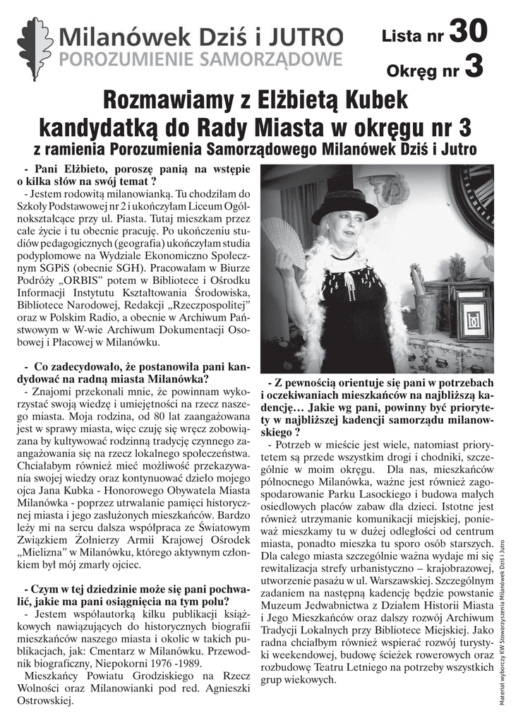 30 Okręg nr 3 Lista nr Rozmawiamy z Elżbietą Kubek kandydatką do Rady Miasta w okręgu nr 3 z ramienia Porozumienia Samorządowego Milanówek Dziś i Jutro - Co zadecydowało, że postanowiła pani kandydować na radną miasta Milanówka? - Znajomi przekonali mnie, że powinnam wykorzystać swoją wiedzę i umiejętności na rzecz naszego miasta. Moja rodzina, od 80 lat zaangażowana jest w sprawy miasta, więc czuję się wręcz zobowiązana by kultywować rodzinną tradycję czynnego zaangażowania się na rzecz lokalnego społeczeństwa. Chciałabym również mieć możliwość przekazywania swojej wiedzy oraz kontynuować dzieło mojego ojca Jana Kubka - Honorowego Obywatela Miasta Milanówka - poprzez utrwalanie pamięci historycznej miasta i jego zasłużonych mieszkańców. Bardzo leży mi na sercu dalsza współpraca ze Światowym Związkiem Żołnierzy Armii Krajowej Ośrodek „Mielizna” w Milanówku, którego aktywnym członkiem był mój zmarły ojciec. - Czym w tej dziedzinie może się pani pochwalić, jakie ma pani osiągnięcia na tym polu? - Jestem współautorką kilku publikacji książkowych nawiązujących do historycznych biografii mieszkańców naszego miasta i okolic w takich publikacjach, jak: Cmentarz w Milanówku. Przewodnik biograficzny, Niepokorni 1976 -1989. Mieszkańcy Powiatu Grodziskiego na Rzecz Wolności oraz Milanowianki pod red. Agnieszki Ostrowskiej. - Z pewnością orientuje się pani w potrzebach i oczekiwaniach mieszkańców na najbliższą kadencję… Jakie wg pani, powinny być priorytety w najbliższej kadencji samorządu milanowskiego ? - Potrzeb w mieście jest wiele, natomiast priorytetem są przede wszystkim drogi i chodniki, szczególnie w moim okręgu. Dla nas, mieszkańców północnego Milanówka, ważne jest również zagospodarowanie Parku Lasockiego i budowa małych osiedlowych placów zabaw dla dzieci. Istotne jest również utrzymanie komunikacji miejskiej, ponieważ mieszkamy tu w dużej odległości od centrum miasta, ponadto mieszka tu sporo osób starszych. Dla całego miasta szczególnie ważna wydaje mi się rewitalizacja strefy urbanistyczno – krajobrazowej, utworzenie pasażu w ul. Warszawskiej. Szczególnym zadaniem na następną kadencję będzie powstanie Muzeum Jedwabnictwa z Działem Historii Miasta i Jego Mieszkańców oraz dalszy rozwój Archiwum Tradycji Lokalnych przy Bibliotece Miejskiej. Jako radna chciałbym również wspierać rozwój turystyki weekendowej, budowę ścieżek rowerowych oraz rozbudowę Teatru Letniego na potrzeby wszystkich grup wiekowych. Materiał wyborczy KW Stowarzyszenia Milanówek Dziś i Jutro - Pani Elżbieto, poroszę panią na wstępie o kilka słów na swój temat ? - Jestem rodowitą milanowianką. Tu chodziłam do Szkoły Podstawowej nr 2 i ukończyłam Liceum Ogólnokształcące przy ul. Piasta. Tutaj mieszkam przez całe życie i tu obecnie pracuję. Po ukończeniu studiów pedagogicznych (geografia) ukończyłam studia podyplomowe na Wydziale Ekonomiczno Społecznym SGPiS (obecnie SGH). Pracowałam w Biurze Podróży „ORBIS” potem w Bibliotece i Ośrodku Informacji Instytutu Kształtowania Środowiska, Bibliotece Narodowej, Redakcji „Rzeczpospolitej” oraz w Polskim Radio, a obecnie w Archiwum Państwowym w W-wie Archiwum Dokumentacji Osobowej i Płacowej w Milanówku. - Jeśli zostanie pani wybrana to czym szczególnie chciałaby Pani się zająć? - Interesuje mnie rozwój turystyki weekendowej na terenie Milanówka. Chciałabym zorganizować Centrum Informacji Turystycznej z materiałami promocyjnymi o naszym mieście, publikacjami na temat naszego miasta, planami miasta i cmentarza, żeby można było każdej osobie przybyłej udzielić kompetentnej odpowiedzi dotyczącej Milanówka. Inne plany związane z moją pracą jako radnej - to prace związane z zachowaniem dziedzictwa historycznego i kulturowego Milanówka, a szczególnie - Jak pani ocenia dokonania ostatniej kaden- stworzenie zasobu i opracowanie zbiorów Muzeum Jedwabnictwa z Działem Historii Miasta jak i rozcji Rady? - Bez wątpienia zrobiono bardzo dużo, zważywszy wój Archiwum Tradycji Lokalnych przy Miejskiej że nasz budżet pozyskuje wpływy głównie z tzw. PIT Bibliotece Publicznej. -ów. Z całą pewnością to co było możliwe do zrobie- Dziękuję za rozmowę. nia przy obecnych możliwościach gminy miejskiej, zrealizowano. Wielkim osiągnięciem jest realizacja Jako notujący ten wywiad, pragnę dodać, że od sieci kanalizacyjnej na dużym obszarze miasta, tam gdzie to było możliwe drogi, chodniki – widzę to wielu lat znam panią Elżbietę, cenię jej kwalifikana przykładzie mojego okręgu (Gospodarska, Le- cje i zaangażowanie w sprawy miasta. Samorząd śny Ślad) i w innych częściach miasta. Pozytywnie milanowski potrzebuje dobrej kontynuacji nie tyloceniam powstanie nowych marketów handlowych ko w osobie burmistrza, który spełnia oczekiwania co ułatwia życie mieszkańcom, gdyż nie musimy już mieszkańców, ale i w gronie radnych. Pragnę więc gorąco zarekomendować zarówno ponowny wybór jeździć na tańsze zakupy do Grodziska. Jerzego Wysockiego na burmistrza, jak i kandydaturę Elżbiety Kubek. Andrzej Pettyn - Kandyduje pani z ramienia Porozumienia Samorządowego Milanówek Dziś i Jutro. Co skłoniło panią do kandydowania na radnego z tej listy? - Od lat obserwuję pracę tego ugrupowania. Cenię sobie siłę spokoju i konsekwencję działania reprezentowaną przez lidera ugrupowania Jerzego Wysockiego i innych osób z nim współpracujących, ten widoczny w mieście dorobek. Ponadto od pewnego już czasu angażuję się we wspólne działania z tym ugrupowaniem.