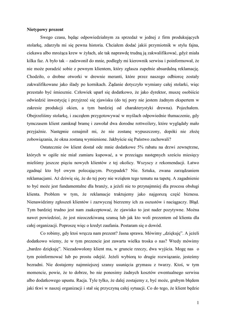 Nietypowy prezent Swego czasu, będąc odpowiedzialnym za sprzedaŜ w jednej z firm produkujących stolarkę, zdarzyła mi się pewna historia. Chciałem dodać jakiś przymiotnik w stylu fajna, ciekawa albo mroŜąca krew w Ŝyłach, ale tak naprawdę trudną ją zakwalifikować, gdyŜ miała kilka faz. A było tak – zadzwonił do mnie, podległy mi kierownik serwisu i poinformował, Ŝe nie moŜe poradzić sobie z pewnym klientem, który zgłasza zupełnie absurdalną reklamację. Chodziło, o drobne otworki w drewnie meranti, które przez naszego odbiorcę zostały zakwalifikowane jako ślady po kornikach. śądanie dotyczyło wymiany całej stolarki, więc przestało być śmiesznie. Człowiek uparł się dodatkowo, Ŝe jako dyrektor, muszę osobiście odwiedzić inwestycję i przyjrzeć się zjawisku (do tej pory nie jestem Ŝadnym ekspertem w zakresie produkcji okien, a tym bardziej od charakterystyki drewna). Pojechałem. Obejrzeliśmy stolarkę, i zacząłem przygotowywać w myślach odpowiednie tłumaczenie, gdy tymczasem klient zamknął bramę i zawołał dwa dorodne rottweilery, które wyglądały mało przyjaźnie. Następnie oznajmił mi, Ŝe nie zostanę wypuszczony, dopóki nie złoŜę zobowiązania, Ŝe okna zostaną wymienione. Jakbyście się Państwo zachowali? Ostatecznie ów klient dostał ode mnie dodatkowe 5% rabatu na drzwi zewnętrzne, których w ogóle nie miał zamiaru kupować, a w przeciągu następnych sześciu miesięcy mieliśmy jeszcze pięciu nowych klientów z tej okolicy. Wszyscy z rekomendacji. Łatwo zgadnąć kto był owym polecającym. Przypadek? Nie. Sztuka, zwana zarządzaniem reklamacjami. AŜ dziwię się, Ŝe do tej pory nie wziąłem tego tematu na tapetę. A zagadnienie to być moŜe jest fundamentalne dla branŜy, a jeŜeli nie to przynajmniej dla procesu obsługi klienta. Problem w tym, Ŝe reklamacje traktujemy jako najgorszą część biznesu. Nienawidzimy zgłoszeń klientów i zazwyczaj bierzemy ich za oszustów i naciągaczy. Błąd. Tym bardziej trudno jest nam zaakceptować, Ŝe zjawisko to jest nader pozytywne. MoŜna nawet powiedzieć, Ŝe jest nieoczekiwaną szansą lub jak kto woli prezentem od klienta dla całej organizacji. Poproszę więc o kredyt zaufania. Postaram się o dowód. Co robimy, gdy ktoś wręcza nam prezent? Jasna sprawa. Mówimy „dziękuję”. A jeŜeli dodatkowo wiemy, Ŝe w tym prezencie jest zawarta wielka troska o nas? Wtedy mówimy „bardzo dziękuję”. Niezadowolony klient ma, w gruncie rzeczy, dwa wyjścia. Mogę nas o tym poinformować lub po prostu odejść. JeŜeli wybiorą to drugie rozwiązanie, jesteśmy bezradni. Nie dostajemy najmniejszej szansy usunięcia grymasu z twarzy. Ktoś, w tym momencie, powie, Ŝe to dobrze, bo nie ponosimy Ŝadnych kosztów ewentualnego serwisu albo dodatkowego upustu. Racja. Tyle tylko, Ŝe dalej zostajemy z, być moŜe, grubym błędem jaki tkwi w naszej organizacji i stał się przyczyną całej sytuacji. Co do tego, Ŝe klient będzie 1 nam permanentnie psuł opinię w swoim środowisku, nawet nie ma sensu wspominać. Utracone korzyści mogą być tak duŜe, Ŝe lepiej się nad tym nie zastanawiać. Przynajmniej podczas czytania tego felietonu. Klient składający reklamację nadal z nami rozmawia, a to juŜ wielka róŜnica. Daje nam teŜ sposobność przywrócenia zadowolenia, dzięki czemu wzrasta prawdopodobieństwo, Ŝe wyrazić o nas, mimo wszystko, pozytywne zdanie. Jest więc naszym kumplem. Wróg na pewno by nas pogrąŜył przy pierwszej okazji. JeŜeli zmienimy nasz punkt widzenia i zaczniemy traktować reklamacje jak prezenty, to będziemy mogli łatwiej wykorzystać informacje w nich zawarte, co prowadzi do rozwoju firmy. Ten rodzaj informacji pochodzi ze zdecydowanie najłatwiej dostępnego źródła i jest jednocześnie najrzadziej wykorzystywanym. Zupełnie jakby branŜa stolarki otworowej cierpiała na nadmiar wiedzy o klientach i rynku. Do tego dochodzi czynnik, który moŜna określić jako dowód koronny na potwierdzenie moich słów. W jaki sposób chcemy doprowadzić do sytuacji, Ŝe konsumenci zaczną polecać nasze produkty? Niby oczywiste, a jednak. Czy wystarczy, Ŝe dostarczymy klientowi poprawny produkt, w umówionym czasie, według spisanej charakterystyki i zamontujemy według powszechnych prawideł? Zastanówmy się. PrzecieŜ właśnie takie były oczekiwania! Nikt przy zdrowych zmysłach nie marzy o problemie związanym z zakupem. Nie ma więc powodów, aby wygłaszać peany na naszą cześć. Reklamacja jest wydarzeniem wykraczającym poza standardową percepcję. Co więcej, większość z nas z góry zakłada, Ŝe jako klienci nie moŜemy spodziewać się zbyt wiele ze strony dostawcy produktu czy usługi. Odpowiednio zrealizowana reklamacja staje się niezwykle miłym zaskoczeniem, a to juŜ powód, aby się podzielić własnym szczęściem ze znajomymi. Warto się nad tym zastanowić, bo to pierwszy krok ku nowej jakości działania. Mówiąc najprościej, reklamacja to wyraŜenie oczekiwań, które nie zostały spełnione. Od razu więc pojawia się przed przedsiębiorstwem szansa usatysfakcjonowania odbiorcy poprzez załatwienie sprawy wadliwej usługi lub wyrobu. Tym samym reklamacja jest prezentem, który klient wręcza firmie. Korzyść dla przedsiębiorstwa pojawi się wtedy, gdy ostroŜnie otworzymy tę paczuszkę i przyjrzymy się co jest w środku. Tyle i aŜ tyle. Na zakończenie procesu dowodzenia racji przytoczę dwie liczby: badania wykazują, Ŝe przeszło 90% niezadowolonych klientów nie składa reklamacji, ale teŜ przestaje być klientem firmy, Natomiast jeŜeli reklamacje klientów, którzy zgłosili reklamacje są załatwione pozytywnie, zdecydowana ich większość (ponad 70%) pozostaje lojalnymi klientami firmy. Starczy. Przechodząc do wskazówek związanych z zarządzaniem skargami, od razu naleŜy powiedzieć, Ŝe nawet jeŜeli moja argumentacja trafiła do Państwa, w Ŝadnym wypadku nie ozna