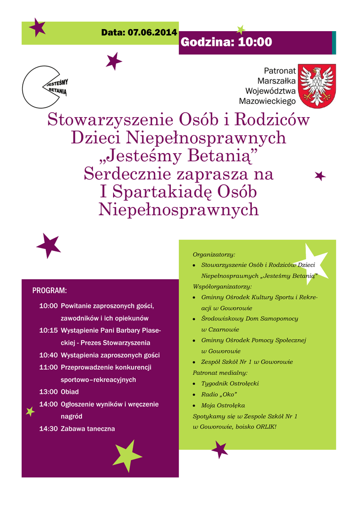 Data: 07.06.2014 Godzina: 10:00 Patronat Marszałka Województwa Mazowieckiego Stowarzyszenie Osób i Rodziców Dzieci Niepełnosprawnych „Jesteśmy Betanią” Serdecznie zaprasza na I Spartakiadę Osób Niepełnosprawnych Organizatorzy: Stowarzyszenie Osób i Rodziców Dzieci Niepełnosprawnych „Jesteśmy Betanią” PROGRAM: 10:00 Powitanie zaproszonych gości, zawodników i ich opiekunów 10:15 Wystąpienie Pani Barbary Piaseckiej - Prezes Stowarzyszenia 10:40 Wystąpienia zaproszonych gości 11:00 Przeprowadzenie konkurencji sportowo–rekreacyjnych Współorganizatorzy: Gminny Ośrodek Kultury Sportu i Rekreacji w Goworowie Środowiskowy Dom Samopomocy w Czarnowie Gminny Ośrodek Pomocy Społecznej w Goworowie Zespół Szkół Nr 1 w Goworowie Patronat medialny: Tygodnik Ostrołęcki 13:00 Obiad Radio „Oko” 14:00 Ogłoszenie wyników i wręczenie Moja Ostrołęka nagród 14:30 Zabawa taneczna Spotykamy się w Zespole Szkół Nr 1 w Goworowie, boisko ORLIK!