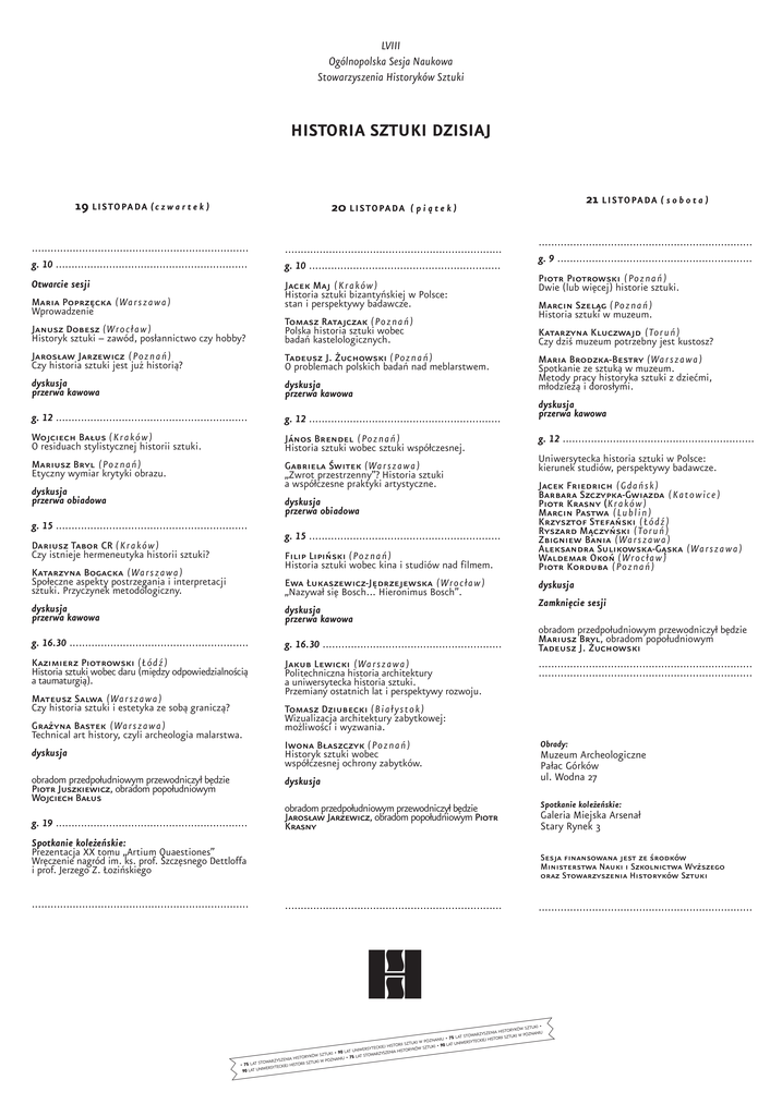 LVIII Ogólnopolska Sesja Naukowa Stowarzyszenia Historyków Sztuki HISTORIA SZTUKI DZISIAJ 19 L I S TO PA DA (c z w a r t e k ) ..................................................................... g. 10 ............................................................. Otwarcie sesji Maria Poprzęcka (Warszawa) Wprowadzenie 20 L I S TO PA DA (piątek) ..................................................................... g. 10 ............................................................. Jacek Maj ( K r a k ó w ) Historia sztuki bizantyńskiej w Polsce: stan i perspektywy badawcze. Janusz Dobesz (Wrocław) Historyk sztuki – zawód, posłannictwo czy hobby? Tomasz Ratajczak ( P o z n ań ) Polska historia sztuki wobec badań kastelologicznych. Jarosław Jarzewicz (Poznań) Czy historia sztuki jest już historią? Tadeusz J. Żuchowski ( P o z n a ń ) O problemach polskich badań nad meblarstwem. dyskusja przerwa kawowa dyskusja przerwa kawowa g. 12 ............................................................. g. 12 ............................................................. Wojciech Bałus (Kraków) O residuach stylistycznej historii sztuki. János Brendel ( P o z n a ń ) Historia sztuki wobec sztuki współczesnej. Mariusz Bryl (Poznań) Etyczny wymiar krytyki obrazu. dyskusja przerwa obiadowa g. 15 ............................................................. Dariusz Tabor CR (Kraków) Czy istnieje hermeneutyka historii sztuki? Katarzyna Bogacka (Warszawa) Społeczne aspekty postrzegania i interpretacji sztuki. Przyczynek metodologiczny. dyskusja przerwa kawowa Gabriela Świtek (Wa r s z a w a ) „Zwrot przestrzenny”? Historia sztuki a współczesne praktyki artystyczne. dyskusja przerwa obiadowa g. 15 ............................................................. Filip Lipiński ( P o z n a ń ) Historia sztuki wobec kina i studiów nad filmem. Ewa Łukaszewicz-Jędrzejewska (Wr o c ł a w ) „Nazywał się Bosch... Hieronimus Bosch”. dyskusja przerwa kawowa g. 16.30 ......................................................... g. 16.30 ......................................................... Kazimierz Piotrowski (Łódź) Historia sztuki wobec daru (między odpowiedzialnością a taumaturgią). Jakub Lewicki (Wa r s z a w a ) Politechniczna historia architektury a uniwersytecka historia sztuki. Przemiany ostatnich lat i perspektywy rozwoju. Mateusz Salwa (Warszawa) Czy historia sztuki i estetyka ze sobą graniczą? Grażyna Bastek (Warszawa) Technical art history, czyli archeologia malarstwa. dyskusja obradom przedpołudniowym przewodniczył będzie Piotr Juszkiewicz, obradom popołudniowym Wojciech Bałus g. 19 ............................................................. .................................................................... g. 9 .............................................................. Piotr Piotrowski ( P o z n a ń ) Dwie (lub więcej) historie sztuki. Marcin Szeląg ( P o z n a ń ) Historia sztuki w muzeum. Katarzyna Kluczwajd ( Tor u ń ) Czy dziś muzeum potrzebny jest kustosz? Maria Brodzka-Bestry (Wa r s z a w a ) Spotkanie ze sztuką w muzeum. Metody pracy historyka sztuki z dziećmi, młodzieżą i dorosłymi. dyskusja przerwa kawowa g. 12 ............................................................. Uniwersytecka historia sztuki w Polsce: kierunek studiów, perspektywy badawcze. Jacek Friedrich ( G d a ń s k ) Barbara Szczypka-Gwiazda ( K a t o w i c e ) Piotr Krasny (K r a k ó w ) Marcin Pastwa ( L u b l i n ) Krzysztof Stefański ( Ł ó d ź ) Ryszard Mączyński ( Tor u ń ) Zbigniew Bania (Wa r s z a w a ) Aleksandra Sulikowska-Gąska (Wa r s z a w a ) Waldemar Okoń (Wr o c ł a w ) Piotr Korduba ( P o z n a ń ) dyskusja Zamknięcie sesji obradom przedpołudniowym przewodniczył będzie Mariusz Bryl, obradom popołudniowym Tadeusz J. Żuchowski .................................................................... .................................................................... Tomasz Dziubecki ( B i a ł y s t o k ) Wizualizacja architektury zabytkowej: możliwości i wyzwania. Iwona Błaszczyk ( P o z n a ń ) Historyk sztuki wobec współczesnej ochrony zabytków. dyskusja obradom przedpołudniowym przewodniczył będzie Jarosław Jarzewicz, obradom popołudniowym Piotr Krasny Spotkanie koleżeńskie: Prezentacja XX tomu „Artium Quaestiones” Wręczenie nagród im. ks. prof. Szczęsnego Dettloffa i prof. Jerzego Z. Łozińskiego ..................................................................... 21 LISTOPADA ( s o b o t a ) Obrady: Muzeum Archeologiczne Pałac Górków ul. Wodna 27 Spotkanie koleżeńskie: Galeria Miejska Arsenał Stary Rynek 3 Sesja finansowana jest ze środków Ministerstwa Nauki i Szkolnictwa Wyższego oraz Stowarzyszenia Historyków Sztuki ..................................................................... ....................................................................