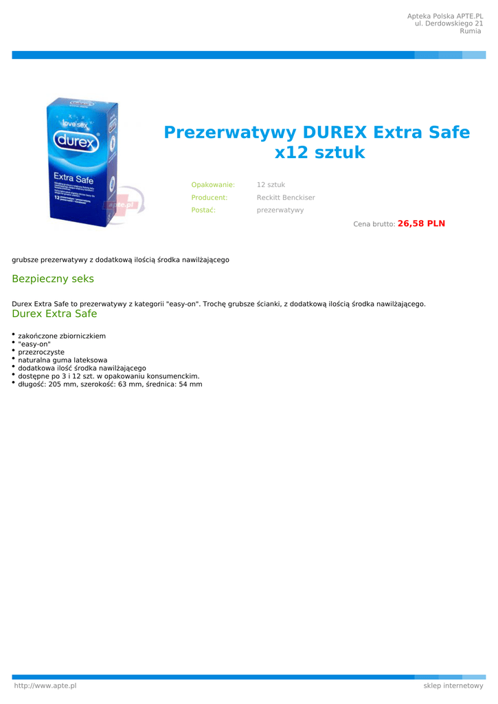 Apteka Polska APTE.PL ul. Derdowskiego 21 Rumia Prezerwatywy DUREX Extra Safe x12 sztuk Opakowanie: 12 sztuk Producent: Reckitt Benckiser Postać: prezerwatywy Cena brutto: 26,58 PLN grubsze prezerwatywy z dodatkową ilością środka nawilżającego Bezpieczny seks Durex Extra Safe to prezerwatywy z kategorii "easy-on". Trochę grubsze ścianki, z dodatkową ilością środka nawilżającego. Durex Extra Safe zakończone zbiorniczkiem "easy-on" przezroczyste naturalna guma lateksowa dodatkowa ilość środka nawilżającego dostępne po 3 i 12 szt. w opakowaniu konsumenckim. długość: 205 mm, szerokość: 63 mm, średnica: 54 mm http://www.apte.pl sklep internetowy