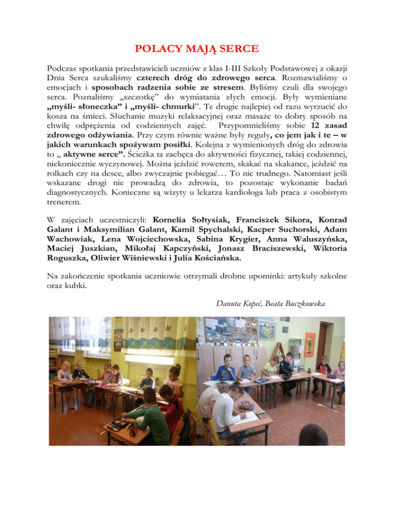 POLACY MAJĄ SERCE Podczas spotkania przedstawicieli uczniów z klas I-III Szkoły Podstawowej z okazji Dnia Serca szukaliśmy czterech dróg do zdrowego serca. Rozmawialiśmy o emocjach i sposobach radzenia sobie ze stresem. Byliśmy czuli dla swojego serca. Poznaliśmy „szczotkę” do wymiatania złych emocji. Były wymieniane „myśli- słoneczka” i „myśli- chmurki”. Te drugie najlepiej od razu wyrzucić do kosza na śmieci. Słuchanie muzyki relaksacyjnej oraz masaże to dobry sposób na chwilę odprężenia od codziennych zajęć. Przypomnieliśmy sobie 12 zasad zdrowego odżywiania. Przy czym równie ważne były reguły, co jem jak i te – w jakich warunkach spożywam posiłki. Kolejna z wymienionych dróg do zdrowia to „ aktywne serce”. Ścieżka ta zachęca do aktywności fizycznej, takiej codziennej, niekoniecznie wyczynowej. Można jeździć rowerem, skakać na skakance, jeździć na rolkach czy na desce, albo zwyczajnie pobiegać… To nic trudnego. Natomiast jeśli wskazane drogi nie prowadzą do zdrowia, to pozostaje wykonanie badań diagnostycznych. Konieczne są wizyty u lekarza kardiologa lub praca z osobistym trenerem. W zajęciach uczestniczyli: Kornelia Sołtysiak, Franciszek Sikora, Konrad Galant i Maksymilian Galant, Kamil Spychalski, Kacper Suchorski, Adam Wachowiak, Lena Wojciechowska, Sabina Krygier, Anna Waluszyńska, Maciej Juszkian, Mikołaj Kapczyński, Jonasz Braciszewski, Wiktoria Roguszka, Oliwier Wiśniewski i Julia Kościańska. Na zakończenie spotkania uczniowie otrzymali drobne upominki: artykuły szkolne oraz kubki. Danuta Kopeć, Beata Buczkowska