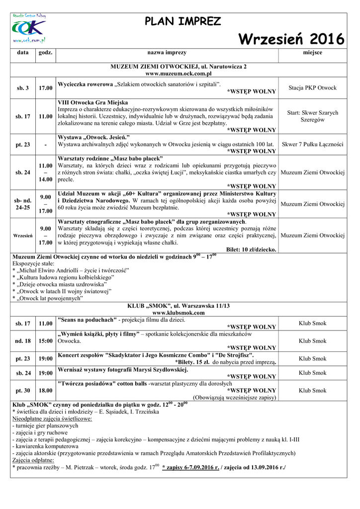 PLAN IMPREZ data godz. nazwa imprezy Wrzesień 2016 miejsce MUZEUM ZIEMI OTWOCKIEJ, ul. Narutowicza 2 www.muzeum.ock.com.pl sb. 3 17.00 Wycieczka rowerowa „Szlakiem otwockich sanatoriów i szpitali”. *WSTĘP WOLNY Stacja PKP Otwock VIII Otwocka Gra Miejska Impreza o charakterze edukacyjno-rozrywkowym skierowana do wszystkich miłośników Start: Skwer Szarych sb. 17 11.00 lokalnej historii. Uczestnicy, indywidualnie lub w drużynach, rozwiązywać będą zadania Szeregów zlokalizowane na terenie całego miasta. Udział w Grze jest bezpłatny. *WSTĘP WOLNY Wystawa „Otwock. Jesień.” Wystawa archiwalnych zdjęć wykonanych w Otwocku jesienią w ciągu ostatnich 100 lat. Skwer 7 Pułku Łączności pt. 23 *WSTĘP WOLNY Warsztaty rodzinne „Masz babo placek” 11.00 Warsztaty, na których dzieci wraz z rodzicami lub opiekunami przygotują pieczywo z różnych stron świata: chałki, „oczka świętej Łucji”, meksykańskie ciastka umarłych czy Muzeum Ziemi Otwockiej sb. 24 – 14.00 precle. *WSTĘP WOLNY Udział Muzeum w akcji „60+ Kultura” organizowanej przez Ministerstwo Kultury 9.00 i Dziedzictwa Narodowego. W ramach tej ogólnopolskiej akcji każda osoba powyżej sb- nd. Muzeum Ziemi Otwockiej – 60 roku życia może zwiedzić Muzeum bezpłatnie. 24-25 17.00 *WSTĘP WOLNY Warsztaty etnograficzne „Masz babo placek” dla grup zorganizowanych. 9.00 Warsztaty składają się z części teoretycznej, podczas której uczestnicy poznają różne Wrzesień rodzaje pieczywa obrzędowego i zwyczaje z nim związane oraz części praktycznej, Muzeum Ziemi Otwockiej – 17.00 w której przygotowują i wypiekają własne chałki. Bilet: 10 zł/dziecko. Muzeum Ziemi Otwockiej czynne od wtorku do niedzieli w godzinach 900 – 1700 Ekspozycje stałe: * „Michał Elwiro Andriolli – życie i twórczość” * „Kultura ludowa regionu kołbielskiego” * „Dzieje otwocka miasta uzdrowiska” * „Otwock w latach II wojny światowej” * „Otwock lat powojennych” KLUB „SMOK”, ul. Warszawska 11/13 www.klubsmok.com "Seans na poduchach" - projekcja filmu dla dzieci. Klub Smok sb. 17 11.00 *WSTĘP WOLNY „Wymień książki, płyty i filmy” – spotkanie kolekcjonerskie dla mieszkańców Klub Smok nd. 18 15:00 Otwocka. *WSTĘP WOLNY Koncert zespołów "Skadyktator i Jego Kosmiczne Combo" i "De Strojfisz". Klub Smok pt. 23 19:00 *Bilety. 15 zł. do nabycia przed imprezą. Wernisaż wystawy fotografii Marysi Szydłowskiej. Klub Smok sb. 24 19:00 *WSTĘP WOLNY "Twórcza posiadówa" cotton balls -warsztat plastyczny dla dorosłych Klub Smok pt. 30 18.00 *WSTĘP WOLNY (Obowiązują wcześniejsze zapisy) Klub „SMOK” czynny od poniedziałku do piątku w godz. 1200 - 2000 * świetlica dla dzieci i młodzieży – E. Sąsiadek, I. Trzcińska Nieodpłatne zajęcia świetlicowe: - turnieje gier planszowych - zajęcia i gry ruchowe - zajęcia z terapii pedagogicznej – zajęcia korekcyjno – kompensacyjne z dziećmi mającymi problemy z nauką kl. I-III - kawiarenka komputerowa - zajęcia aktorskie (przygotowanie przedstawienia w ramach Przeglądu Amatorskich Przedstawień Profilaktycznych) Zajęcia odpłatne: * pracownia rzeźby – M. Pietrzak – wtorek, środa godz. 1700 * zapisy 6-7.09.2016 r. / zajęcia od 13.09.2016 r./ KLUB „MLĄDZ”, ul. Majowa 202 www.klubmladz.ock.com.pl 19.00 Pożegnanie lata – impreza plenerowa z Zespołem „Fernando” *WSTĘP WOLNY 23.00 KLUB „MLĄDZ” czynny od poniedziałku do piątku w godz. 1200 -2000 *Świetlica dla dzieci i młodzieży – instruktor M.Malesa - pon-piątek- godz. 12.00-17.00 *Sekcja wikliniarska – instruktor T.Sokolik – poniedziałek, wtorek, środa godz.16.00-20.00 *Zespół Śpiewaczy Mlądz – instruktor G.Powałka – wtorek godz. 17.00 *Plastyka dla dzieci – instruktor I.Trzcińska – wtorek godz.17.00 *Teatrzyk „Jaskółeczka” – instruktor M.Malesa - piątek godz. 17.00 *Warsztaty kreatywności dla najmłodszych – instruktor Madgalena Duraj-Kwas poniedziałek I grupa- godz.16.00 poniedziałek II grupa – godz.17.45 IMPRESARIAT www.impresariat.ock.com.pl Plenerowe "Spotkanie z astronomią" Spotkania warsztatowe z wykorzystaniem ciekawych urządzeń tj. teleskop, globus nieba z mini planetarium, materiałów plastycznych (wykonanie fragmentów lokalnej mapy nieba w różnych grupach wiekowych - wystawa, możliwa publikacja ) oraz zajęcia w plenerze (z ogniskiem) prowadzone przez lokalnego astronoma amatora pana sb. 3 20.00 Ryszarda Łuszczykiewicza. pt. 16 Warsztaty są elementem projektu „Kulturalne ruszenie w Otwocku" w ramach Programu Narodowego Centrum Kultury- Dom Kultury + Inicjatywy lokalne 2016. cz. - pt. 1-16 - *WSTĘP WOLNY Zgłoszenia do projektu: Małgorzata Szczepanik, e-mail: [email protected] , tel. 503 531 084 Zapisy na warsztaty „Kowalstwo za miedzą” Jeżeli masz zdolności artystyczne i poważnie myślisz o związaniu swojej przyszłości ze sztuką, jeżeli planujesz studia plastyczne lub artystyczne – to projekt właśnie dla Ciebie! „Kowalstwo za miedzą” to niepowtarzalna okazja, aby pod okiem prawdziwego mistrza w swojej dziedzinie, Adama Gosa, poznać tajniki tradycyjnego kowalstwa artystycznego i stworzyć własne, wyjątkowe przedmioty z kutego metalu. Warsztaty: każda sobota, poczynając od 17 września, w godz. 9.00 – 14.00. Warsztaty są elementem projektu „Kulturalne ruszenie w Otwocku" w ramach Programu Narodowego Centrum Kultury- Dom Kultury + Inicjatywy lokalne 2016. sb. 3,10,17 cz.-pt 1-2 cz. 15 *WSTĘP WOLNY Zgłoszenia do projektu: Piotr Kostrzewa, tel.: 507-500-411 "Świderska milonga" otwarte warsztaty taneczne. Serdecznie zapraszamy na nauki tanga, walca i rumby. Liczba miejsc jest ograniczona, więc rusz do nas. Zajęcia poprowadzą wielokrotnie nagradzani na międzynarodowych 16:00 turniejach tancerze Joanna i Dariusz Popławscy. 19:00 Warsztaty są elementem projektu „Kulturalne ruszenie w Otwocku" w ramach Programu Narodowego Centrum K