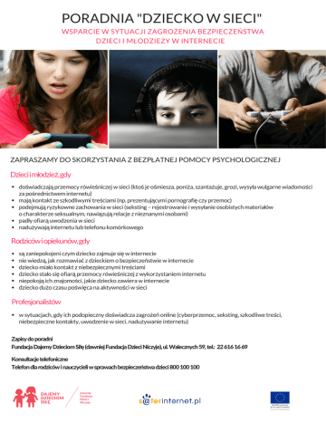 PORADNIA "DZIECKO W SIECI" WSPARCIE W SYTUACJI ZAGROŻENIA BEZPIECZEŃSTWA DZIECI I MŁODZIEŻY W INTERNECIE ZAPRASZAMY DO SKORZYSTANIA Z BEZPŁATNEJ POMOCY PSYCHOLOGICZNEJ Dzieci i młodzież, gdy doświadczają przemocy rówieśniczej w sieci (ktoś je ośmiesza, poniża, szantażuje, grozi, wysyła wulgarne wiadomości za pośrednictwem internetu) mają kontakt ze szkodliwymi treściami (np. prezentującymi pornografię czy przemoc) podejmują ryzykowne zachowania w sieci (seksting – rejestrowanie i wysyłanie osobistych materiałów o charakterze seksualnym, nawiązują relacje z nieznanymi osobami) padły ofiarą uwodzenia w sieci nadużywają internetu lub telefonu komórkowego Rodziców i opiekunów, gdy są zaniepokojeni czym dziecko zajmuje się w internecie nie wiedzą, jak rozmawiać z dzieckiem o bezpieczeństwie w internecie dziecko miało kontakt z niebezpiecznymi treściami dziecko stało się ofiarą przemocy rówieśniczej z wykorzystaniem internetu niepokoją ich znajomości, jakie dziecko zawiera w internecie dziecko dużo czasu poświęca na aktywności w sieci Profesjonalistów w sytuacjach, gdy ich podopieczny doświadcza zagrożeń online (cyberprzemoc, seksting, szkodliwe treści, niebezpieczne kontakty, uwodzenie w sieci, nadużywanie internetu) Zapisy do poradni Fundacja Dajemy Dzieciom Siłę (dawniej Fundacja Dzieci Niczyje), ul. Walecznych 59, tel.: 22 616 16 69 Konsultacje telefoniczne Telefon dla rodziców i nauczycieli w sprawach bezpieczeństwa dzieci 800 100 100