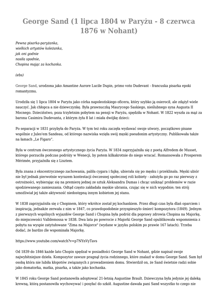 George Sand (1 lipca 1804 w Paryżu - 8 czerwca 1876 w Nohant) Pewna pisarka-paryżanka, wielkich artystów koleżanka, jak oni godnie nosiła spodnie, Chopina mając za kochanka. (ebs) George Sand, urodzona jako Amantine Aurore Lucile Dupin, primo voto Dudevant - francuska pisarka epoki romantyzmu. Urodziła się 1 lipca 1804 w Paryżu jako córka napoleońskiego oficera, który szybko ją osierocił, ale zdążył wiele nauczyć. Jak chłopca a nie dziewczynkę. Była prawnuczką Maurycego Saskiego, nieślubnego syna Augusta II Mocnego. Dzieciństwo, poza trzyletnim pobytem na pensji w Paryżu, spędziła w Nohant. W 1822 wyszła za mąż za barona Casimira Dudevanta, z którym żyła 8 lat i miała dwójkę dzieci: Po separacji w 1831 przybyła do Paryża. W tym też roku zaczęła wydawać swoje utwory, początkowo pisane wspólnie z Jules'em Sandeau, od którego nazwiska wzięła swój męski pseudonim artystyczny. Publikowała także na łamach „Le Figaro”. Była w centrum ówczesnego artystycznego życia Paryża. W 1834 zaprzyjaźniła się z poetą Alfredem de Musset, którego porzuciła podczas podróży w Wenecji, by potem kilkakrotnie do niego wracać. Romansowała z Prosperem Mérimée, przyjaźniła się z Lisztem. Była znana z ekscentrycznego zachowania, paliła cygara i fajkę, ubierała się po męsku i przeklinała. Męski ubiór nie był jednak pierwotnie wyrazem kontestacji ówczesnej społecznej roli kobiety - założyła go po raz pierwszy z ostrożności, wybierając się na premierę jednej ze sztuk Aleksandra Dumas i chcąc uniknąć problemów w razie spodziewanego zamieszania. Odtąd często zakładała męskie ubrania, czując się w nich wygodnie; ten strój umożliwiał jej także aktywność niedostępną innym kobietom jej stanu. W 1838 zaprzyjaźniła się z Chopinem, który wkrótce został jej kochankiem. Przez długi czas była dlań oparciem i inspiracją, jednakże zerwała z nim w 1847, co prawdopodobnie przyspieszyło śmierć kompozytora (1849). Jednym z pierwszych wspólnych wyjazdów George Sand i Chopina była podróż dla poprawy zdrowia Chopina na Majorkę, do miejscowości Valldemossa w 1838. Dwa lata po powrocie z Majorki George Sand opublikowała wspomnienia z pobytu na wyspie zatytułowane "Zima na Majorce" (wydane w języku polskim po prawie 167 latach). Trzeba dodać, że bardzo źle wspominała Majorkę. https://www.youtube.com/watch?v=p7NYnVyTavs Od 1839 do 1846 każde lato Chopin spędzał w posiadłości George Sand w Nohant, gdzie napisał swoje najwybitniejsze dzieła. Kompozytor zawsze pragnął życia rodzinnego, które znalazł w domu George Sand. Sam był osobą która nie lubiła kłopotów związanych z prowadzeniem domu. Stwierdził on, że Sand świetnie radzi sobie jako domatorka, matka, pisarka, a także jako kochanka. W 1845 roku George Sand postanowiła adoptować 21-letnią Augustine Brault. Dziewczyna była jedynie jej daleką krewną, którą postanowiła wychowywać i posyłać do szkół. Augustine dawała pani Sand wszystko to czego nie dostała od własnej córki, jednak dziewczyna stała się kozłem ofiarnym rodzinnych niesnasek, szczególnie podczas feralnego lata 1847 roku. Para rozeszła się głównie z powodu kłopotów rodzinnych związanych z trudami wychowania dorastających dzieci Sand. Chopin był niejako członkiem tej przybranej rodziny, którą stworzył godząc się na wspólne życie pod jednym dachem ze swą kochanką i jej wychowankami. Dorastające dzieci nie akceptowały dziwnego układu między Chopinem a ich matką. Zdawały sobie sprawę z tego, że Chopin może cieszyć się przywilejami głowy domu, nie będąc formalnie mężem ich matki. https://www.youtube.com/watch?v=NvGYFazBYyE W okresie rozstania z Chopinem, George Sand przeżyła wiele rozczarowań osobistych. Były one związane z pogorszeniem się stosunków z Solange, porażkami politycznymi, utratą sympatii wielu dotychczasowych przyjaciół. Rozstanie z Chopinem było dla pisarki wielkim ciosem osobistym. Pisała i publikowała prawie do samej śmierci. Jednymi z jej ostatnich utworów były napisane dla wnuków baśnie "Contes d’une grandmère". Wykształcenie Sand opierało się przede wszystkim na samodzielnie dobieranych, dość przypadkowych lekturach; z tego też powodu w swoich utworach kopiowała raczej cudze systemy ideologiczne niż starała się sformułować własne przesłanie, wzorem innych francuskich autorów romantycznych. Pisała przy tym z ogromną łatwością, publikując następnie utwory w wersji pierwotnej - nigdy nie wprowadzała poprawek redakcyjnych po zakończeniu pracy. W okresie II Cesarstwa, zawiedziona panującym ustrojem, Sand wycofała się z życia publicznego i opracowała dwa dzieła autobiograficzne, "Historię mojego życia" oraz "Ona i On". Kilkakrotnie próbowała, bez powodzenia, pisać dramaty. Wróciła wówczas do powieściopisarstwa, rezygnując z nadawania swoim dziełom jakiejkolwiek wymowy ideologicznej, pragnąc jedynie czynić je interesującymi dla czytelnika. Napisane w tym okresie (od końca lat 50.) powieści stoją na dobrym poziomie pod względem psychologii postaci, nie posiadają już jednak elementów nowatorskich na tle rozwoju literatury francuskiej. Zmarła 8 czerwca 1876 w Nohant. https://www.youtube.com/watch?v=WMo_ulk4bqk "Studiowanie literatury jest niczym innym jak studiowaniem ludzi."
