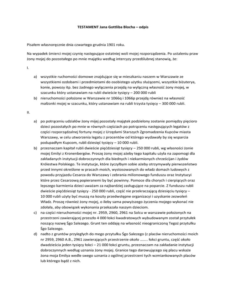 TESTAMENT Jana Gottliba Blocha – odpis Pisałem własnoręcznie dnia czwartego grudnia 1901 roku. Na wypadek śmierci mojej czynię następujące ostatniej woli mojej rozporządzenia. Po ustaleniu praw żony mojej do pozostałego po mnie majątku według intercyzy przedślubnej stanowią, że: I. a) wszystkie ruchomości domowe znajdujące się w mieszkaniu naszem w Warszawie ze wszystkiemi ozdobami i przedmiotami do osobistego użytku służącemi, wszystkie biżuterya, konie, powozy itp. bez żadnego wyłączenia przejdą na wyłączną własność żony mojej, w szacunku który ustanawiam na rubli dwieście tysięcy – 200 000 rubli b) nieruchomości położone w Warszawie nr 1066q i 1066p przejdą również na własność małżonki mojej w szacunku, który ustanawiam na rubli trzysta tysięcy – 300 000 rubli. II. a) po potrąceniu udziałów żony mijej pozostały majątek podzielony zostanie pomiędzy pięcioro dzieci pozostałych po mnie w równych częściach po potrąceniu następujących legatów z części rozporządzalnej fortuny mojej z Urzędami Starszych Zgromadzenia Kupców miasta Warszawy, w celu utworzenia legatu z procentów od którego wydawały by się wsparcia podupadłym Kupcom, rubli dziesięć tysięcy – 10 000 rubli. b) przeznaczam kapitał rubli dwieście pięćdziesiąt tysięcy – 250 000 rubli, wg własności żonie mojej Emilyi z Kronenbergów. Proszę żony mojej ażeby tego kapitału użyła na zapomogi dla zakładanych instytucji dobroczynnych dla biednych i niekarmionych chrześcijan i żydów Królestwa Polskiego. Te instytucje, które życzyłbym sobie ażeby otrzymywały pierwszeństwo przed innymi określone w pracach moich, wystosowanych do władz domach ludowych z powodu przyjazdu Cesarza do Warszawy i zebrania milionowego funduszu oraz Instytucyi które przez Cesarzową popieranemi by być powinny. Pomoce dla chorych i cierpiących oraz lepszego karmienia dzieci uważam za najbardziej zasługujące na poparcie. Z funduszu rubli dwieście pięćdziesiąt tysięcy - 250 000 rubli, część nie przekraczającą dziesięciu tysięcy – 10 000 rubli użyty być muszą na koszty przedwstępne organizacyi i uzyskanie zezwoleń Władz. Proszę również żony mojej, o ileby sama powyższego życzenia mojego wykonać nie zdołała, aby obowiązek wykonania przekazała naszym dzieciom. c) na części nieruchomości mojej nr. 2959, 2960, 2961 na Solcu w warszawie położonych na przestrzeni zawierającej przeszło 4 000 łokci kwadratowych wybudowanym został przytułek noszący nazwę Śgo Salezego. Grunt ten oddaję na własność nieograniczoną Tegoż przytułku Śgo Salezego. d) nadto z gruntów przyległych do mego przytułku Śgo Salezego (z placów nieruchomości moich nr 2959, 2960 A.B., 2961 zawierających przestrzenie około …….. łokci gruntu, część około dwadzieścia jeden tysięcy łokci – 21 000 łokci gruntu, przeznaczam na zakładanie instytucji dobroczynnych według uznania żony mojej. Granice tego darowującego się placu wskaże żona moja Emilya wedle swego uznania z ogólnej przestrzeni tych wzmiankowanych placów lub którego bądź z nich. e) w kasie Warszawskiego Towarzystwa Dobroczynności zdeponowanym jest na moje imię fundusz, pochodzący dochodów domu po Bernardyńskiego, w chwili obecnej około rubli sześćdziesiąt pięć tysięcy – 65 000 rubli wynoszący, zupełnie nie zapisany w księgach moich, jako specjalne naznaczenie mający a mianowicie dla wydawania pożyczek. Kończącym Zakłady wyższe naukowe Regulamin dotychczas przez Rząd zatwierdzonym nie został – Kapitał powyższy przeznaczam na własność żonie mojej. Proszę żony mojej ażeby fundusz ten przeznaczyła wedle wskazówek Regulaminu, a wrazie niemożliwości dołączyła takowy do Kapitału dwieście pięćdziesiąt tysięcy rubli – 250 000 rubli, o którym w punkcie II litery b) jest mowa. f) od Szkoły Politechnicznej w Warszawie przynależny mi fundusz za najem lokali za rok jeden przekazuję żonie mojej na własne potrzeby użycia takowego wedle Jej uznania dla dobra uczących w tejże Szkole Politechniki bez różnicy wyznań. III. Popłacone przezemnie długi za syna mojego i zięcia Weyssenhoffa, byłymi takiego w Księgach moich nie figurujące zwrotowi niepodlegają ponieważ takowe uważam za darowizny za życia mojego uczynione. IV. Podział majątku mojego będzie mógł nastąpić dopiero po upływie lat pięciu od daty mojego zgonu, a przez ten czas cały majątek ma pozostać w posiadaniu i pod zarządem żony mojej – żadne z dzieci moich przez czas niedpodzielności nie będzie mogło żądać wypłaty swojej schedy, poprzestanie jedynie na udziale w dochodach do tej schedy ustosunkowanych. V. Korzystając z działania obowiązującego prawa mianowicie artykułu 212 K.C.P. stanowię, że całe schedy jakie córki moje w spadku po mnie odziedziczą, mają być wolne od zarządu i użytkowania ich mężów. Jan Gottlib Bloch