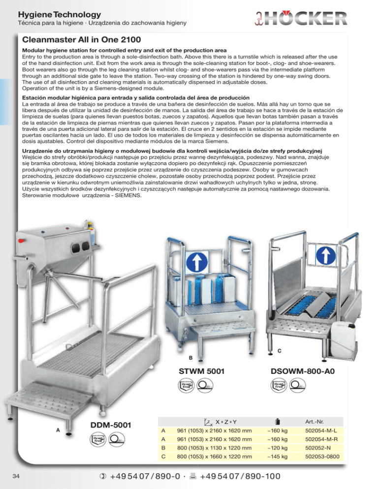 Hygiene Technology Técnica para la higiene · Urządzenia do zachowania higieny Cleanmaster All in One 2100 Modular hygiene station for controlled entry and exit of the production area Entry to the production area is through a sole-disinfection bath. Above this there is a turnstile which is released after the use of the hand disinfection unit. Exit from the work area is through the sole-cleaning station for boot-, clog- and shoe-wearers. Boot wearers also go through the leg cleaning station whilst clog- and shoe-wearers pass via the intermediate platform through an additional side gate to leave the station. Two-way crossing of the station is hindered by one-way swing doors. The use of all disinfection and cleaning materials is automatically dispensed in adjustable doses. Operation of the unit is by a Siemens-designed module. Estación modular higiénica para entrada y salida controlada del área de producción La entrada al área de trabajo se produce a través de una bañera de desinfección de suelos. Más allá hay un torno que se libera después de utilizar la unidad de desinfección de manos. La salida del área de trabajo se hace a través de la estación de limpieza de suelas (para quienes llevan puestos botas, zuecos y zapatos). Aquellos que llevan botas también pasan a través de la estación de limpieza de piernas mientras que quienes llevan zuecos y zapatos. Pasan por la plataforma intermedia a través de una puerta adicional lateral para salir de la estación. El cruce en 2 sentidos en la estación se impide mediante puertas oscilantes hacia un lado. El uso de todos los materiales de limpieza y desinfección se dispensa automáticamente en dosis ajustables. Control del dispositivo mediante módulos de la marca Siemens. Urządzenie do utrzymania higieny o modułowej budowie dla kontroli wejścia/wyjścia do/ze strefy produkcyjnej Wejście do strefy obróbki/produkcji następuje po przejściu przez wannę dezynfekująca‚ podeszwy. Nad wanna‚ znajduje się bramka obrotowa, której blokada zostanie wyłączona dopiero po dezynfekcji rąk. Opuszczenie pomieszczeń produkcyjnych odbywa się poprzez przejście przez urządzenie do czyszczenia podeszew. Osoby w gumowcach przechodzą‚ jeszcze dodatkowo czyszczenie cholew, pozostałe osoby przechodzą poprzez podest. Przejście przez urządzenie w kierunku odwrotnym uniemożliwia zainstalowanie drzwi wahadłowych uchylnych tylko w jedna‚ stronę. Użycie wszystkich środków dezynfekcyjnych i czyszczących następuje automatycznie za pomocą nastawnego dozowania. Sterowanie modułowe urządzenia - SIEMENS. C B STWM 5001 A 34 DDM-5001 DSOWM-800-A0 Art.-Nr. A 961 (1053) x 2160 x 1620 mm ~160 kg 502054-M-L A 961 (1053) x 2160 x 1620 mm ~160 kg 502054-M-R B 800 (1053) x 1130 x 1220 mm ~120 kg 502052-N C 800 (1053) x 1660 x 1220 mm ~145 kg 502053-0800 +49 54 07 / 890-0 · +49 54 07 / 890-100