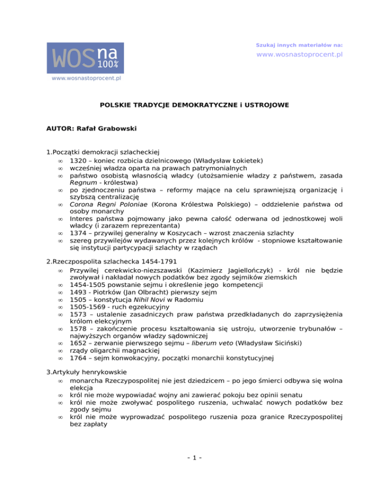 Szukaj innych materiałów na: a www.wosnastoprocent.pl POLSKIE TRADYCJE DEMOKRATYCZNE i USTROJOWE AUTOR: Rafał Grabowski 1.Początki demokracji szlacheckiej • 1320 – koniec rozbicia dzielnicowego (Władysław Łokietek) • wcześniej władza oparta na prawach patrymonialnych • państwo osobistą własnością władcy (utożsamienie władzy z państwem, zasada Regnum - królestwa) • po zjednoczeniu państwa – reformy mające na celu sprawniejszą organizację i szybszą centralizację • Corona Regni Poloniae (Korona Królestwa Polskiego) – oddzielenie państwa od osoby monarchy • Interes państwa pojmowany jako pewna całość oderwana od jednostkowej woli władcy (i zarazem reprezentanta) • 1374 – przywilej generalny w Koszycach – wzrost znaczenia szlachty • szereg przywilejów wydawanych przez kolejnych królów - stopniowe kształtowanie się instytucji partycypacji szlachty w rządach 2.Rzeczpospolita szlachecka 1454-1791 • Przywilej cerekwicko-niezszawski (Kazimierz Jagiellończyk) - król nie będzie zwoływał i nakładał nowych podatków bez zgody sejmików ziemskich • 1454-1505 powstanie sejmu i określenie jego kompetencji • 1493 - Piotrków (Jan Olbracht) pierwszy sejm • 1505 – konstytucja Nihil Novi w Radomiu • 1505-1569 - ruch egzekucyjny • 1573 – ustalenie zasadniczych praw państwa przedkładanych do zaprzysiężenia królom elekcyjnym • 1578 – zakończenie procesu kształtowania się ustroju, utworzenie trybunałów – najwyższych organów władzy sądowniczej • 1652 – zerwanie pierwszego sejmu – liberum veto (Władysław Siciński) • rządy oligarchii magnackiej • 1764 – sejm konwokacyjny, początki monarchii konstytucyjnej 3.Artykuły henrykowskie • monarcha Rzeczypospolitej nie jest dziedzicem – po jego śmierci odbywa się wolna elekcja • król nie może wypowiadać wojny ani zawierać pokoju bez opinii senatu • król nie może zwoływać pospolitego ruszenia, uchwalać nowych podatków bez zgody sejmu • król nie może wyprowadzać pospolitego ruszenia poza granice Rzeczypospolitej bez zapłaty -1- Szukaj innych materiałów na: a www.wosnastoprocent.pl • • • • • król musi zwoływać sejm co lata na okres 6 tygodni, a w razie potrzeby, częściej na 2 tygodnie obowiązek utrzymywania wojska kwarcianego obowiązek przestrzegania tolerancji religijnej (zaprzysiężenie aktu konfederacji warszawskiej) ustanowienie instytucji senatorów- rezydentów , którzy mieli doradzać królowi i kontrolować go w razie złamania przez króla prawa państwowego – szlachta ma prawo nieposłuszeństwa i rokoszu 4.Ustawa Rządowa 3 Maja 1791 • zniesienie odrębności między Koroną a Litwą • zniesienie liberum veto, konfederacji, wolnych elekcji • prawo o miastach i sejmikach ziemskich • objęcie chłopów opieką państwa • gwarancja wolności wyznania z przyznaniem pierwszeństwa religii katolickiej • wprowadzenie ustroju monarchii konstytucyjnej • monteskiuszowski trójpodział władz • władza ustawodawcza: dwuizbowy parlament „zawsze gotowy” o 2- letniej kadencji (204 posłów, 134 senatorów i 24 plenipotentów miast); decyzje zapadają większością głosów; sejm konstytucyjny co 25 lat, prawa polityczne dla szlachtyposesjonatów (cenzus majątkowy); mandat wolny; powołanie komisji sejmowych; dominacja izby niższej (ustawodawstwo, kontrola, ratyfikacja) • władza wykonawcza: król (tron dziedziczny w dynastii Wettinów); zasada nieodpowiedzialności monarchy (kontrasygnata ministrów); Straż Praw (król + 5 ministrów+ prymas+ marszałek sejmu i pełnoletni następca tronu – bez prawa głosu); odpowiedzialność parlamentarna Straży Praw • władza sądownicza: niezawisłe sądy 4.Znaczenie Konstytucji 3 Maja: • próba uratowania I Rzeczypospolitej • wprowadzenie ustroju monarchii konstytucyjnej • osłabienie roli oligarchii magnackiej • początek kształtowania się polskiej burżuazji • druga pisana konstytucja na świecie (pierwsza w Europie) • wierność duchowi szlacheckiego republikanizmu - pojęcie szlachty jako narodu politycznego • zasada stanowego charakteru państwa – cenzus majątkowy • próba zasadniczej reformy • otwarcie nowego rozdziału w dziejach narodu 5.Konstytucja marcowa 17 III 1921 • preambuła – nawiązanie do Konstytucji 3 Maja, korzeni chrześcijańskich, „My, Naród Polski...”, cel konstytucji – zapewnienie niepodległego bytu, wzrostu w siłę, rozwoju, bezpieczeństwa, ładu i poszanowania praw -2- Szukaj innych materiałów na: a www.wosnastoprocent.pl • • • • • • • • • • Nazwa „Rzeczpospolita” – nawiązanie do dawnej nazwy oraz wskazanie na republikańską formę rządów Konstytucja wprowadzała trójpodział władz, w tym instytucje dwuizbowego parlamentu, prezydenta i Rady Ministrów Mandat wolny, immunitet parlamentarny, sesyjność obrad parlamentu Dominacja legislatywy niezawisłe i niezależne sądu i Trybunał Stanu podział kraju na województwa i powiaty szeroki katalog praw obywatelskich (np. równość wobec prawa, prawo do własności prywatnej) liczne prawa socjalne demokratyczny charakter konstytucji – usunięcie dyskryminacji i podziałów majątkowo stanowych; tendencja do wskazania, że ustrój kapitalistyczny może dać masom pracującym to, co oferowała wówczas rewolucja w Rosji postępowy kształt konstytucji 6.Nowela sierpniowa 14 VIII 1926 • prawo wydawania dekretów z mocą ustawy dla prezydenta • znaczne osłabienie legislatywy względem prezydenta – podłoże dla konstytucji kwietniowej 7.Konstytucja kwietniowa 23 IV 1935 • pogarda dla demokratyzmu, praw i swobód obywatelskich, równości wobec prawa, parlamentaryzmu • nowa definicja państwa jako solidarystycznego, wspólnego dobra wszystkich obywateli • zdecydowane wzmocnienie władzy prezydenta – większość praktycznej władzy w rękach prezydenta • odpowiedzialność prezyden