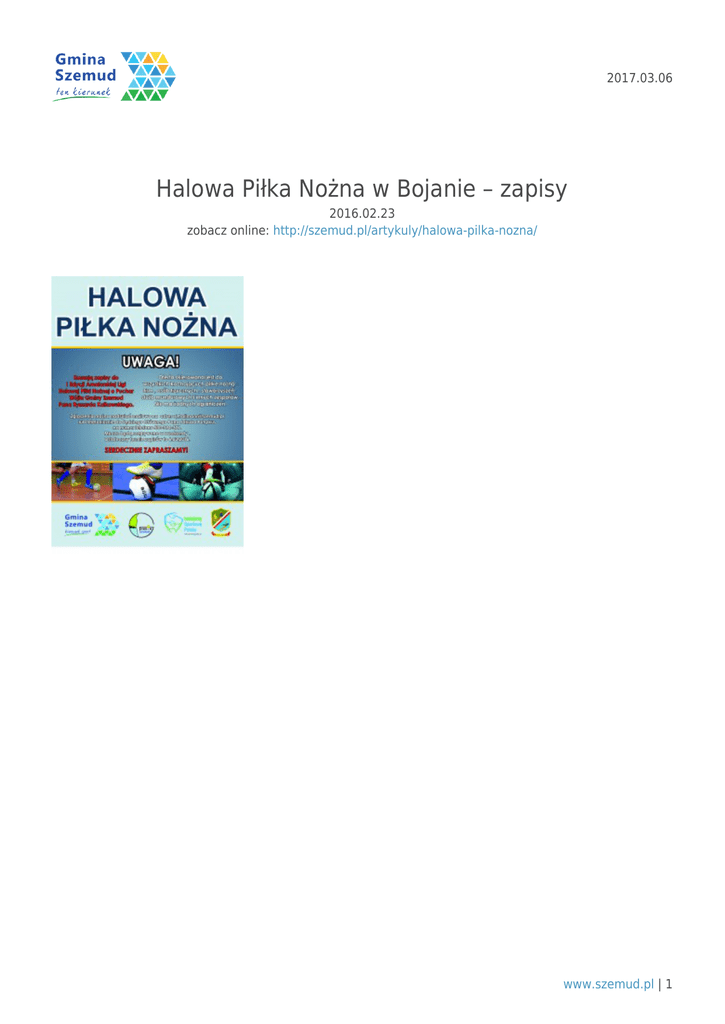 2017.03.06 Halowa Piłka Nożna w Bojanie – zapisy 2016.02.23 zobacz online: http://szemud.pl/artykuly/halowa-pilka-nozna/ www.szemud.pl | 1