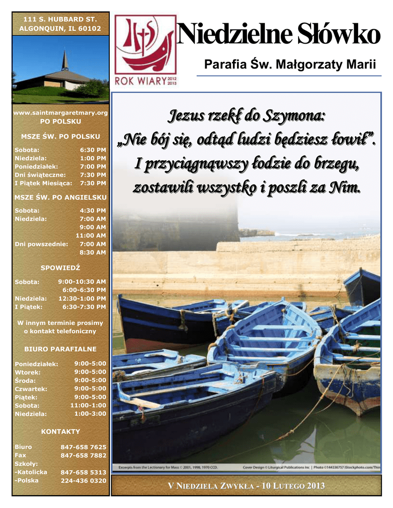 111 S. HUBBARD ST. ALGONQUIN, IL 60102 Niedzielne Słówko Parafia Św. Małgorzaty Marii www.saintmargaretmary.org PO POLSKU MSZE ŚW. PO POLSKU Sobota: Niedziela: Poniedziałek: Dni świąteczne: I Piątek Miesiąca: 6:30 1:00 7:00 7:30 7:30 PM PM PM PM PM MSZE ŚW. PO ANGIELSKU Sobota: Niedziela: Dni powszednie: 4:30 7:00 9:00 11:00 7:00 8:30 Jezus rzekł do Szymona: „Nie bój się, odtąd ludzi będziesz łowił”. I przyciągnąwszy łodzie do brzegu, zostawili wszystko i poszli za Nim. PM AM AM AM AM AM SPOWIEDŹ Sobota: Niedziela: I Piątek: 9:00-10:30 AM 6:00-6:30 PM 12:30-1:00 PM 6:30-7:30 PM W innym terminie prosimy o kontakt telefoniczny BIURO PARAFIALNE Poniedziałek: Wtorek: Środa: Czwartek: Piątek: Sobota: Niedziela: 9:00-5:00 9:00-5:00 9:00-5:00 9:00-5:00 9:00-5:00 11:00-1:00 1:00-3:00 KONTAKTY Biuro Fax Szkoły: -Katolicka -Polska 847-658 7625 847-658 7882 847-658 5313 224-436 0320 V NIEDZIELA ZWYKŁA - 10 LUTEGO 2013 Niedzielne Słówko Refleksja Na Twoje Słowo Kiedy dobiegał kresu czas posługi kard. Martiniego w archidiecezji mediolańskiej, wybrał się on ze swoimi wiernymi na ostatnią pielgrzymkę. Celem wyprawy była Azja Mniejsza, a zwłaszcza starożytny Milet, w którym Paweł żegnał się z Efezjanami przed podróżą do Jerozolimy (Dz 20,14-35). Symboliczne pożegnanie biskupa z ukochaną diecezją, której służył blisko ćwierć wieku, zaowocowało jeszcze jednym darem. Metropolita Lombardii napisał pożegnalny list pasterski pt. „Na Twoje Słowo”, który okazał się podsumowaniem jego gorliwej posługi i duchowym testamentem. Zrealizowało się także wielkie marzenie Kardynała, aby na czas emerytury zamieszkać w Jerozolimie i tam studiować Biblię, modlić się o pokój dla Ziemi Świętej Zdarzyło się raz, gdy tłum cisnął się do Jezusa, i działać charytatywnie. aby słuchać słowa Bożego, a On stał nad jeziorem Genezaret, że zobaczył dwie łodzie, stojące przy Życie wielu gorliwych uczniów Chrystusa to ciągle ponawiana brzegu, rybacy zaś wyszli z nich i płukali sieci. odpowiedź na wezwanie z dzisiejszej Ewangelii: „Wypłyń na głęWszedłszy do jednej łodzi, która należała do Szybię i zarzućcie sieci na połów!”. Czasem, wbrew przyjętym zwymona, poprosił go, żeby nieco odbił od brzegu. czajom, wbrew sytuacjom, które wydają się bez wyjścia, trzeba, Potem usiadł i z łodzi nauczał tłumy. jak Piotr, zaufać: „Mistrzu (...) na Twoje słowo”. Czy można żyć na co dzień Słowem Bożym? Prorok Jeremiasz - Gdy przestał mówić, rzekł do Szymona: „Wypłyń palony wewnętrznym ogniem - stale przepowiadał słowo Boga. na głębię i zarzućcie sieci na połów”. A Szymon Ono było jego codziennym pokarmem; raz słodkim jak miód, odpowiedział: „Mistrzu, przez całą noc pracowala innym razem gorzkim jak piołun (Jer 1,9; Ap 10,9). Gorzkie iśmy i niceśmy nie ułowili. Lecz na Twoje słowo było również słowo dla mieszkańców Jerozolimy, których prorok wzywał do ucieczki z miasta i zmiany sposobu życia. Jego wy- zarzucę sieci”. Skoro to uczynili, zagarnęli tak rocznia dla Jeruzalem była ostra jak miecz, ujawniała wady wielkie mnóstwo ryb, że sieci ich zaczynały się i grzechy: „To miasto kłamstwa, sama w nim nieprawość (...). rwać. Skinęli więc na wspólników w drugiej łodzi, Gwałt i ucisk - dają się w niej słyszeć, choroba i rany - oto, co żeby im przyszli z pomocą. Ci podpłynęli i napełjest stale przed moim obliczem. Strzeż się, Jerozolimo, bym się nili obie łodzie, tak że się prawie zanurzały. nie odwrócił od ciebie...”. Widząc to, Szymon Piotr przypadł Jezusowi do Mieszkańcy Świętego Miasta nie usłuchali Jeremiasza, podobnie kolan i rzekł: „Odejdź ode mnie, Panie, bo jestem jak i wielu innych proroków, nie przyjęli również Chrystusa, któ- człowiek grzeszny”. I jego bowiem, i wszystkich ry płakał na jego widok (Łk 19,41). Słowo Boże, choć czasem jego towarzyszy w zdumienie wprawił połów ryb, rani i boli, w ostateczności jest lekarstwem, które niesie zbawie- jakiego dokonali; jak również Jakuba i Jana, nie (Hi 5,18). Jest tylko jeden warunek! Słowa trzeba wysłusynów Zebedeusza, którzy byli wspólnikami Szychać, zachować je i wprowadzić w życie. Przypomniał o tym Jemona. Lecz Jezus rzekł do Szymona: „Nie bój się, zus swoim uczniom (Łk 8,21), a Paweł gminie w Koryncie (1 Kor odtąd ludzi będziesz łowił”. I przyciągnąwszy łod15,1-2). zie do brzegu, zostawili wszystko i poszli za Nim. Ewangelia według św. Łukasza 5,1-11 O tym, jak trudno żyć na co dzień Słowem Bożym, przekonał się pierwszy z Apostołów. Nad Jeziorem Galilejskim Szymon spontanicznie odpowiedział na wezwanie Pana. Jednak dopiero pod wpływem obfitego połowu do końca zrozumiał, jak wymagające czeka go zadanie. Piotr przekonał się, że trudno przyjąć Słowo Boże, jeśli nie ma się czystego serca. Stąd jego akt skruchy i wyznanie: „Odejdź ode mnie, Panie, bo jestem człowiek grzeszny”. Piotr zrozumiał też, że Słowo Boże musi stale wprawiać w zdumienie, jak „połów ryb, jakiego dokonali”. Odkrył, że do przyjęcia Słowa Bożego i przekazywania go innym potrzeba odwagi: „Nie lękaj się, odtąd ludzi będziesz łowił”. Papież Jan Paweł II w Pelplinie apelował do rodziców, nauczycieli i katechetów: „Jeżeli na progu trzeciego tysiąclecia pytamy o kształt czasów, które nadchodzą, to równocześnie nie możemy uniknąć pytania o fundament, jaki kładziemy pod tę budowlę, jaką podejmą następne pokolenia. Trzeba, aby nasze pokolenie było roztropnym budowniczym przyszłości. A roztropny budowniczy to ten, który słucha słowa Chrystusa i wypełnia je”. Prośmy zatem o dar czystego serca, o zachwyt nad Słowem i odwagę do głoszenia go innym. ks. Jan Kochel Niedzielne Słówko Ogłoszenia Służba Liturgiczna Ołtarza Ministranci Sobota Niedziela 16.ll.2013 17.ll.2013