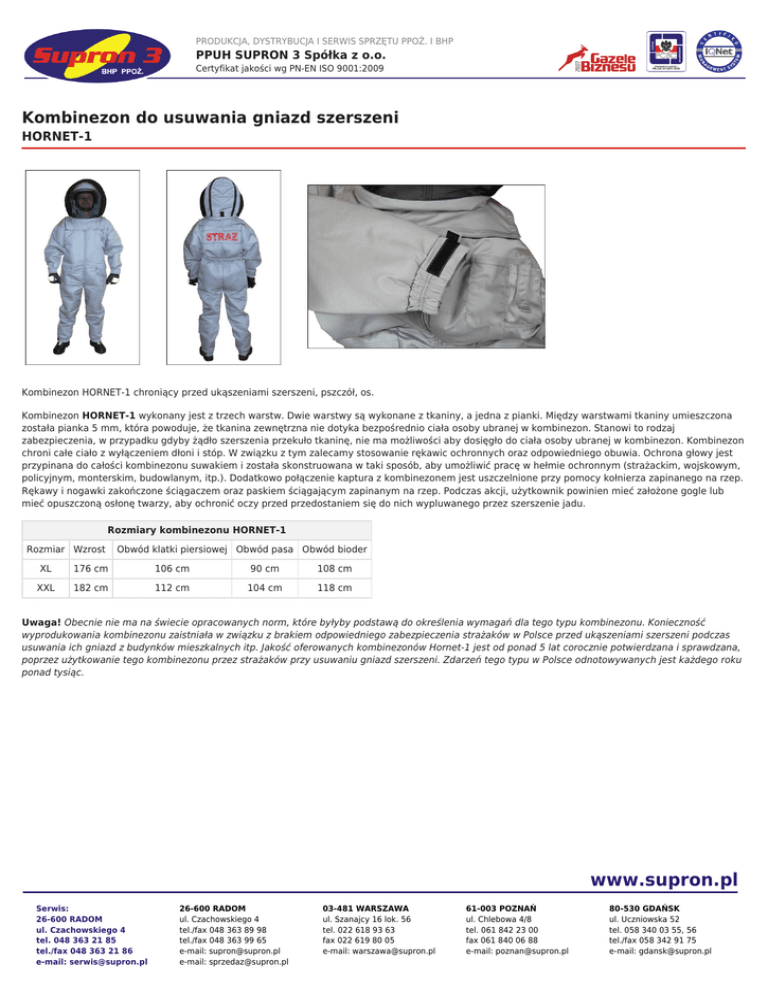 PRODUKCJA, DYSTRYBUCJA I SERWIS SPRZĘTU PPOŻ. I BHP PPUH SUPRON 3 Spółka z o.o. Certyfikat jakości wg PN-EN ISO 9001:2009 Kombinezon do usuwania gniazd szerszeni HORNET-1 Kombinezon HORNET-1 chroniący przed ukąszeniami szerszeni, pszczół, os. Kombinezon HORNET-1 wykonany jest z trzech warstw. Dwie warstwy są wykonane z tkaniny, a jedna z pianki. Między warstwami tkaniny umieszczona została pianka 5 mm, która powoduje, że tkanina zewnętrzna nie dotyka bezpośrednio ciała osoby ubranej w kombinezon. Stanowi to rodzaj zabezpieczenia, w przypadku gdyby żądło szerszenia przekuło tkaninę, nie ma możliwości aby dosięgło do ciała osoby ubranej w kombinezon. Kombinezon chroni całe ciało z wyłączeniem dłoni i stóp. W związku z tym zalecamy stosowanie rękawic ochronnych oraz odpowiedniego obuwia. Ochrona głowy jest przypinana do całości kombinezonu suwakiem i została skonstruowana w taki sposób, aby umożliwić pracę w hełmie ochronnym (strażackim, wojskowym, policyjnym, monterskim, budowlanym, itp.). Dodatkowo połączenie kaptura z kombinezonem jest uszczelnione przy pomocy kołnierza zapinanego na rzep. Rękawy i nogawki zakończone ściągaczem oraz paskiem ściągającym zapinanym na rzep. Podczas akcji, użytkownik powinien mieć założone gogle lub mieć opuszczoną osłonę twarzy, aby ochronić oczy przed przedostaniem się do nich wypluwanego przez szerszenie jadu. Rozmiary kombinezonu HORNET-1 Rozmiar Wzrost Obwód klatki piersiowej Obwód pasa Obwód bioder XL 176 cm 106 cm 90 cm 108 cm XXL 182 cm 112 cm 104 cm 118 cm Uwaga! Obecnie nie ma na świecie opracowanych norm, które byłyby podstawą do określenia wymagań dla tego typu kombinezonu. Konieczność wyprodukowania kombinezonu zaistniała w związku z brakiem odpowiedniego zabezpieczenia strażaków w Polsce przed ukąszeniami szerszeni podczas usuwania ich gniazd z budynków mieszkalnych itp. Jakość oferowanych kombinezonów Hornet-1 jest od ponad 5 lat corocznie potwierdzana i sprawdzana, poprzez użytkowanie tego kombinezonu przez strażaków przy usuwaniu gniazd szerszeni. Zdarzeń tego typu w Polsce odnotowywanych jest każdego roku ponad tysiąc. www.supron.pl Serwis: 26-600 RADOM ul. Czachowskiego 4 tel. 048 363 21 85 tel./fax 048 363 21 86 e-mail: [email protected] 26-600 RADOM ul. Czachowskiego 4 tel./fax 048 363 89 98 tel./fax 048 363 99 65 e-mail: [email protected] e-mail: [email protected] 03-481 WARSZAWA ul. Szanajcy 16 lok. 56 tel. 022 618 93 63 fax 022 619 80 05 e-mail: [email protected] 61-003 POZNAŃ ul. Chlebowa 4/8 tel. 061 842 23 00 fax 061 840 06 88 e-mail: [email protected] 80-530 GDAŃSK ul. Uczniowska 52 tel. 058 340 03 55, 56 tel./fax 058 342 91 75 e-mail: [email protected]