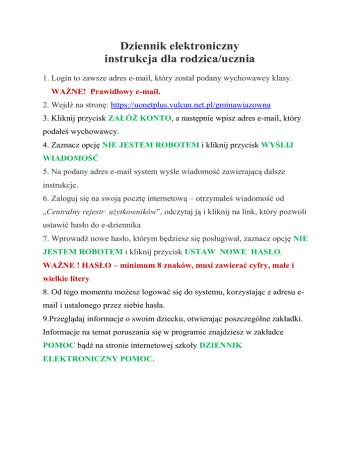 Dziennik elektroniczny instrukcja dla rodzica/ucznia 1. Login to zawsze adres e-mail, który został podany wychowawcy klasy. WAŻNE! Prawidłowy e-mail. 2. Wejdź na stronę: https://uonetplus.vulcan.net.pl/gminawiazowna 3. Kliknij przycisk ZAŁÓŻ KONTO, a następnie wpisz adres e-mail, który podałeś wychowawcy. 4. Zaznacz opcję NIE JESTEM ROBOTEM i kliknij przycisk WYŚLIJ WIADOMOŚĆ 5. Na podany adres e-mail system wyśle wiadomość zawierającą dalsze instrukcje. 6. Zaloguj się na swoją pocztę internetową – otrzymałeś wiadomość od „Centralny rejestr użytkowników”, odczytaj ją i kliknij na link, który pozwoli ustawić hasło do e-dziennika 7. Wprowadź nowe hasło, którym będziesz się posługiwał, zaznacz opcję NIE JESTEM ROBOTEM i kliknij przycisk USTAW NOWE HASŁO. WAŻNE ! HASŁO – minimum 8 znaków, musi zawierać cyfry, małe i wielkie litery 8. Od tego momentu możesz logować się do systemu, korzystając z adresu email i ustalonego przez siebie hasła. 9.Przeglądaj informacje o swoim dziecku, otwierając poszczególne zakładki. Informacje na temat poruszania się w programie znajdziesz w zakładce POMOC bądź na stronie internetowej szkoły DZIENNIK ELEKTRONICZNY POMOC.