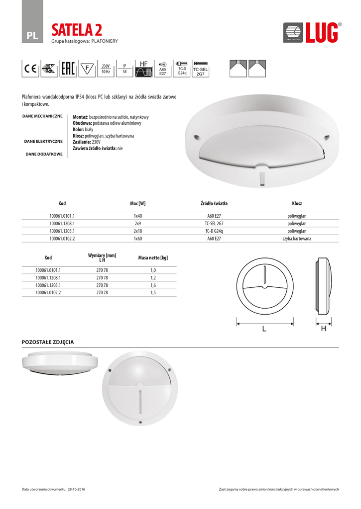 PL SATELA 2 Grupa katalogowa: PLAFONIERY G24q Plafoniera wandaloodporna IP54 (klosz PC lub szklany) na źródła światła żarowe i kompaktowe. DANE MECHANICZNE DANE ELEKTRYCZNE DANE DODATKOWE Montaż: bezpośrednio na suficie, natynkowy Obudowa: podstawa odlew aluminiowy Kolor: biały Klosz: poliwęglan, szyba hartowana Zasilanie: 230V Zawiera źródło światła: nie Kod Moc [W] Źródło światła Klosz 100061.0101.1 100061.1208.1 100061.1205.1 100061.0102.2 1x40 2x9 2x18 1x60 A60 E27 TC-SEL 2G7 TC-D G24q A60 E27 poliwęglan poliwęglan poliwęglan szyba hartowana Kod Wymiary [mm] LH Masa netto [kg] 100061.0101.1 100061.1208.1 100061.1205.1 100061.0102.2 270 78 270 78 270 78 270 78 1,0 1,2 1,6 1,5 POZOSTAŁE ZDJĘCIA Data utworzenia dokumentu: 28-10-2016 Zastrzegamy sobie prawo zmian konstrukcyjnych w oprawach oświetleniowych
