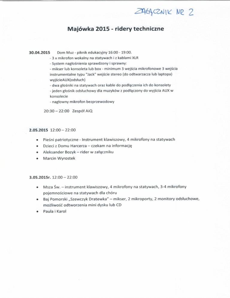 4#kL^ttv t/? Z Maj6wka2015- riderytechniczne 16:00- 19:00. 30.04.2015 Dom Muz - piknikedukacyjny - 3 x mikrofonwokalnyna statywachi z kablamiXLR - Systemnagfo6nienia isprawny: sprawdzony - mikserlub konsoletalub box minimum3 wejSciamikrofonowe3 wejScia lub laptopa) instrumentalnetypu "Jack"wej6ciestereo(do odtwarzacza wyjScieAUX(odsluch) - dwa gfo6nikina statywachoraz kabledo podlqczenia ich do konsolety - jeden glo6nikodsluchowydla muzyk6wz podlqczony do wyjSciaAUXw konsolecie - naglownymikrofonbezprzewodowy 20:30 - 22:00 Zesp6fAiQ 2.05.2015 t2:O0- 22:OO o - Instrumentklawiszowv,4mikrofonyna statywach Pieinipatriotyczne - czekamna informaciq Dzieciz DomuHarcerza o Bozyk- riderw zatqczniku Aleksander o MarcinWyrostek o 3.05.2015r.L2:00- 22:OO o o 4 mikrofonyna statywach,3-4mikrofony MszaSw.- instrumentklawiszowy, pojemnoiciowena statywachdla ch6ru Dratewka"- mikser,2 mikroporty,2 monitoryodsluchowe, BajPomorski,,Szewczyk mini dyskulub CD mozliwoSiodtworzenia o Paulai Karol