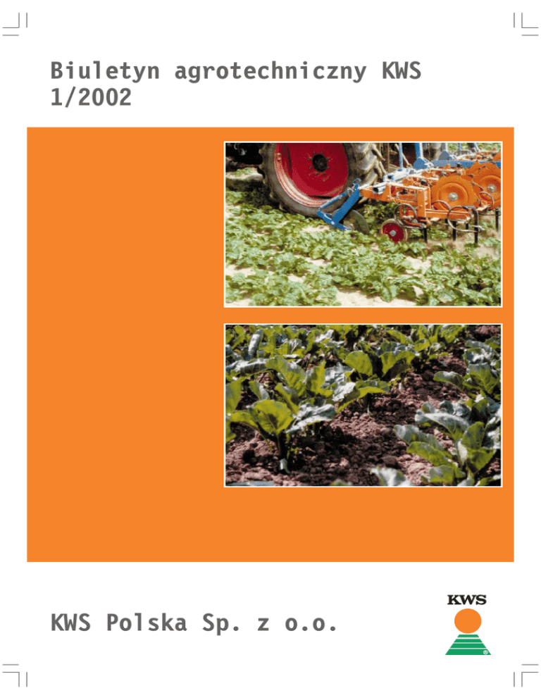 Biuletyn agrotechniczny KWS 1/2002 KWS Polska Sp. z o.o. Wschody OCENA JAKOŚCI WSCHODÓW Szybkie i wyrównane wschody buraków to podstawowy warunek wysokiego plonu o dobrej jakości. Prawidłowa ocena wschodów to również podstawa decyzji o ewentualnym szybkim przesianiu plantacji. Główne czynniki wpływające na wschody buraków to: jakość uprawy przedsiewnej, wilgotność i temperatura gleby, przedsiewna dawka nawozów azotowych i potasowych (nadmierne zasolenie), głębokość siewu, jakość nasion. Polowa zdolność wschodów (PZW)- to wskaźnik jakości twoich wschodów. Terminem tym określamy liczbę siewek uzyskaną ze 100 wysianych nasion (%). Określa się ją licząc punkty z siewkami na długości rzędu odpowiadającej odstępom siewu, to znaczy, przy siewie w odstępach 18 cm - na 18 metrach, przy siewie co 16 cm - na 16 metrach itd.. Liczenia dokonuje się w kilkunastu Oceny PZW dokonuje się po zakończeniu wschodów. Wcześniejsze liczenie siewek i obserwacja dynamiki wschodów pozwala nam jednak na szybszą ocenę stanu plantacji. Minimalna wartość liczbowa PZW, gwarantująca uzyskanie obsady roślin w granicach 80 tys. na 1 hektarze to: Przy siewie w odstępach co 12 cm 48 % PZW. Przy siewie w odstępach co 15 cm 60 % PZW. Przy siewie w odstępach co 18 cm 72 % PZW. Przy siewie w odstępach co 22 cm 80 % PZW. Wschody W warunkach klimatycznych Polski nie zalecamy siewu w odstępach powyżej 18 cm. W przeciętnych warunkach wegetacji stwarza to zagrożenie dla uzyskania prawidłowej obsady roślin. Optymalna obsada roślin na ha wynosi 85-95 tys. roślin na ha. Uzyskanie jej jest szczególnie istotne w ostatnich latach, gdy w uprawie stosuje się odmiany w cukrowym typie użytkowym. Plon z ha zależy tu głównie od obsady, gdyż dynamika przyrostu masy poszczególnych korzeni jest niższa niż w przypadku odmian plennych.. Wpływ obsady roślin na plon korzeni przy odmianach o zróżnicowanych typach użytkowych W przypadku odmian plennych prawidłowy plon można było uzyskać nawet przy obsadzie 50-55 tys. na ha przy równomiernym rozmieszczeniu roślin. Było to efektem dużego przyrostu masy poszczególnych korzeni. Jakość plonu, a zwłaszcza zawartość cukru była jednak wówczas zdecydowanie niska Plony CZYNNIKI OGRANICZAJĄCE PLON CUKRU Zastosowanie w uprawie odmian typu cukrowego i cukrowo-normalnego i powszechny skup korzeni na jakość stwarza konieczność dostosowania technologii uprawy do wymogów cukrowni. W tej sytuacji konieczna jest ochrona tworzącego się plonu cukru. Najważniejsze czynniki wpływające na plon cukru przedstawiono na poniższym wykresie: Nawożenie azotowe (N) - najważniejszy czynnik który może ograniczyć plon cukru. Powinno być zastosowane w dostosowanej do potrzeb i zasobności gleby dawce (ok. 100-140 kg N/ha). Najlepiej w 2 dawkach, pierwsza przedsiewnie pod agregat (nie stosować mocznika !), druga pogłównie w fazie 3-4 pary liści. Późniejsze zastosowanie azotu jest nieuzasadnione ekonomicznie i szkodliwe z punktu widzenia jakości korzeni. Plony Wpływ odmiany - stosować nasiona najlepszych odmian sprawdzonych i rekomendowanych przez cukrownię. Wybrać z oferowanych odmian te które najlepiej plonują w naszych warunkach. Dostosować zaprawy oferowane z nasionami (insektycydy) do występujących na polu zagrożeń. Obsada roślin - Optymalna to 85-95 tys. roślin na ha. (liczba roślin na 22 mb rzędu x 1000). Nie siać w odstępach powyżej 18 cm. Stosować nasiona o LZK pow. 92%. Metoda zbioru - Dokonywać zbioru tuż przed dostawą lub sypać w wymiarowe pryzmy. Nie pozostawiać ogłowionych buraków w glebie. W ciągu 6 dni mogą stracić ok. 2% cukru. Choroby liści - Uprawiać odmiany tolerancyjne na Chwościka burakowego. Obserwować plantację, stosować tanie fungicydowe preparaty profilaktyczne przy występowaniu korzystnych dla infekcji warunków pogodowych. Przy stwierdzeniu wystąpienia choroby na 5% liści koniecznie stosować zabiegi ochrony. Choroby Chwościk burakowy OBJAWY i USZKODZENIA Pojawia się na blaszkach liściowych w postaci licznych małych szarych okrągławych plamek otoczonych brązową lub czerwoną obwódką. W miarę postępu choroby plamek przybywa, łączą się i następuje całkowite zaschnięcie liści. W okresie wilgotnym w środku plam pojawiają się czarne punkty i szary nalot złożony z trzonków konidialnych, szczególnie na spodniej części liścia. Pierwsze symptomy pojawiają się na kilku roślinach tworząc ognisko z którego choroba rozprzestrzenia się dalej. W przypadku silnej epifitozy całe ulistnienie zostaje porażone i zniszczone. Roślina reaguje wytworzeniem nowej rozety liści, która również może ulec zniszczeniu. Na skutek zasychania liści głowa buraka wydłuża się. Choroba może powodować stratę plonu korzeni do 80% i stratę zawartości cukru do 2%. Choroby BIOLOGIA Chorobę wywołuje grzyb Cercospora beticola. Do rozwoju choroby konieczna jest wysoka wilgotność i temperatura pow. 17o C (optimum 27oC). Konidia grzyba rozprzestrzeniane są przez deszcz i płynącą wodę. Głównym źródłem zakażenia są pozostałe na polu resztki liści i zbyt częste występowanie w zmianowaniu. ZWALCZANIE Metody agrotechniczne (staranne przyorywanie resztek, zmianowanie) Ochrona chemiczna: preparaty miedziowe profilaktycznie - Miedzian 50 WG (5 kg/ha), Penncozeb 75 WG (33 kg/ha). Preparaty układowe Alert 375 S.C. (1,0 l/ha), Duett 250 S.C. (0,751,0 l/ha) – po wystąpieniu pierwszych objawów i ryzyku pogodowym dalszej infekcji. Chętnie odpowiemy na Wasze pytania