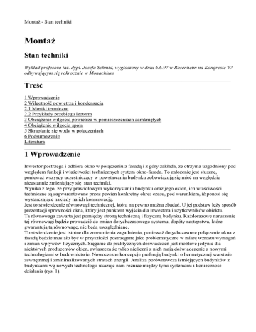 Montaż - Stan techniki Montaż Stan techniki Wykład profesora inż. dypl. Josefa Schmid, wygłoszony w dniu 6.6.97 w Rosenheim na Kongresie`97 odbywającym się rokrocznie w Monachium ________________________________________________________________________________ Treść 1 Wprowadzenie 2 Wilgotność powietrza i kondensacja 2.1 Mostki termiczne 2.2 Przykłady przebiegu izoterm 3 Obciążenie wilgocią powietrza w pomieszczeniach zamkniętych 4 Obciążenie wilgocią spoin 5 Skraplanie się wody w połączeniach 6 Podsumowanie Literatura ________________________________________________________________________________ 1 Wprowadzenie Inwestor postrzega i odbiera okno w połączeniu z fasadą i z góry zakłada, że otrzyma uzgodniony pod względem funkcji i właściwości technicznych system okno-fasada. To założenie jest słuszne, ponieważ wszyscy uczestniczący w powstawaniu budynku zobowiązują się mieć na względzie nieustannie zmieniający się stan techniki. Wynika z tego, że przy prawidłowym wykorzystaniu budynku oraz jego okien, ich właściwości techniczne są zagwarantowane przez pewien konkretny okres czasu, pod warunkiem, iż ponosi się wystarczające nakłady na ich konserwację. Jest to stwierdzenie równowagi technicznej, którą na pewno można zbadać. U jej podstaw leży sposób prezentacji sprawności okna, który jest punktem wyjścia dla inwestora i użytkowników obiektu. Ta równowaga zawarta jest pomiędzy stroną techniczną i fizyczną budynku. Każdorazowe naruszenie tej równowagi będzie prowadzić do zmian dotychczasowego systemu, dopóty następstwa, które gwarantują tą równowagę, nie będą uwzględniane. To stwierdzenie jest istotne dla zrozumienia zagadnienia, ponieważ dotychczasowe połączenie okna z fasadą będzie musiało być w przyszłości postrzegane jako problematyczne w miarę wzrostu wymagań i zmian wpływów fizycznych. Sięganie do praktycznych doświadczeń jest możliwe jedynie dla niektórych producentów okien, zwłaszcza że tylko nieliczni z nich mają doświadczenie z nowymi technologiami w budownictwie. Nowoczesne koncepcje preferują budynki o hermetycznej warstwie zewnętrznej i zminimalizowanych stratach energii. Analiza porównawcza istniejących budynków z budynkami wg nowych technologii ukazuje nam różnice między tymi systemami i konieczność działania (rys. 1). Montaż - stan techniki Strona 2 budynek starej generacji nowa koncepcja budynku o zwiększonych wymaganiach Doświadczenie Oczekiwanie jako wynik pracy jako skutek trendów, wynik naukowego poznania wczoraj dzisiaj jutro Rys. 1 Konfrontacja: doświadczenie i oczekiwania Praktyczne doświadczenie w dużym stopniu odnosi się do istniejących budynków. Jest zatem bardzo ważne, aby ukazywać różnice i za każdym razem opracowywać warunki, które prowadzą do osiągnięcia technicznie prawidłowej, a tym samym nienagannej zewnętrznej warstwy budynku. Naturalnie muszą być uwzględnione także pozostałe czynniki, jak starzenie, obciążenia mechaniczne uszczelnień, czy osadzenie. Wstępna analiza nowej technologii budynku prowadzi nas do następujących dwóch istotnych spostrzeżeń: · planowa i funkcjonalna wentylacja wnętrza, · technicznie prawidłowe wkomponowanie okna w system fasad. Prawidłowa wentylacja nie jest przedmiotem niniejszego opracowania, chociaż jej wpływ na technicznie prawidłowe funkcjonowanie okna jest istotny. Nierozwiązany problem wietrzenia pomieszczeń ma duży wpływ na obciążenie wilgocią okna w zależności od sposobu jego połączenia ze ścianą zewnętrzną (rys. 2). Montaż - stan techniki Strona 3 Powstawanie pleśni Ogrzewanie pomieszczeń System łączeń izotermy Wentylacja pomieszczeń Woda kondensacyjna System uszczelnień mostki termiczne Rys. 2 Problemy wzrastających wymagań w nowoczesnym budynku Przy pobieżnej analizie powstające w ten sposób oddziaływania obciążą producenta okien, o ile nie potrafi on rozwiązać związanych z tym problemów. Inny ważny problem, poprawne technologicznie łączenie okien z fasadą, zostanie w tym miejscu dokładniej naświetlony. 2 Wilgotność powietrza i kondensacja Reakcja spoin łączących na ciepło i wilgoć zależy od mikroklimatu wnętrza i od warunków atmosferycznych panujących na zewnątrz. Temperatura powietrza, wilgotność powietrza i punkt rosy są ze sobą bezpośrednio powiązane. Rysunek 3 przedstawia stopień nasycenia powietrza w zależności od temperatury. Stopień nasycenia jest to ilość wody, którą powietrze o określonej temperaturze jest w stanie pomieścić. Z przebiegu krzywej można rozpoznać, że stopień nasycenia znacznie wzrasta wraz ze wzrostem temperatury. Ciepłe powietrze jest w stanie pomieścić więcej wody niż powietrze chłodne. Wilgotność względna określa zawartość wilgoci w powietrzu w odniesieniu do stopnia nasycenia. Oznacza to, że zawartość wody równa 8,65 g w 1 m3 dla temperatury 20oC odpowiada wilgotności względnej 50%. Woda kondensacyjna powstaje wówczas, gdy powietrze na skutek ochłodzenia nie jest już w stanie pomieścić pierwotnej ilości wody. Zawartość wody w powietrzu w g/m3 Montaż - stan techniki Strona 4 Krzywa punktu rosy = 100% wilgotności względnej 3 17.3 g/m Woda w stanie ciekłym 3 8.65 g/m Para wodna o Temperatura powietrza w C Rys. 3 Krzywa punktu rosy, służąca do określania temperatury kondensacji Punkt rosy jest to temperatura, w której powietrze o określonej temperaturze wyjściowej i wilgotności względnej nie jest już w stanie przyjąć większej ilości wody niż zawierało na początku. Dla powietrza w pomieszczeniu zamkniętym o temperaturze 20oC i wilgotności względnej 50% oznacza to, że w powietrzu zawarte jest 50% możliwej maksymalnej ilości wody. Jeżeli nastąpi ochłodzenie do 9,3oC, wówczas wilgotność względna wzrośnie do 100%. Będzie to oznaczało, że powietrze o temperaturze 9,3oC jest nasycone wodą. Jeżeli powietrze