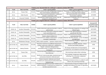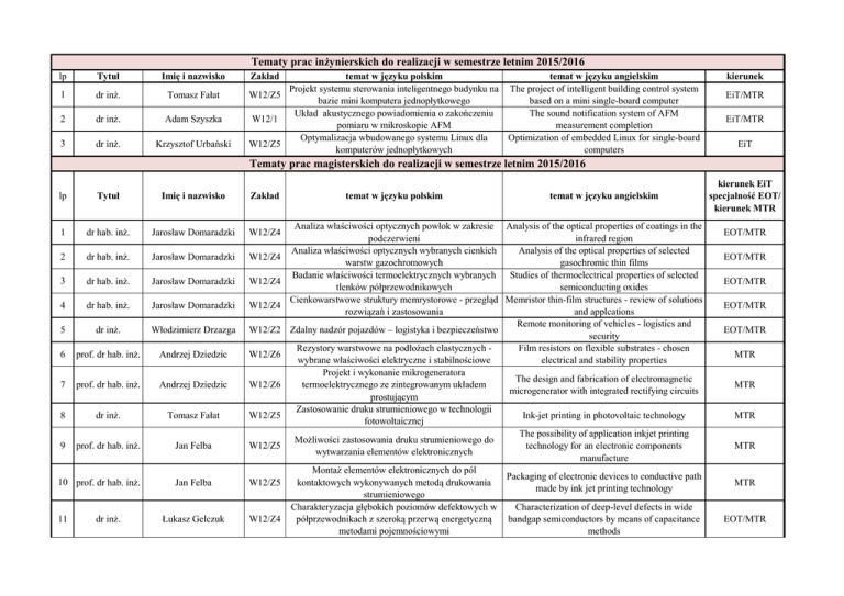 Tematy prac inżynierskich do realizacji w semestrze letnim 2015/2016 lp Tytuł Imię i nazwisko 1 dr inż. Tomasz Fałat 2 dr inż. Adam Szyszka 3 dr inż. Krzysztof Urbański Zakład temat w języku polskim temat w języku angielskim Projekt systemu sterowania inteligentnego budynku na The project of intelligent building control system W12/Z5 bazie mini komputera jednopłytkowego based on a mini single-board computer Układ akustycznego powiadomienia o zakończeniu The sound notification system of AFM W12/1 pomiaru w mikroskopie AFM measurement completion Optymalizacja wbudowanego systemu Linux dla Optimization of embedded Linux for single-board W12/Z5 komputerów jednopłytkowych computers kierunek EiT/MTR EiT/MTR EiT Tematy prac magisterskich do realizacji w semestrze letnim 2015/2016 lp Tytuł Imię i nazwisko Zakład 1 dr hab. inż. Jarosław Domaradzki W12/Z4 2 dr hab. inż. Jarosław Domaradzki 3 dr hab. inż. Jarosław Domaradzki 4 dr hab. inż. Jarosław Domaradzki 5 dr inż. Włodzimierz Drzazga 6 prof. dr hab. inż. Andrzej Dziedzic 7 prof. dr hab. inż. Andrzej Dziedzic 8 dr inż. Tomasz Fałat 9 prof. dr hab. inż. Jan Felba 10 prof. dr hab. inż. Jan Felba 11 dr inż. Łukasz Gelczuk temat w języku polskim temat w języku angielskim Analiza właściwości optycznych powłok w zakresie Analysis of the optical properties of coatings in the podczerwieni infrared region Analiza właściwości optycznych wybranych cienkich Analysis of the optical properties of selected W12/Z4 warstw gazochromowych gasochromic thin films Badanie właściwości termoelektrycznych wybranych Studies of thermoelectrical properties of selected W12/Z4 tlenków półprzewodnikowych semiconducting oxides Cienkowarstwowe struktury memrystorowe - przegląd Memristor thin-film structures - review of solutions W12/Z4 rozwiązań i zastosowania and applcations Remote monitoring of vehicles - logistics and W12/Z2 Zdalny nadzór pojazdów – logistyka i bezpieczeństwo security Rezystory warstwowe na podłożach elastycznych Film resistors on flexible substrates - chosen W12/Z6 wybrane właściwości elektryczne i stabilnościowe electrical and stability properties Projekt i wykonanie mikrogeneratora The design and fabrication of electromagnetic W12/Z6 termoelektrycznego ze zintegrowanym układem microgenerator with integrated rectifying circuits prostującym Zastosowanie druku strumieniowego w technologii W12/Z5 Ink-jet printing in photovoltaic technology fotowoltaicznej The possibility of application inkjet printing Możliwości zastosowania druku strumieniowego do W12/Z5 technology for an electronic components wytwarzania elementów elektronicznych manufacture Montaż elementów elektronicznych do pól Packaging of electronic devices to conductive path W12/Z5 kontaktowych wykonywanych metodą drukowania made by ink jet printing technology strumieniowego Charakteryzacja głębokich poziomów defektowych w Characterization of deep-level defects in wide W12/Z4 półprzewodnikach z szeroką przerwą energetyczną bandgap semiconductors by means of capacitance metodami pojemnościowymi methods kierunek EiT specjalność EOT/ kierunek MTR EOT/MTR EOT/MTR EOT/MTR EOT/MTR EOT/MTR MTR MTR MTR MTR MTR EOT/MTR Badania elektrycznie aktywnych defektów w diodach Investigation of electrically active defects in SiC Schottky'ego z węglika krzemu (SiC) Schottky diodes Niejednorodności bariery w diodach prostowniczych Barrier inhomogeneities of 4H-SiC Schottky Schottky'ego z węglika krzemu 4H-SiC rectifiers Badania właściwości elektrycznych defektów w Investigation of electrical properties of defects in heterostrukturach GaAsN/GaAs za pomocą metody GaAsN/GaAs heterostructures by means of DLTS DLTS method Zastosowanie wysokorozdzielczej spektroskopii Application of high-resolution capacitance pojemnościowej w badaniach półprzewodników grupy spectroscopy for investigation of III-V dilute nitride III-V rozrzedzanych azotem semiconductors Wpływ defektów na właściwości elektro-optyczne Influence of defects on the electro-optical struktur III-V rozrzedzanych bizmutem properties of III-V dilute bismides Spektroskopia pojemnościowa głębokich poziomów Capacitance spectroscopy of deep-level defects in defektowych w strukturach GaAsBi GaAsBi structures 12 dr inż. Łukasz Gelczuk W12/Z4 13 dr inż. Łukasz Gelczuk W12/Z4 14 dr inż. Łukasz Gelczuk W12/Z4 15 dr inż. Łukasz Gelczuk W12/Z4 16 dr inż. Łukasz Gelczuk W12/Z4 17 dr inż. Łukasz Gelczuk W12/Z4 18 prof. dr hab. inż. Leszek Golonka W12/Z6 Formowanie wąskich kanałów w strukturach LTCC Formation of narrow channels in LTCC structure MTR 19 prof. dr hab. inż. Leszek Golonka W12/Z6 Pomiar ciśnienia w komorze LTCC Pressure measurement in LTCC chamber EOT/MTR 20 prof. dr hab. inż. Leszek Golonka W12/Z6 Optymalizacja rozkładu temperatury w mikroreaktorze Optimization of temperature distribution in LTCC LTCC microreactor EOT/MTR 21 prof. dr hab. inż. Leszek Golonka W12/Z6 Wykonanie i badanie możliwości zastosowań mikrogeneratora plazmy wykonanego techniką LTCC LTCC micro plasma generator manufacturing and study of various application EOT/MTR 22 prof. dr hab. inż. Leszek Golonka W12/Z6 Zastosowanie lasera do grzania mikroreaktora LTCC Laser heating of LTCC microreactor EOT/MTR 23 prof. dr hab. inż. Teodor Gotszalk W12/Z3 Badania materiałów dla pamięci zmiennej fazy Investigations of phase change memory materials EOT/MTR 24 prof. dr hab. inż. Teodor Gotszalk W12/Z3 Pomiary struktur grafenowych metodami mikroskopii bliskich odziaływań Measurements of the graphene structures using scanning probe microscopy technology EOT/MTR 25 prof. dr hab. inż. Teodor Gotszalk W12/Z3 Wysokorozdzielcze i małoszumowe układy wzamcniaczy dla High resolution and low noise measurement preamplifier detekcji sygnału z mostków magnetoelektrycznych for detection of electromagnetic signals EOT/MTR 26 prof. dr hab. inż. Teodor Gotszalk W12/Z3 Oprogramowanie do te