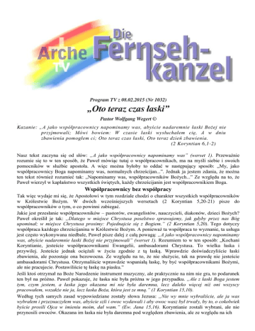 Program TV z 08.02.2015 (Nr 1032) „Oto teraz czas łaski” Pastor Wolfgang Wegert © Kazanie: „A jako współpracownicy napominamy was, abyście nadaremnie łaski Bo ej nie przyjmowali; Mówi bowiem: W czasie łaski wysłuchałem cię, A w dniu zbawienia pomogłem ci; Oto teraz czas łaski, Oto teraz dzień zbawienia. (2 Koryntian 6,1-2) Christian Nasz tekst zaczyna się od słów: „A jako współpracownicy napominamy was” (werset 1). Przeważnie rozumie się to w ten sposób, że Paweł mówiąc tutaj o współpracownikach, ma na myśli siebie i swoich pomocników w służbie apostoła. A więc można byłoby to oddać w następujący sposób: „My, jako współpracownicy Boga napominamy was, normalnych chrześcijan...”. Jednak ja jestem zdania, że można ten tekst również rozumieć tak: „Napominamy was, współpracowników Bożych...” Ze względu na to, że Paweł wierzył w kapłaństwo wszystkich świętych, każdy chrześcijanin jest współpracownikiem Boga. Współpracownicy bez współpracy Tak więc wydaje mi się, że Apostołowi w tym rozdziale chodzi o charakter wszystkich współpracowników w Królestwie Bożym. W dwóch wcześniejszych wersetach (2 Koryntian 5,20-21) pisze do współpracowników o tym, o co powinni zabiegać. Jakie jest przesłanie współpracowników – pastorów, ewangelistów, nauczycieli, diakonów, dzieci Bożych? Paweł określił je tak: „Dlatego w miejsce Chrystusa poselstwo sprawujemy, jak gdyby przez nas Bóg upominał; w miejsce Chrystusa prosimy: Pojednajcie się z Bogiem.” (2 Koryntian 5,20). Tego dotyczy współpraca każdego chrześcijanina w Królestwie Bożym. A ponieważ ta współpraca to wyznanie, ta usługa jest często wykonywana niedbale, Paweł pisze dalej z całą powagą: „A jako współpracownicy napominamy was, abyście nadaremnie łaski Bo ej nie przyjmowali” (werset 1). Rozumiem to w ten sposób: „Kochani Koryntianie, jesteście współpracownikami Ewangelii, ambasadorami Chrystusa. To wielka łaska i przywilej. Jesteście jednak ociężali w życiu zgodnie z tą łaską. Wprawdzie doświadczyliście łaski zbawienia, ale pozostaje ona bezowocna. Ze względu na to, że nie służycie, tak na prawdę nie jesteście ambasadorami Chrystusa. Otrzymaliście wprawdzie wspaniałą łaskę, by być współpracownikami Bożymi, ale nie pracujecie. Postawiliście tę łaskę na piasku.” Jeśli ktoś otrzymał na Boże Narodzenie instrument muzyczny, ale praktycznie na nim nie gra, to podarunek ten był na próżno. Paweł pokazuje, że łaska nie była próżna w jego przypadku. „Ale z łaski Boga jestem tym, czym jestem, a łaska jego okazana mi nie była daremna, lecz daleko więcej ni oni wszyscy pracowałem, wszak e nie ja, lecz łaska Bo a, która jest ze mną.” (1 Koryntian 15,10). Według tych samych zasad wypowiedziane zostały słowa Jezusa: „Nie wy mnie wybraliście, ale ja was wybrałem i przeznaczyłem was, abyście szli i owoc wydawali i aby owoc wasz był trwały, by to, o cokolwiek byście prosili Ojca w imieniu moim, dał wam.” (źw. Jana 15,16). Koryntianie zostali wybrani, ale nie przynosili owoców. Okazana im łaska nie była daremna pod względem zbawienia, ale ze względu na ich Strona 2 - TV-Program - nr 1032 / „Oto teraz czas łaski” owoce i służbę. Przyjęli łaskę zbawienia, ale pozwolili sobie na pozostawanie w bezczynności. Jest wielu chrześcijan, którzy cieszą się ze swojego zbawienia. I rzeczywiście, Pan cudownie uwolnił ich z łańcuchów grzechu. Ale ci ludzie często nie są ambasadorami Chrystusa, nie wyznają, ale są jedynie chrześcijańskimi konsumentami. W związku z tym padają poważne słowa: „A jako współpracownicy napominamy was, abyście nadaremnie łaski Bo ej nie przyjmowali” (werset 1). Pilne usługi Paweł idzie dalej, cytując ze Starego Testamentu: „Tak mówi Pan: W czasie łaski wysłuchałem cię i w dniu zbawienia pomogłem ci” (Izajasza 49,8). Apostoł tak rozumie te słowa z Księgi Izajasza, że począwszy od odkupieńczego dzieła Chrystusa, każdy dzień jest dniem zbawienia. Dodaje cytat: „Oto teraz czas łaski, oto teraz dzień zbawienia!” (werset 2). Przez to chce powiedzieć Koryntianom: „Nie ma żadnej wymówki, jesteście ambasadorami Chrystusa. Ze względu na to, że od śmierci i zmartwychwstania Jezusa, każdy dzień jest dniem zbawienia, każdy dzień jest też dniem świadectwa i ocalenia dusz!” „żłoś Słowo, bąd w pogotowiu w ka dy czas, dogodny czy niedogodny” (2 Tymoteusza 4,2). Nie ma sytuacji, która byłaby nieodpowiednia dla Ewangelii, abyśmy mogli odkładać nasze zwiastowanie. Może chcesz z kimś porozmawiać o wierze w Boże Narodzenie, albo komuś innemu napisać o Jezusie na swoim weselu. Ale kto wie, czy ta osoba będzie wtedy w ogóle żyć? Kilka dni temu czytałem, że pan młody załamał się przed ołtarzem i umarł na boku swojej narzeczonej. Dlatego dla sprawy Boga zawsze jest „teraz”. ”Oto teraz czas łaski, oto teraz dzień zbawienia!” Znamy to przysłowie: „Co możesz zrobić dzisiaj, nie odkładaj na jutro.” Nigdzie nie pasuje ono tak dobrze, jak w odniesieniu do służby chrześcijańskiego świadectwa. Jeśli dzisiaj możesz komuś przynieść orędzie Chrystusa, nie odkładaj tego na jutro. Jeśli możesz złożyć świadectwo przy śniadaniu, nie czekaj do obiadu. Ponieważ Paweł mówi: „Oto teraz czas łaski, oto teraz dzień zbawienia!”. To oczywiście nie oznacza, że nie powinniśmy kierować się mądrością. Paweł nie chciał powiedzieć, że mamy być gadułami. Przedstawił raczej prawdę, która brzmi: „Mądry zdobywa dusze” (Przypowieści 11,30, tłum. niemieckie). Apostołowi leży na sercu, byśmy zrozumieli potrzebę przekazywania świadectwa, żebyśmy zawsze pamiętali o naszej służbie, ponieważ Pan chce w każdej chwili ratować dusze. Chodzi o życie albo śmierć, o niebo albo piekło. O ewangeliście Moodym czytam