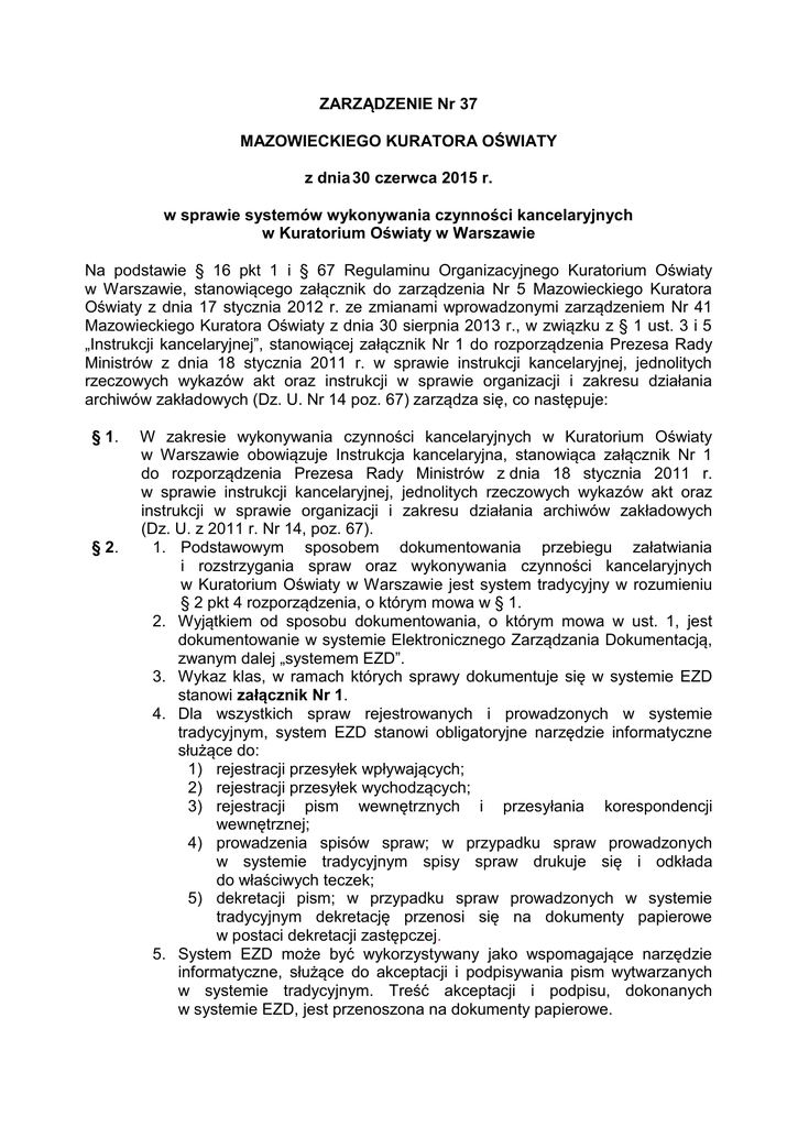 ZARZĄDZENIE Nr 37 MAZOWIECKIEGO KURATORA OŚWIATY z dnia 30 czerwca 2015 r. w sprawie systemów wykonywania czynności kancelaryjnych w Kuratorium Oświaty w Warszawie Na podstawie § 16 pkt 1 i § 67 Regulaminu Organizacyjnego Kuratorium Oświaty w Warszawie, stanowiącego załącznik do zarządzenia Nr 5 Mazowieckiego Kuratora Oświaty z dnia 17 stycznia 2012 r. ze zmianami wprowadzonymi zarządzeniem Nr 41 Mazowieckiego Kuratora Oświaty z dnia 30 sierpnia 2013 r., w związku z § 1 ust. 3 i 5 „Instrukcji kancelaryjnej”, stanowiącej załącznik Nr 1 do rozporządzenia Prezesa Rady Ministrów z dnia 18 stycznia 2011 r. w sprawie instrukcji kancelaryjnej, jednolitych rzeczowych wykazów akt oraz instrukcji w sprawie organizacji i zakresu działania archiwów zakładowych (Dz. U. Nr 14 poz. 67) zarządza się, co następuje: § 1. § 2. W zakresie wykonywania czynności kancelaryjnych w Kuratorium Oświaty w Warszawie obowiązuje Instrukcja kancelaryjna, stanowiąca załącznik Nr 1 do rozporządzenia Prezesa Rady Ministrów z dnia 18 stycznia 2011 r. w sprawie instrukcji kancelaryjnej, jednolitych rzeczowych wykazów akt oraz instrukcji w sprawie organizacji i zakresu działania archiwów zakładowych (Dz. U. z 2011 r. Nr 14, poz. 67). 1. Podstawowym sposobem dokumentowania przebiegu załatwiania i rozstrzygania spraw oraz wykonywania czynności kancelaryjnych w Kuratorium Oświaty w Warszawie jest system tradycyjny w rozumieniu § 2 pkt 4 rozporządzenia, o którym mowa w § 1. 2. Wyjątkiem od sposobu dokumentowania, o którym mowa w ust. 1, jest dokumentowanie w systemie Elektronicznego Zarządzania Dokumentacją, zwanym dalej „systemem EZD”. 3. Wykaz klas, w ramach których sprawy dokumentuje się w systemie EZD stanowi załącznik Nr 1. 4. Dla wszystkich spraw rejestrowanych i prowadzonych w systemie tradycyjnym, system EZD stanowi obligatoryjne narzędzie informatyczne służące do: 1) rejestracji przesyłek wpływających; 2) rejestracji przesyłek wychodzących; 3) rejestracji pism wewnętrznych i przesyłania korespondencji wewnętrznej; 4) prowadzenia spisów spraw; w przypadku spraw prowadzonych w systemie tradycyjnym spisy spraw drukuje się i odkłada do właściwych teczek; 5) dekretacji pism; w przypadku spraw prowadzonych w systemie tradycyjnym dekretację przenosi się na dokumenty papierowe w postaci dekretacji zastępczej. 5. System EZD może być wykorzystywany jako wspomagające narzędzie informatyczne, służące do akceptacji i podpisywania pism wytwarzanych w systemie tradycyjnym. Treść akceptacji i podpisu, dokonanych w systemie EZD, jest przenoszona na dokumenty papierowe. 2 § 3. § 4. § 5. § 6. § 7. § 8. § 9. § 10. 1. Wykaz dokumentów niepodlegających rejestracji w systemie EZD stanowi załącznik Nr 2. 2. W przypadku wpływu dokumentów, o których mowa w ust. 1, w systemie EZD dokonuje się rejestracji wpływu przesyłki, oznaczając pismo kodem kreskowym. 3. W przypadku, o którym mowa w ust. 2, pracownik realizujący sprawę, dokonuje zakończenia pisma w systemie EZD, dodając informację, że sprawa będzie realizowana poza systemem EZD. 1. Wykaz przesyłek wpływających do Kuratorium Oświaty w Warszawie, których nie otwiera punkt kancelaryjny stanowi załącznik Nr 3. 2. O identyfikacji przesyłek, o których mowa w ust. 1, decyduje treść na kopercie. 3. Przesyłki, o których mowa w ust. 1, podlegają wstępnej rejestracji w systemie EZD poprzez nadanie numeru rejestru przesyłek wpływających, a naklejkę z wydrukowanym kodem kreskowym umieszcza się w wolnym miejscu na kopercie. 1. Przesyłki wpływające do Kuratorium Oświaty w Warszawie w postaci papierowej podlegają skanowaniu. 2. Wykaz przesyłek wpływających niepodlegających skanowaniu w punktach kancelaryjnych stanowi załącznik Nr 4. 1. Dekretacji w systemie EZD dokonuje: 1) Mazowiecki Kurator Oświaty; 2) Mazowiecki Wicekurator Oświaty; 3) dyrektor wydziału/delegatury; 4) kierownik oddziału; 5) inna imiennie upoważniona osoba. 2. Wykaz dokumentów niepodlegających dekretacji Mazowieckiego Kuratora Oświaty stanowi załącznik Nr 5. Wielkość przesyłki przekazywanej do Kuratorium Oświaty w Warszawie na informatycznym nośniku danych włączanej do systemu EZD nie może przekraczać 15 MB. 1. Dokumenty papierowe, stanowiące część akt spraw prowadzonych elektronicznie, przechowuje się w składach chronologicznych. 2. Wykaz składów chronologicznych stanowi załącznik Nr 6. 1. W celu przechowywania informatycznych nośników danych, zawierających dokumentację w postaci elektronicznej, przy składach chronologicznych tworzy się składy informatycznych nośników danych. 2. Wykaz składów informatycznych nośników danych stanowi załącznik Nr 7. 1. Udostępnianie i rozpowszechnianie pism między komórkami organizacyjnymi Kuratorium Oświaty w Warszawie odbywa się wyłącznie w systemie EZD. Wymiana pism wewnętrznych następuje pomiędzy pracownikami realizującymi sprawę lub odbywa się za pośrednictwem sekretariatów. 2. Pracownicy prowadzący sprawy zobowiązani są do rejestracji pism wewnętrznych w rejestrze pism wewnętrznych poprzez zaznaczenie opcji „rejestr pism wewnętrznych” podczas przekazywania pism za pośrednictwem systemu EZD oraz przy udostępnieniu dokumentów wewnętrznych. 3 § 11. § 12. § 13. § 14. § 15. § 16. § 17. Sprawy prowadzone i niezakończone w dniu wejścia w życie zarządzenia prowadzone są w systemie podstawowym. Podstawą klasyfikacji i kwalifikacji archiwalnej spraw prowadzonych w Kuratorium Oświaty w Warszawie jest jednolity rzeczowy wykaz akt, stanowiący załącznik Nr 5 do rozporządzenia, o którym mowa w § 1. W zakresie organizacji archiwum zakładowego w Kuratorium Oświaty w Warszawie obowiązuje instrukcja archiwalna, stanowiąca załącznik Nr 6 do rozporządzenia, o którym mowa w § 1. Zarządzenie podlega ogłoszeniu w Biuletynie Informacji Publicznej Kuratorium Oświaty w Warsz