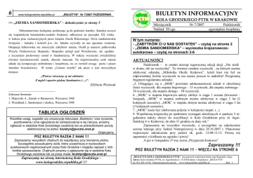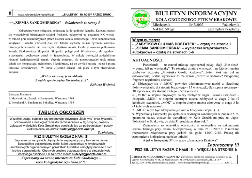 j 6 www.kologrodzkie.republika.pl „BIULETYN” Nr 7/2007 PAŹDZIERNIK >> „ZIEMIA SANDOMIERSKA” – dokończenie ze strony 5 Odrestaurowano kolegiatę, podnosząc ją do godności katedry. Katedra szczyci się wspaniałymi bizantyńsko-ruskimi freskami, odkrytymi na początku XX wieku w trakcie prac restauracyjnych przez księdza Józefa Rokosznego. Dwie sandomierskie świątynie – katedra i kościół p.w. św. Jakuba wywarły na nas ogromne wrażenie. Okupacja hitlerowska nie zniszczyła zabytków miasta. Ocalił je manewr pułkownika Wasyla Fiodorowicza Skopenki. Skopenko poległ pod Wrocławiem, ale zgodnie z życzeniem pochowany został w Sandomierzu. W trakcie wycieczki zwiedziliśmy również kazimierzowski zamek, obecnie muzeum. Na niepowtarzalny urok miasta składa się kompozycja architektury i krajobrazu, na co zwrócił uwagę poeta i pisarz Jarosław Iwaszkiewicz. W tomie „Ciemne ścieżki” tak pisze o tym niezwykłym miejscu: „Wietrze wiosenny, ty mi odsłonisz Z mgieł i oparów piękny Sandomierz (…)”. Elżbieta Woźniak __________________________ Zalecana literatura: 1. Majewski A., Zamek w Baranowie, Warszawa 1968 2. Wendland J., Sandomierz i okolice, Warszawa 1988 TABLICA OGŁOSZEŃ Wszelkie uwagi, sugestie czy propozycję dotyczące „Biuletynu” oraz życzenia, pozdrowienia i inne ogłoszenia do zamieszczenia w tej rubryce, prosimy zgłaszać w siedzibie Koła Grodzkiego osobiście lub za pośrednictwem poczty elektronicznej na adres: [email protected] Dziękujemy. PISZ BIULETYN RAZEM Z NAMI !!! Zapraszamy wszystkich chętnych do współpracy przy tworzeniu pisma. Szczególnie poszukujemy osób, które uczestniczą w wycieczkach autokarowych organizowanych przez Koło Grodzkie i mogłyby napisać z nich krótkie sprawozdanie. Chętnych prosimy o zgłaszanie się w siedzibie Koła Grodzkiego osobiście lub za przez maila: [email protected] Zapraszamy na stronę internetową Koła Grodzkiego – www.kologrodzkie.republika.pl !!! BIULETYN INFORMACYJNY KOŁA GRODZKIEGO PTTK W KRAKOWIE Miesięcznik Nakład: 50 egz. Nr 7/2007 Październik egzemplarz bezpłatny W tym numerze: - „ZABYTKÓW CI U NAS DOSTATEK” – czytaj na stronie 2 - „ZIEMIA SANDOMIERSKA” – wycieczka krajoznawczoautokarowa – czytaj na stronach 3-6 AKTUALNOŚCI Październik – to ostatni miesiąc tegorocznej edycji akcji „Nie siedź w domu, idź na wycieczkę”. To również ostatnie wycieczki , na których można zdobywać odznakę „Miłośnika Okolic Krakowa”. Jeżeli ktoś nie był na odpowiedniej liczbie wycieczek to ma szanse jeszcze to nadrobić! Przypomnę fragment regulaminu odznaki: „5. Ubiegający się o „MOK” powinien udokumentować udział w określonej ilości wycieczek: dla stopnia brązowego – 15 wycieczek, dla stopnia srebrnego – 30 wycieczek, dla stopnia złotego – 50 wycieczek. 6. „MOK” w stopniu brązowym należy zdobyć w ciągu 1 sezonu (kwiecień – listopad), „MOK” w stopniu srebrnym można zdobywać w ciągu 2 lat (2 kolejnych sezonów), „MOK” w stopniu złotym można zdobywać w ciągu 3 lat (3 kolejnych sezonów). 7. „MOK” może być zdobywana jedynie w kolejności stopni. (...) 9. Wypełnioną książeczkę po spełnieniu wymagań określonych w punkcie 5 regulaminu należy złożyć do weryfikacji w Kole Grodzkiem przy ul. Jagiellońskiej 6 w Krakowie, do dnia 31 grudnia za dany rok.” Zapraszamy na wszystkie wycieczki, a szczególnie na zakończenie sezonu letniego przy Jaskini Nietoperzowej w dniu 28.10.2007 r. Planowane rozpoczęcie zakończenia przy jaskini ok. godz. 12:00-12:15. Proszę nie zapomnieć o kiełbasie na ognisko i piwie! A już w listopadzie 37-my sezon „Przyjaciela Krakowa” Zapraszamy !!! PISZ BIULETYN RAZEM Z NAMI !!! – WIĘCEJ NA STRONIE 6 „BIULETYN KOŁA GRODZKIEGO PTTK” przygotował zespół pod okiem mgr Bogumiły Zając. Adres: Koło Grodzkie PTTK, ul. Jagiellońska 6, 31-010 Kraków z dopiskiem: „BIULETYN” tel. 012 429-14-93; [email protected] www.kologrodzkie.republika.pl Rok I 2 www.kologrodzkie.republika.pl „BIULETYN” Nr 7/2007 PAŹDZIERNIK NIE SIEDŹ W DOMU, IDŹ NA WYCIECZKĘ „ZABYTKÓW CI U NAS DOSTATEK” Miniony miesiąc obfitował w wiele atrakcyjnych wycieczek. Odwiedziliśmy miejsca zarówno te bardziej znane jak Lanckorona jak i te trochę mniej. Na sobotnich wycieczkach pod hasłem „Na Szlaku Architektury Drewnianej” zwiedziliśmy kolejne małopolskie kościoły. Zaczęliśmy od kościoła w Barwałdzie Dolnym, pochodzącego z XVIII wieku i Marcyporębie (z wieku XVII). W celu dotarcia z Barwałdu do Marcyporęby, pomimo niesprzyjającej aury przeszliśmy pasmem Trawnej Góry i Draboża. W następnym tygodniu odwiedziliśmy XVI-wieczne świątynie w Łapanowie i Sobolowie. Kościół w Łapanowie pochodzi z roku 1529 i został zbudowany w stylu gotyckim. Swój obecny kształt i wystrój barokowo-rokokowy zawdzięcza XVII-wiecznej przebudowie. Nosi wezwanie św. Bartłomieja Apostoła. Obiekt we wsi Sobolów pochodzi z końca XVI wieku. Jest to kościół parafialny p.w. Wszystkich Świętych. Uroku dodaje mu XVII-wieczna wolnostojąca dzwonnica. W połowie miesiąca odwiedziliśmy wieś Mętków. Drewniany kościół w niej się znajdujący pochodzi z XVIII wieku i jest p.w. MB Częstochowskiej. Zbudowany został w 1771 roku dla parafii w Niegowici, skąd w latach 1972-74 został przeniesiony na obecne miejsce. Kolejna wycieczka była również wycieczką górską. Oprócz odwiedzenia XVII wiecznego kościoła w Kasinie Wielkiej, przeszliśmy przez przeł. Wierzbanowską i Wierzbanowską Górę do Kasiny. Dalsza wędrówka prowadziła koło Ośrodka Rekolekcyjnego pod Śnieżnicą na przełęcz Gruszowiec. W ostatnią sobotę września odwiedziliśmy, pochodzący z 1581 r., przebudowany w XVIII w. kościół św. Sebastiana w Wieliczce. Niedzielne wyprawy można podzielić na dwie grupy: te nastawione na zwiedzanie oraz na te stawiające na bliski kont