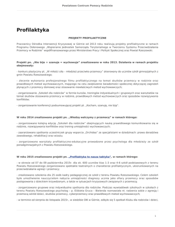Powiatowe Centrum Pomocy Rodzinie Profilaktyka PROJEKTY PROFILAKTYCZNE Pracownicy Ośrodka Interwencji Kryzysowej w Górnie od 2013 roku realizują projekty profilaktyczne w ramach Programu Osłonowego „Wspieranie Jednostek Samorządu Terytorialnego w Tworzeniu Systemu Przeciwdziałania Przemocy w Rodzinie” współfinansowanego przez Ministerstwo Pracy i Polityki Społecznej oraz Powiat Rzeszowski. Projekt pn. „Nie bije + szanuje = wychowuje” zrealizowano w roku 2013. Działania w ramach projektu obejmowały: - konkurs plastyczny pt. „W miłości siła – młodzież przeciwko przemocy” skierowany do uczniów szkół gimnazjalnych z gmin Powiatu Rzeszowskiego; - zlecenie wykonania profesjonalnego filmu profilaktycznego na temat skutków przemocy w rodzinie oraz prawidłowych metod wychowawczych, mającego na celu zwiększenie świadomości społecznej dotyczącej zagrożeń płynących z przemocy domowej oraz stosowanie niewłaściwych metod wychowawczych; - zorganizowanie „Szkoleń dla rodziców” w formie kursów, treningów indywidualnych i grupowych oraz warsztatów na temat skutków stosowania przemocy w rodzinie, prawidłowych metod wychowawczych oraz sposobów rozwiązywania konfliktów; - zorganizowanie konferencji podsumowującej projekt pt. „Kocham, szanuję, nie biję”. W roku 2014 zrealizowano projekt pn. „Wiedzą walczymy z przemocą” w ramach którego: - zorganizowano kolejną edycję „Szkoleń dla rodziców” obejmujących naukę prawidłowego komunikowania się w rodzinie, rozwiązywania konfliktów oraz trening umiejętności wychowawczych; - zaaranżowano spotkania uczestniczek grupy wsparcia „Orchidea” ze specjalistami w dziedzinach: prawa doradztwa zawodowego, rehabilitacji oraz wizażu; - zorganizowano warsztaty profilaktyczno-edukacyjne prowadzone przez psychologa dla młodzieży ze szkół ponadgimnazjalnych z Powiatu Rzeszowskiego. W roku 2015 zrealizowano projekt pn. „Profilaktyka to nasza taktyka”, w ramach którego: - w okresie od 07 do 09 października 2015r. dla ok. 600 uczniów klas 1-3 oraz 4-6 szkół podstawowych z terenu Powiatu Rzeszowskiego zorganizowano spektakle teatralnych o charakterze profilaktycznym, ukierunkowanych na przeciwdziałanie agresji i przemocy; - zrealizowano szkolenia dla 25 osób kadry pedagogicznej ze szkół z terenu Powiatu Rzeszowskiego. Celem szkoleń było umożliwienie nauczycielom nabycia umiejętności diagnozy ucznia jako ofiary przemocy oraz sposobów postępowania z dzieckiem krzywdzonym, a także w sytuacjach kryzysowych związanych z przemocą; - zorganizowano grupowe oraz indywidualne spotkania dla rodziców. Podczas wywiadówek szkolnych w szkołach z terenu Powiatu Rzeszowskiego psycholog – p. Elżbieta Gruca – Bielenda rozmawiała nt. radzenia sobie z agresją i przemocą wśród dzieci, skutków przemocy, cyberprzemocy oraz prawidłowych metod wychowawczych; - w terminie od sierpnia do listopada 2015r., w siedzibie OIK w Górnie, odbyło się 5 spotkań Klubu dla rodziców i dzieci, 1 Powiatowe Centrum Pomocy Rodzinie którego celem było stworzenie miejsca spotkań dla rodziców (opiekunów) i dzieci, a także poszerzenie ich wiedzy w zakresie prawidłowych metod wychowawczych oraz wpływu przemocy w rodzinie na rozwój dziecka. Spotkania umożliwiały rozwijanie wspólnych pasji i zainteresowań rodziców (opiekunów) i dzieci dzięki zajęciom prowadzonym przez pracowników OIK oraz innych specjalistów m.in. fotografa, instruktora tańca; - w siedzibie PCPR w Rzeszowie zorganizowano cykl 4 spotkań szkoleniowych dotyczących wypalenia zawodowego, stresu oraz radzenia sobie w sytuacjach kryzysowych dla osób pracujących w obszarze przeciwdziałania przemocy z terenu Powiatu Rzeszowskiego. Szczegółowe informacje dotyczące projektu pn. „Profilaktyka do nasz taktyka” znajdują się w zakładce Realizowane programy. W związku z realizacją Powiatowego Programu Przeciwdziałania Przemocy w Rodzinie oraz Ochrony Ofiar Przemocy w Rodzinie na lata 2011 - 2020 r., pracownicy Ośrodka Interwencji Kryzysowej prowadzą zajęcia profilaktyczno-edukacyjne z młodzieżą szkół podstawowych z terenu powiatu rzeszowskiego. Tematy zajęć: 1. 2. 3. 4. 5. 6. 7. 8. 9. 10. Przemoc w szkole - jak sobie z nią radzić, sposoby rozwiązywania konfliktów, Anoreksja i bulimia - zachowania ryzykowne wśród nastolatek, Zjawisko przemocy - ogólna charakterystyka zjawiska, formy pomocy ofiarom przemocy, w tym dzieci i młodzieży, Tolerancja - różnorodność jako wartość, Asertywność - sposoby komunikacji w grupie, Alkohol i nikotyna - niebezpieczne używki, Media i przemoc, cyberprzemoc, Karta praw dziecka analiza i omówienie, Narkotyki - uzależnienie jako choroba, Żyję bez ryzyka AIDS. W przypadku zainteresowania powyższymi tematami zajęć prosimy o kontakt, w celu ustalenia szczegółów. Zajęcia są przeprowadzane bezpłatnie. Powiatowe Centrum Pomocy Rodzinie w Rzeszowie – Ośrodek Interwencji Kryzysowej w Górnie chcąc pomóc rodzicom w tej trudnej, ale też i pięknej sztuce wychowywania swoich dzieci, dzięki wsparciu udzielonemu ze środków finansowych Gminnego Programu Profilaktyki i Rozwiązywania Problemów Alkoholowych i Przeciwdziałania Narkomanii w Sokołowie Małopolskim, przygotował praktyczny poradnik - „Odcienie Rodzicielstwa. Kilka rad, jak być dobrym rodzicem”. Ma on poprzez stosowanie prawidłowych metod wychowawczych pomóc w rozwiązywaniu najczęściej spotykanych przez rodziców problemów. Poradnik zawiera wiele przydatnych wskazówek dotyczących wychowania dzieci i młodzieży w poszczególnych etapach ich rozwoju. Podjęte zostały także tematy związane z trudnościami wychowawczymi, a także wskazane zostały sposoby radzenia sobie z nimi, w tak kluczowych zagadnieniach jak granice, zachęcanie dziecka do współpracy, kary i nagrody, dyscyplina i konsekwencja w wychowaniu. Nie pominięto także jednego z trudniejszych wyzwań wychow
