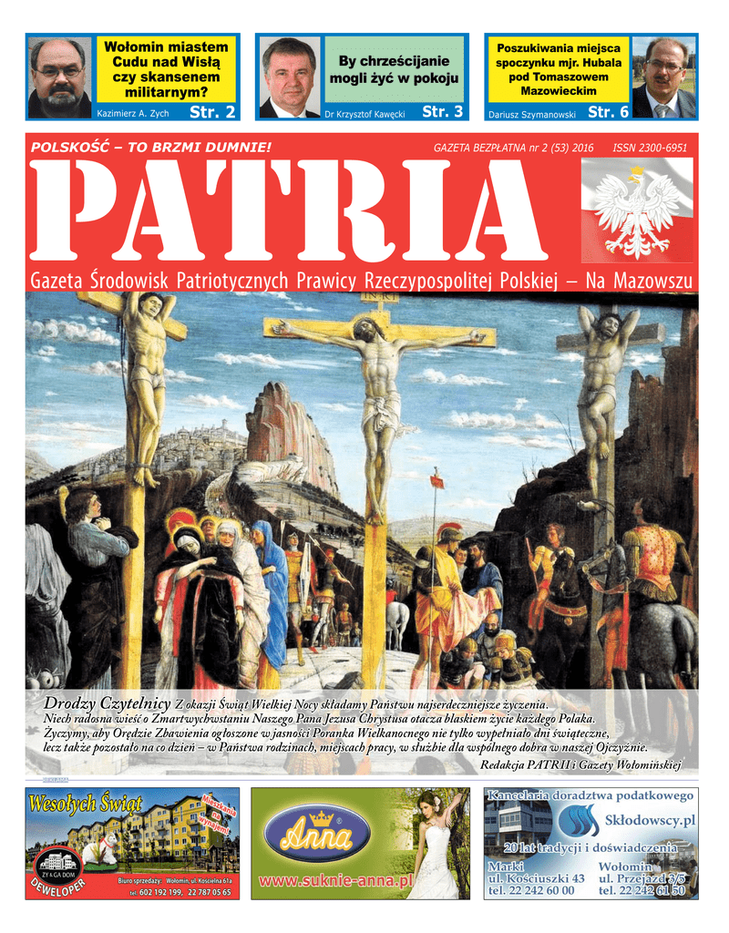 „PATRIA” Wołomin miastem Cudu nad Wisłą czy skansenem militarnym? Kazimierz A. Zych Str. 2 POLSKOŚĆ – TO BRZMI DUMNIE! Numer 2 (53) 2016 By chrześcijanie mogli żyć w pokoju Dr Krzysztof Kawęcki Str. 3 Poszukiwania miejsca spoczynku mjr. Hubala pod Tomaszowem Mazowieckim Dariusz Szymanowski Str. 6 GAZETA BEZPŁATNA nr 2 (53) 2016 PATRIA 1 ISSN 2300-6951 Gazeta Środowisk Patriotycznych Prawicy Rzeczypospolitej Polskiej – Na Mazowszu Drodzy Czytelnicy Z okazji Świąt Wielkiej Nocy składamy Państwu najserdeczniejsze życzenia. Niech radosna wieść o Zmartwychwstaniu Naszego Pana Jezusa Chrystusa otacza blaskiem życie każdego Polaka. Życzymy, aby Orędzie Zbawienia ogłoszone w jasności Poranka Wielkanocnego nie tylko wypełniało dni świąteczne, lecz także pozostało na co dzień – w Państwa rodzinach, miejscach pracy, w służbie dla wspólnego dobra w naszej Ojczyźnie. Redakcja PATRII i Gazety Wołomińskiej REKLAMA [email protected] www.gazetapatria.pl 2 Numer 2 (53) 2016 „PATRIA” Wołomin miastem Cudu nad Wisłą czy skansenem militarnym? Lokalne media oraz portal internetowy Wołomińskie Forum Samorządowe poinformowały ostatnio, iż w firmie DJCHEM - wołomińskiego przedsiębiorcy - budowana jest na podstawie oryginalnych dokumentów technicznych replika historycznego czołgu z okresu wojny 1920 roku. Czołg typu Renault FT-17 ma być przekazany naszemu miastu i stanie jako pomnik w wybranym miejscu. Piękna sprawa z budową tego czołgu - pomnika Kazimierz Andrzej Zych Jednak zawsze jest jedno „ale”. W tekście informującym o tym przedsięwzięciu wdarło się według mnie niepotrzebne kilka zdań jakby z lokalnej polityki i poprawności historycznej okresu powojennego – czyli tzw. jedynego wyzwoliciela. Jak się coś robi - to bez wycieczek o atmosferze społecznej i dobrym czy złym okresie. Zawsze mamy jakiś czas realiów miejskich, społecznych, czy historycznych. Jak fundujemy dzieło wyjątkowe, bo takim jest budowany czołg Renault FT-17 uczestnik Bitwy Warszawskiej 1920 r. to róbmy to z sercem. Uważam, że najlepszym miejscem dla tego wspaniałego pomnika będzie Ossów, gdzie mógłby być głównym elementem ekspozycyjnym budowanego Muzeum Bitwy Warszawskiej. Rozumiem, że Rada Miejska podejmie decyzję lokalizacji pomnika, toteż chciałbym aby rozważono poza starą lokalizacją sowieckiego czołgu, wziąć pod rozwagę Ossów jako autentyczne miejsce gdzie Wojsko Polskie pokonało po raz pierwszy Armię Czerwoną w dniu 14 sierpnia 1920 roku. Ossów to bardzo szczególne miejsce. To właśnie tu odwróciły się losy, wydawałoby się przegranej wojny. Ówczesny generał sowiecki - Putna z pochodzenia Litwin, stwierdził że nie rozumie, co się stało z armią sowiecką, która atakowała Polaków także i tu pod Ossowem: „jak to jest możliwe, że tak dokładnie naciągana struna ofensywy na Warszawę nagle tu, tuż pod stolicą Polaków pękła, armia nasza idąca z impetem traci wolę walki i staje się bezradna, uciekając w popłochu”. Naród Polski doskonale wiedział, co się wydarzyło wtedy pod Warszawą w Ossowie. Ta nagła zmiana sytuacji wojennej, kiedy cofająca się umęczona Armia Polska nagle staje się jakimś cudem armią atakującą zdolną przegonić wroga ze swoich granic. Opatrzność Boża czuwająca nad Polską, polskim wojskiem i ich dowódcami po raz kolejny na przestrzeni wieków dała o sobie znać. Modlące się gorliwie w świątyniach i na Jasnej Górze społeczeństwo wybłagało uratowanie niepodległości ojczyzny. Budowany w wołomińskiej firmie czołg - pomnik będzie wspaniałym przykładem kultywowania historii o Cudzie nad Wisłą, wiary w zwycięstwo, które miało miejsce pod Ossowem. Ten fakt historyczno – patriotyczny uwiecznił Jerzy Koswww.gazetapatria.pl sak na obrazie pt.: Cud nad Wisłą - na którego centralnym planie widzimy postać bohatera wojny Ks. mjr Ignacego Skorupkę. Jestem przekonany, że odsłonięcie tego pomnika odbije się głośnym echem nie tylko w kraju ale i na świecie, podkreślając przywrócenie prawdy historycznej po dziesiątkach lat jej zakłamywaniu. O inicjatywie budowy repliki czołgu w wołomińskim zakładzie pracy tak poinformowały Wieści Podwarszawskie i portal społecznościowy Wołomińskie Forum Samorządowe (facebook) Wołomiński czołg w budowie „W siedzibie firmy DJCHEM CHEMICALS Poland S.A. w Wołominie powstaje Renault FT-17 – czołg używany przez Wojsko Polskie, biorący udział m.in. w Bitwie Warszawskiej 1920 roku. Latem lub najdalej jesienią zostanie on nieodpłatnie przekazany miastu i postawiony w miejscu, z którego poprzednie władze wywiozły czołg T-34. Koordynatorem prac przy budowie czołgu-pomnika jest Mariusz Szymański z DJCHEM CHEMICALS Poland S.A., ale prace przy nim wykonuje większy zespół pracowników tej firmy: Tomasz Młynarski (kieruje pracami montażowymi) i ekipa montażowa: Adam Klimek, Krzysztof Górski, Robert Duchnowski i Damian Jankowski. Gotowe są już wszystkie ogniwa gąsienic oraz elementy układu jezdnego. To najbardziej czasochłonna część prac, ponieważ wymaga niezwykłej precyzji i uwagi, by wszystko idealnie do siebie pasowało. Etap montowania szkieletu konstrukcji nadwozia przebiegnie już znacznie sprawniej, ponieważ elementy są większe i o wiele prostsze w wykonaniu. Forma odlewnicza powstawała w Siedlcach, odlewy w Grodzisku Mazowieckim a elementy podzespołów były wycinane laserowo w firmie „Metal-Centrum” z Wołomina. Obecnie są spawane metodą plazmową. Spawy nakładane są wielowarstwowo, aby uzyskać estetyczne wyoblenia. Koła jak w oryginale, składają się z wielu elementów, które trzeba połączyć. Wszystko musi się dokładnie nakładać na siebie i wiernie odzwierciedlać oryginał – wyjaśnia Mariusz Szymański. Chcąc uzyskać taki efekt, zanim przystąpiono do prac, trzeba było spędzić wiele godzin w Muzeum Polskiej Techniki Wojskowe