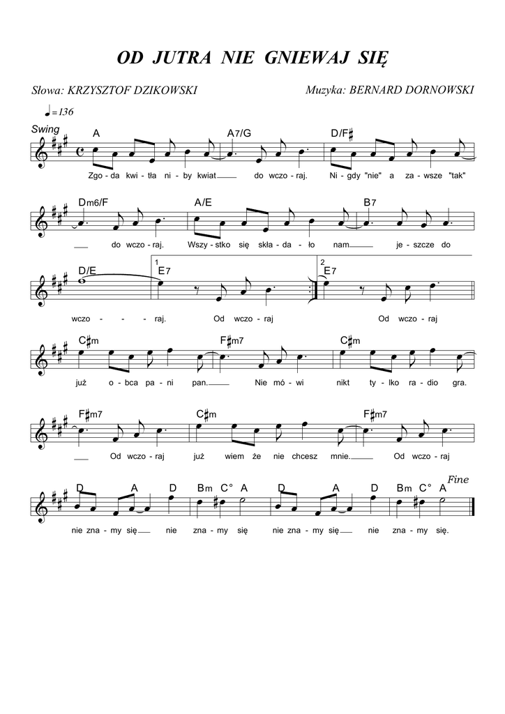 OD JUTRA NIE GNIEWAJ SIĘ Muzyka: BERNARD DORNOWSKI Słowa: KRZYSZTOF DZIKOWSKI Swing Zgo - da kwi - tła ni - by kwiat D m6/F 1 D/E wczo E7 - - - raj. C m już o - bca pa - ni F m7 A nie zna - my się Od pan. już nie Ni - gdy "nie" a skła - da - ło B m C° A się że je - szcze do 2 C m nikt E7 Od wczo - raj ty - lko F m7 mnie. A D nie zna - my się nie nie chcesz D za - wsze "tak" nam Nie mó - wi wiem zna - my B7 wczo - raj F m7 D się C m Od wczo - raj D do wczo - raj. Wszy - stko D/F A/E do wczo - raj. A 7/G A ra - dio gra. Od wczo - raj B m C° A zna - my Fine się.