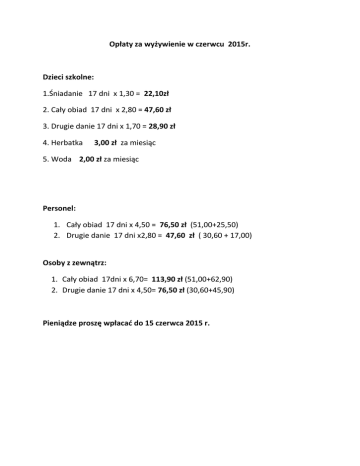 Opłaty za wyżywienie w czerwcu 2015r. Dzieci szkolne: 1.Śniadanie