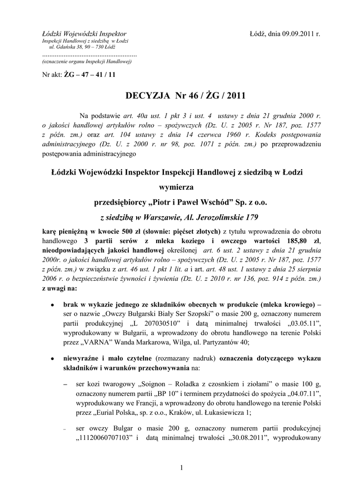 Łódzki Wojewódzki Inspektor Łódź, dnia 09.09.2011 r. Inspekcji Handlowej z siedzibą w Łodzi ul. Gdańska 38, 90 – 730 Łódź ..................................................... (oznaczenie organu Inspekcji Handlowej) Nr akt: ŻG – 47 – 41 / 11 DECYZJA Nr 46 / ŻG / 2011 Na podstawie art. 40a ust. 1 pkt 3 i ust. 4 ustawy z dnia 21 grudnia 2000 r. o jakości handlowej artykułów rolno – spożywczych (Dz. U. z 2005 r. Nr 187, poz. 1577 z późn. zm.) oraz art. 104 ustawy z dnia 14 czerwca 1960 r. Kodeks postępowania administracyjnego (Dz. U. z 2000 r. nr 98, poz. 1071 z późn. zm.) po przeprowadzeniu postępowania administracyjnego Łódzki Wojewódzki Inspektor Inspekcji Handlowej z siedzibą w Łodzi wymierza przedsiębiorcy „Piotr i Paweł Wschód” Sp. z o.o. z siedzibą w Warszawie, Al. Jerozolimskie 179 karę pieniężną w kwocie 500 zł (słownie: pięćset złotych) z tytułu wprowadzenia do obrotu handlowego 3 partii serów z mleka koziego i owczego wartości 185,80 zł, nieodpowiadających jakości handlowej określonej art. 6 ust. 2 ustawy z dnia 21 grudnia 2000r. o jakości handlowej artykułów rolno – spożywczych (Dz. U. z 2005 r. Nr 187, poz. 1577 z późn. zm.) w związku z art. 46 ust. 1 pkt 1 lit. a i art. art. 48 ust. 1 ustawy z dnia 25 sierpnia 2006 r. o bezpieczeństwie żywności i żywienia (Dz. U. z 2010 r. nr 136, poz. 914 z późn. zm.) z uwagi na: brak w wykazie jednego ze składników obecnych w produkcie (mleka krowiego) – ser o nazwie „Owczy Bułgarski Biały Ser Szopski” o masie 200 g, oznaczony numerem partii produkcyjnej „L 207030510” i datą minimalnej trwałości „03.05.11”, wyprodukowany w Bułgarii, a wprowadzony do obrotu handlowego na terenie Polski przez „VARNA” Wanda Markarowa, Wilga, ul. Partyzantów 40; niewyraźne i mało czytelne (rozmazany nadruk) oznaczenia dotyczącego wykazu składników i warunków przechowywania na: ser kozi twarogowy „Soignon – Roladka z czosnkiem i ziołami” o masie 100 g, oznaczony numerem partii „BP 10” i terminem przydatności do spożycia „04.07.11”, wyprodukowany we Francji, a wprowadzony do obrotu handlowego na terenie Polski przez „Eurial Polska„ sp. z o.o., Kraków, ul. Łukasiewicza 1; ser owczy Bulgar o masie 200 g, oznaczony numerem partii produkcyjnej „11120060707103” i datą minimalnej trwałości „30.08.2011”, wyprodukowany 1 w Bułgarii, a wprowadzony do obrotu handlowego na terenie Polski przez „Jansen” sp. z o.o., Warszawa, ul. Szyszkowa 35/37. Uzasadnienie W dniach od 18 do 21 kwietnia 2011 r. na podstawie upoważnienia Łódzkiego Wojewódzkiego Inspektora Inspekcji Handlowej numer ŻG – 42 – 120/11 z dnia 18.04.2011 r. inspektorzy Wojewódzkiego Inspektoratu Inspekcji Handlowej w Łodzi, przeprowadzili kontrolę w supermarkecie „Piotr i Paweł”, zlokalizowanym w Centrum Handlowym „Port Łódź” w Łodzi przy ul. Pabianickiej 245, a należącym do „Piotr i Paweł Wschód” Sp. z o.o. Kontrolę przeprowadzono na podstawie przepisów art. 3 ust. 1 - 3 rozporządzenia Parlamentu Europejskiego i Rady (WE) Nr 882/2004 z dnia 29 kwietnia 2004 r. w sprawie kontroli urzędowych przeprowadzanych w celu sprawdzenia zgodności z prawem paszowym i żywnościowym oraz regułami dotyczącymi zdrowia zwierząt i dobrostanu zwierząt (Dz. U. L 165 z 30.4.2004 ze zm.), art. 17 ust. 3 ustawy z dnia 21 grudnia 2000 r. o jakości handlowej artykułów rolno-spożywczych (Dz. U. z 2005 r. nr 187, poz. 1577, z późn. zm.) w związku z art. 3 ust. 1 pkt 6 oraz art. 3 ust. 1 pkt 1 i 2 ustawy z dnia 15 grudnia 2000 r. o Inspekcji Handlowej (Dz. U. z 2009 r. Nr 151, poz. 1219 z późn. zm.) w obecności osoby upoważnionej kierownika sklepu (…). W trakcie prowadzonych działań kontrolnych stwierdzono, że będące w obrocie handlowym 3 partie serów z mleka koziego i owczego wartości 185,80 zł, oznakowane były niezgodnie z obowiązującymi przepisami. 1. Na 5 opakowaniach sera o nazwie „Owczy Bułgarski Biały Ser Szopski” o masie 200 g wartości 49,95 zł, oznaczonego numerem partii produkcyjnej „L 207 030510” i datą minimalnej trwałości „03.05.11”, wyprodukowanego w Bułgarii, a wprowadzonego do obrotu handlowego przez „VARNA” Wanda Markarowa, Wilga, ul. Partyzantów 40, w składzie (w polskiej wersji językowej) nie wykazano jednego ze składników - mleka krowiego, co narusza art. 6 ust. 2 ustawy z dnia 21 grudnia 2000 r. o jakości handlowej artykułów rolno – spożywczych (Dz. U. z 2005 r. Nr 187, poz. 1577 z późn. zm.) w związku z art. 46 ust. 1 pkt 1 lit. a ustawy z dnia 25 sierpnia 2006 r. o bezpieczeństwie żywności i żywienia (Dz. U. z 2010 r. nr 136, poz. 914 z późn. zm.). Producent przedmiotowego sera w zamieszczonym na opakowaniu jednostkowym składzie wykazał „cow’s milk max. 10%” (tłum. mleko krowie max. 10%). 2. Na 7 opakowaniach sera twarogowego „Soignon – Roladka z czosnkiem i ziołami” o masie 100 g wartości 55,93 zł, oznaczonego numerem partii „BP 10” i terminem przydatności do spożycia „04.07.11” wyprodukowanego we Francji, a wprowadzonego do obrotu handlowego na terenie Polski przez „Eurial Polska„ sp. z o.o., Kraków, ul. Łukasiewicza 1 oraz 8 opakowaniach sera owczego „Bulgar” o masie 200 g wartości 79,92 zł, oznaczonego numerem partii produkcyjnej „11120060707103” i datą minimalnej trwałości „30.08.2011” wyprodukowanego w Bułgarii, a wprowadzonego do obrotu handlowego na terenie Polski przez „Jansen” Sp. z o.o., Warszawa, ul. Szyszkowa 35/37 naniesiono w sposób niewyraźny i mało czytelny (rozmazany nadruk) oznaczenia 2 dotyczące wykazu składników i warunków przechowywania, wbrew postanowieniom zawartym w art. 6 ust. 2 ustawy z dnia 21 grudnia 2000 r. o jakości handlowej artykułów rolno – spożywczych (Dz. U. z 2005 r. Nr 187, poz. 1577z późn. zm.) w związku z art. 48 ust. 1 ustawy z dnia 25 sierpnia 2006 r. o 