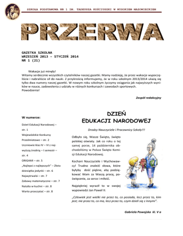 SZKOŁA PODSTAWOWA NR 1 IM. TADEUSZA KOŚCIUSZKI W WYSOKIEM MAZOWIECKIEM GAZETKA SZKOLNA WRZESIEŃ 2013 – STYCZEŃ 2014 NR 1 (21) Wakacje już minęły! Witamy serdecznie wszystkich czytelników naszej gazetki. Mamy nadzieję, że przez wakacje wypoczęliście i nabraliście sił do nauki. Z przykrością informujemy, że w roku szkolnym 2013/2014 ukażą się tylko dwa numery naszej gazetki. W nowym roku szkolnym życzymy osiągania jak najwyższych wyników w nauce, zadowolenia z udziału w różnych konkursach i zawodach sportowych. Powodzenia! Zespół redakcyjny W numerze: Dzień Edukacji Narodowej – str. 1 Wojewódzkie Konkursy Przedmiotowe – str. 2 Uczniowie klas IV – VI z najwyższą średnią – I semestr – str. 4 ORIGAMI – str. 5 „Najlepsi z najlepszych” – Złota dziesiątka jedynki – str. 6 Najwytrwalsi – str. 7 Zabawy matematyczne – str. 7 Natalia w kuchni – str. 8 Warto przeczytać – str. 8 DZIEŃ EDUKACJI NARODOWEJ Drodzy Nauczyciele i Pracownicy Szkoły!!! Odbyło się, Wasze Święto, święto polskiej oświaty. Jak co roku o tej samej porze, 14 października obchodziliśmy w Polsce Święto Komisji Edukacji Narodowej. Kochani Nauczyciele i Wychowawcy! Trudno znaleźć słowa, które byłyby dość piękne, aby podziękować Wam za Waszą pracę, poświęcenie, za serce i miłość. Najpiękniej wyraził to w swojej wypowiedzi Jan Paweł II: „Człowiek jest wielki nie przez to, co posiada, lecz przez to, kim jest; nie przez to, co ma, lecz przez to, czym dzieli się z innymi”. Gabriela Powojska kl. V a SZKOŁA PODSTAWOWA NR 1 IM. TADEUSZA KOŚCIUSZKI W WYSOKIEM MAZOWIECKIEM WOJEWÓDZKIE KONKURSY PRZEDMIOTOWE W dniach 18.11.2013r. - 29.11.2013r. odbyły się Wojewódzkie Konkursy Przedmiotowe – etap szkolny z następujących przedmiotów: język polski, język angielski, matematyka, historia, przyroda, informatyka. Do etapu rejonowego, zakwalifikowały się następujące osoby: z języka polskiego: 1. Dąbrowski Olgierd – kl. VI a 2. Magusiewicz Kamila – kl. VI a 3. Murawska Klaudia – kl. VI c 4. Murawska Monika – kl. VI a 5. Różański Marcin – kl. VI c 6. Mężyńska Katarzyna – kl. VI d z języka angielskiego: 1. Wódz Marcin – kl. VI a 2. Lipiński Piotr – kl. VI b 3. Różański Marcin – kl. VI c z historii: 1. Wódz Marcin – kl. VI a 2. Wyszyński Ignacy – kl. VI a 3. Godlewski Karol – kl. VI b 4. Dąbrowski Jakub – kl. VI c 5. Faszczewski Michał – kl. VI c 6. Różański Marcin – kl. VI c 7. Jabłoński Tomasz – kl. V b 8. Kaczyński Tomasz – kl. V b 9. Oleksik Klaudia – kl. V b z przyrody: 1. Murawska Monika – kl. VI a 2. Wnorowski Szymon – kl. VI a 3. Lipiński Piotr – VI b 4. Dąbrowski Jakub – kl. VI c 5. Faszczewski Mateusz – kl. VI c 6. Faszczewski Michał – kl. VI c 7. Kaczyński Andrzej – kl. VI c 8. Wasilewski Łukasz – kl. VI d z matematyki: 1. Wnorowski Szymon – kl. VI a 2. Dąbrowski Jakub – kl. VI c 3. Kaczyński Andrzej – kl. VI c 4. Kadłubowski Artur – kl. VI c 5. Milewska Nina – kl. VI c z informatyki: 1. Marciniak Marcin – kl. VI a 2. Różański Marcin – kl. VI c 3. Żebrowski Jakub – kl. VI c W dniach 02.01.2014r. - 21.01.2014r. odbyły się Wojewódzkie Konkursy Przedmiotowe – etap rejonowy z następujących przedmiotów: język polski, język angielski, matematyka, historia, przyroda, informatyka. Do etapu wojewódzkiego, zakwalifikowały się następujące osoby: z języka angielskiego: 1. Wódz Marcin – kl. VI a 2. Lipiński Piotr – kl. VI b 3. Różański Marcin – kl. VI c SZKOŁA PODSTAWOWA NR 1 IM. TADEUSZA KOŚCIUSZKI W WYSOKIEM MAZOWIECKIEM PRZERWA – GAZETKA SZKOLNA NR 1 (21) z historii: 1. Różański Marcin – kl. VI c 2. Jabłoński Tomasz – kl. V b 3. Oleksik Klaudia – kl. V b z przyrody: 1. Murawska Monika – kl. VI a 2. Lipiński Piotr – VI b 3. Dąbrowski Jakub – kl. VI c 4. Faszczewski Mateusz – kl. VI c 5. Faszczewski Michał – kl. VI c 6. Kaczyński Andrzej – kl. VI c z matematyki: 1. Wnorowski Szymon – kl. VI a 2. Dąbrowski Jakub – kl. VI c 3. Kaczyński Andrzej – kl. VI c 4. Kadłubowski Artur – kl. VI c 5. Milewska Nina – kl. VI c z informatyki: 1. Różański Marcin – kl. VI c 2. Żebrowski Jakub – kl. VI c W dniach 10.02.2014r. – 21.02.2014r. odbyły się Wojewódzkie Konkursy Przedmiotowe. LAUREACI WOJEWÓDZKICH KONKURSÓW PRZEDMIOTOWYCH W ROKU SZKOLNYM 2013/2014 Laureat Wojewódzkiego Konkursu Języka Angielskiego Lipiński Piotr kl. VI b, Różański Marcin kl. VI c Laureat Wojewódzkiego Konkursu Historycznego Różański Marcin kl. VI c Laureat Wojewódzkiego Konkursu Przyrodniczego Murawska Monika kl. VI a, Lipiński Piotr kl. VI b, Faszczewski Mateusz kl. VI c, Faszczewski Michał kl. VI c, Kaczyński Andrzej kl. VI c Laureat Wojewódzkiego Konkursu Matematycznego Wnorowski Szymon kl. VI a, Dąbrowski Jakub kl. VI c, Andrzej Kaczyński kl. VI, Kadłubowski Artur kl. VI c Laureat Wojewódzkiego Konkursu z Informatyki Różański Marcin kl. VI c GRATULUJEMY!!! Zespół redakcyjny 3|Strona SZKOŁA PODSTAWOWA NR 1 IM. TADEUSZA KOŚCIUSZKI W WYSOKIEM MAZOWIECKIEM PRZERWA – GAZETKA SZKOLNA NR 1 (21) UCZNIOWIE KLAS IV - VI Z NAJWYŻSZĄ ŚREDNIĄ ROK SZKOLNY 2013/2014 – I SEMESTR Klasa IV a 1. Knieć Juliusz – 5,1 2. Milewska Izabela – 5,0 3. Zaremba Natalia Maria – 5,0 4. Grabowska Dominika – 4,9 5. Zaremba Angelika – 4,9 6. Murawska Lidia – 4,8 Klasa IV b 1. Cieślukiewicz Aleksandra – 5,36 2. Górska Julia – 5,36 3. Grabowska Zuzanna – 5,36 4. Kaliszczyk Lidia – 5,10 5. Korzątkowska Wiktoria – 5,00 6. Święcka Patrycja – 4,91 7. Socik Natalia – 4,82 Klasa IV c 1. Żurowska Marta – 5,36 2. Zawistowska Aleksandra – 5,27 3. Krajewska Julia – 5,18 4. Lubowicka Luiza Maria – 5,18 5. Śliwonik Jakub Mikołaj – 5,18 6. Janczewska Kornelia – 5,00 7. Kosieradzka Anna – 5,00 8. Sienicka Weronika – 5,00 9. Mazgoła Oskar - 4,81 10. Perkow