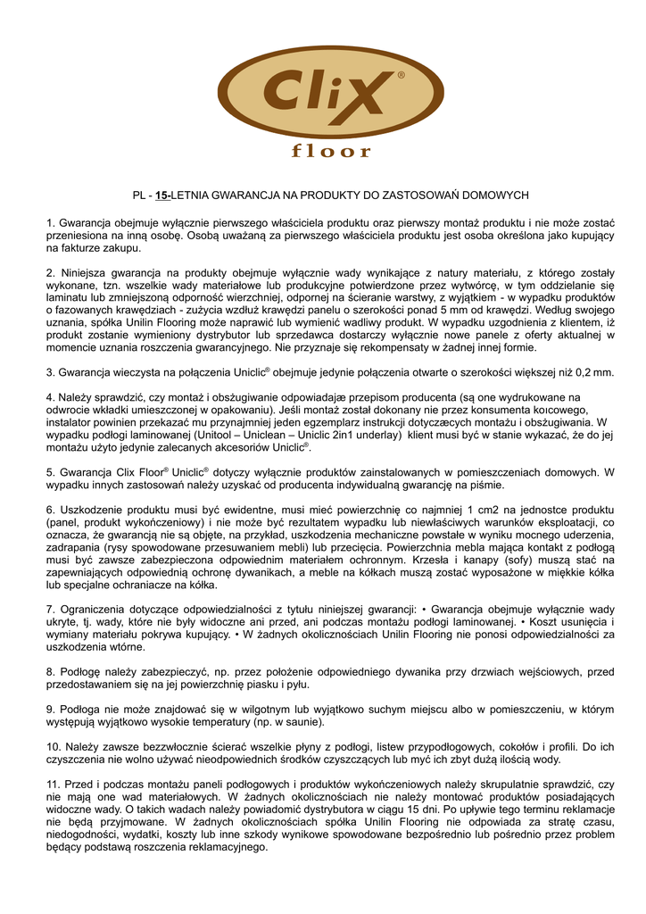 PL - 15-LETNIA GWARANCJA NA PRODUKTY DO ZASTOSOWAŃ DOMOWYCH 1. Gwarancja obejmuje wyłącznie pierwszego właściciela produktu oraz pierwszy montaż produktu i nie może zostać przeniesiona na inną osobę. Osobą uważaną za pierwszego właściciela produktu jest osoba określona jako kupujący na fakturze zakupu. 2. Niniejsza gwarancja na produkty obejmuje wyłącznie wady wynikające z natury materiału, z którego zostały wykonane, tzn. wszelkie wady materiałowe lub produkcyjne potwierdzone przez wytwórcę, w tym oddzielanie się laminatu lub zmniejszoną odporność wierzchniej, odpornej na ścieranie warstwy, z wyjątkiem - w wypadku produktów o fazowanych krawędziach - zużycia wzdłuż krawędzi panelu o szerokości ponad 5 mm od krawędzi. Według swojego uznania, spółka Unilin Flooring może naprawić lub wymienić wadliwy produkt. W wypadku uzgodnienia z klientem, iż produkt zostanie wymieniony dystrybutor lub sprzedawca dostarczy wyłącznie nowe panele z oferty aktualnej w momencie uznania roszczenia gwarancyjnego. Nie przyznaje się rekompensaty w żadnej innej formie. 3. Gwarancja wieczysta na połączenia Uniclic® obejmuje jedynie połączenia otwarte o szerokości większej niż 0,2 mm. 4. Należy sprawdzić, czy montaż i obsżugiwanie odpowiadajæ przepisom producenta (są one wydrukowane na odwrocie wkładki umieszczonej w opakowaniu). Jeśli montaż został dokonany nie przez konsumenta koıcowego, instalator powinien przekazać mu przynajmniej jeden egzemplarz instrukcji dotyczæcych montażu i obsżugiwania. W wypadku podłogi laminowanej (Unitool – Uniclean – Uniclic 2in1 underlay) klient musi być w stanie wykazać, że do jej montażu użyto jedynie zalecanych akcesoriów Uniclic®. 5. Gwarancja Clix Floor® Uniclic® dotyczy wyłącznie produktów zainstalowanych w pomieszczeniach domowych. W wypadku innych zastosowań należy uzyskać od producenta indywidualną gwarancję na piśmie. 6. Uszkodzenie produktu musi być ewidentne, musi mieć powierzchnię co najmniej 1 cm2 na jednostce produktu (panel, produkt wykończeniowy) i nie może być rezultatem wypadku lub niewłaściwych warunków eksploatacji, co oznacza, że gwarancją nie są objęte, na przykład, uszkodzenia mechaniczne powstałe w wyniku mocnego uderzenia, zadrapania (rysy spowodowane przesuwaniem mebli) lub przecięcia. Powierzchnia mebla mająca kontakt z podłogą musi być zawsze zabezpieczona odpowiednim materiałem ochronnym. Krzesła i kanapy (sofy) muszą stać na zapewniających odpowiednią ochronę dywanikach, a meble na kółkach muszą zostać wyposażone w miękkie kółka lub specjalne ochraniacze na kółka. 7. Ograniczenia dotyczące odpowiedzialności z tytułu niniejszej gwarancji: • Gwarancja obejmuje wyłącznie wady ukryte, tj. wady, które nie były widoczne ani przed, ani podczas montażu podłogi laminowanej. • Koszt usunięcia i wymiany materiału pokrywa kupujący. • W żadnych okolicznościach Unilin Flooring nie ponosi odpowiedzialności za uszkodzenia wtórne. 8. Podłogę należy zabezpieczyć, np. przez położenie odpowiedniego dywanika przy drzwiach wejściowych, przed przedostawaniem się na jej powierzchnię piasku i pyłu. 9. Podłoga nie może znajdować się w wilgotnym lub wyjątkowo suchym miejscu albo w pomieszczeniu, w którym występują wyjątkowo wysokie temperatury (np. w saunie). 10. Należy zawsze bezzwłocznie ścierać wszelkie płyny z podłogi, listew przypodłogowych, cokołów i profili. Do ich czyszczenia nie wolno używać nieodpowiednich środków czyszczących lub myć ich zbyt dużą ilością wody. 11. Przed i podczas montażu paneli podłogowych i produktów wykończeniowych należy skrupulatnie sprawdzić, czy nie mają one wad materiałowych. W żadnych okolicznościach nie należy montować produktów posiadających widoczne wady. O takich wadach należy powiadomić dystrybutora w ciągu 15 dni. Po upływie tego terminu reklamacje nie będą przyjmowane. W żadnych okolicznościach spółka Unilin Flooring nie odpowiada za stratę czasu, niedogodności, wydatki, koszty lub inne szkody wynikowe spowodowane bezpośrednio lub pośrednio przez problem będący podstawą roszczenia reklamacyjnego. 12. Unilin Flooring NIE UDZIELA ŻADNYCH INNYCH GWARANCJI, W SPOSÓB WYRAŹNY LUB DOROZUMIANY, OPRÓCZ GWARANCJI OPISANEJ POWYŻEJ, NP. GWARANCJI ZDATNOŚCI DO OBROTU LUB DO JAKIEGOŚ KONKRETNEGO CELU, I NABYWAJĄCEMU NIE PRZYSŁUGUJĄ ŻADNE FORMY ZADOŚĆUCZYNIENIA, OPRÓCZ OKREŚLONYCH POWYŻEJ. Niektóre jurysdykcje nie zezwalają na wyłączenie lub ograniczenie odpowiedzialności za szkody przypadkowe lub wynikowe, w związku z czym powyższe wyłączenia lub ograniczenia mogą nie mieć zastosowania w Twoim konkretnym wypadku . 13. Gwarancja ogólna oraz gwarancja Uniclic ® są gwarancjami proporcjonalnymi. Gwarancja proporcjonalna to taka, która przewiduje zwrot pieniędzy lub udzielenie kredytu w kwocie zmniejszającej się zgodnie z ustalonym wzorem w miarę upływu okresu czasu objętego gwarancją. Pierwotna wartość gwarancji na produkty Clix Floor ® stopniowo spada, w zależności od czasu, który upłynął od momentu ich nabycia. W momencie złożenia roszczenia pierwotna wartość gwarancji zostaje zmniejszona o odpowiedni procent za każdy rok użytkowania produktu, obliczony przy uwzględnieniu, że gwarancja na zużycie produktu udzielana jest na 15 lat, a gwarancja na prawidłowość połączeń Uniclic® na 33 lata. Usługi wykonywane w ramach niniejszej gwarancji nie przedłużają pierwotnego okresu gwarancji. 14. Unilin Flooring ma prawo do sprawdzenia pretensji na miejscu i, w miarê możności, do przeglądu podłogi w tym stanie, w jakim ona była bezpośrednio po ułożeniu; spółka Unilin Flooring powinna mieć taką możliwość. W celu skorzystania z uprawnień gwarancyjnych należy skontaktować się z lokalnym punktem sprzedaży produktów Clix Floor® lub wysłać dowód zakupu i op