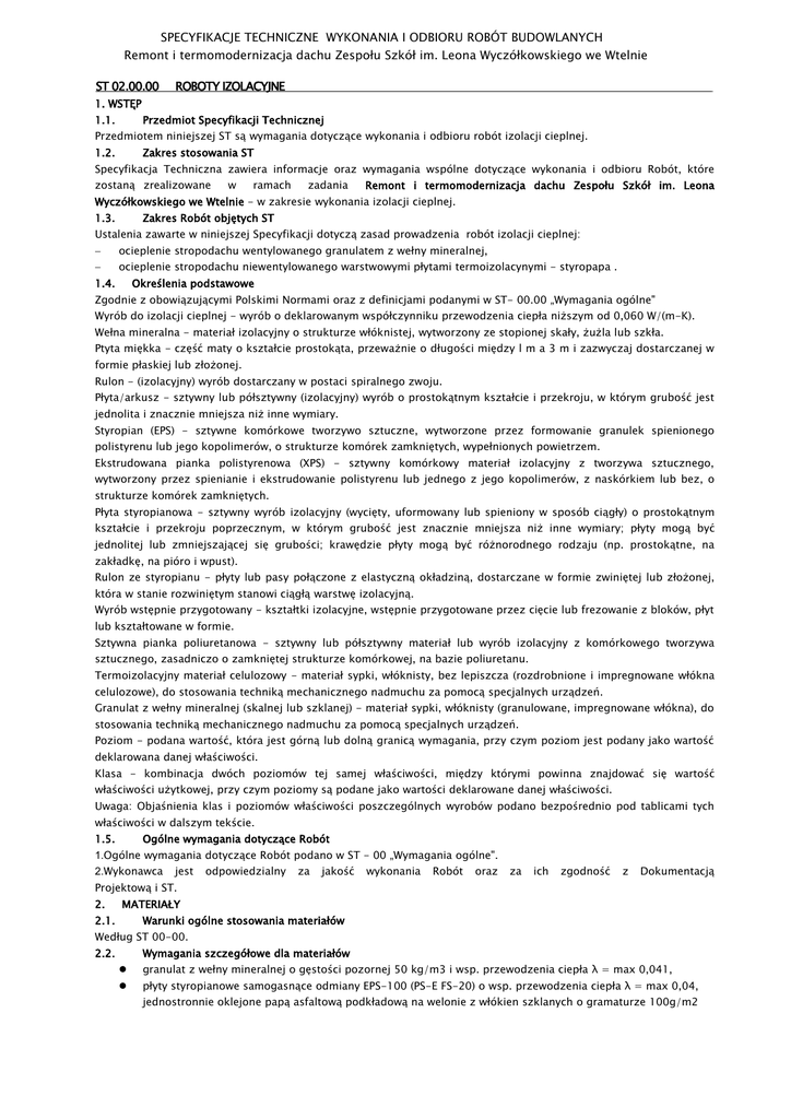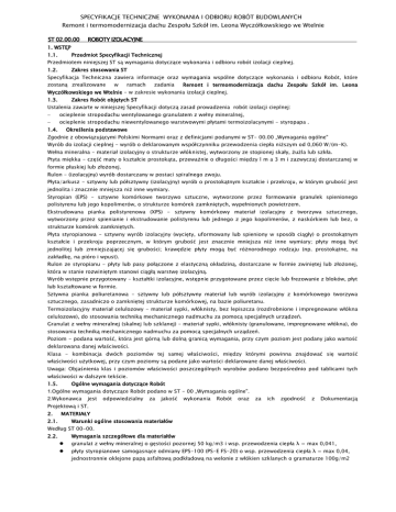 SPECYFIKACJE TECHNICZNE WYKONANIA I ODBIORU ROBÓT BUDOWLANYCH Remont i termomodernizacja dachu Zespołu Szkół im. Leona Wyczółkowskiego we Wtelnie ST 02.00.00 ROBOTY IZOLACYJNE . 1. WSTĘP 1.1. Przedmiot Specyfikacji Technicznej Przedmiotem niniejszej ST są wymagania dotyczące wykonania i odbioru robót izolacji cieplnej. 1.2. Zakres stosowania ST Specyfikacja Techniczna zawiera informacje oraz wymagania wspólne dotyczące wykonania i odbioru Robót, które zostaną zrealizowane w ramach zadania Remont i termomodernizacja dachu Zespołu Szkół im. Leona Wyczółkowskiego we Wtelnie - w zakresie wykonania izolacji cieplnej. 1.3. Zakres Robót objętych ST Ustalenia zawarte w niniejszej Specyfikacji dotyczą zasad prowadzenia robót izolacji cieplnej: − ocieplenie stropodachu wentylowanego granulatem z wełny mineralnej, − ocieplenie stropodachu niewentylowanego warstwowymi płytami termoizolacynymi - styropapa . 1.4. Określenia podstawowe Zgodnie z obowiązującymi Polskimi Normami oraz z definicjami podanymi w ST- 00.00 „Wymagania ogólne" Wyrób do izolacji cieplnej - wyrób o deklarowanym współczynniku przewodzenia ciepła niższym od 0,060 W/(m-K). Wełna mineralna - materiał izolacyjny o strukturze włóknistej, wytworzony ze stopionej skały, żużla lub szkła. Ptyta miękka - część maty o kształcie prostokąta, przeważnie o długości między l m a 3 m i zazwyczaj dostarczanej w formie płaskiej lub złożonej. Rulon - (izolacyjny) wyrób dostarczany w postaci spiralnego zwoju. Płyta/arkusz - sztywny lub półsztywny (izolacyjny) wyrób o prostokątnym kształcie i przekroju, w którym grubość jest jednolita i znacznie mniejsza niż inne wymiary. Styropian (EPS) - sztywne komórkowe tworzywo sztuczne, wytworzone przez formowanie granulek spienionego polistyrenu lub jego kopolimerów, o strukturze komórek zamkniętych, wypełnionych powietrzem. Ekstrudowana pianka polistyrenowa (XPS) - sztywny komórkowy materiał izolacyjny z tworzywa sztucznego, wytworzony przez spienianie i ekstrudowanie polistyrenu lub jednego z jego kopolimerów, z naskórkiem lub bez, o strukturze komórek zamkniętych. Płyta styropianowa - sztywny wyrób izolacyjny (wycięty, uformowany lub spieniony w sposób ciągły) o prostokątnym kształcie i przekroju poprzecznym, w którym grubość jest znacznie mniejsza niż inne wymiary; płyty mogą być jednolitej lub zmniejszającej się grubości; krawędzie płyty mogą być różnorodnego rodzaju (np. prostokątne, na zakładkę, na pióro i wpust). Rulon ze styropianu - płyty lub pasy połączone z elastyczną okładziną, dostarczane w formie zwiniętej lub złożonej, która w stanie rozwiniętym stanowi ciągłą warstwę izolacyjną. Wyrób wstępnie przygotowany - kształtki izolacyjne, wstępnie przygotowane przez cięcie lub frezowanie z bloków, płyt lub kształtowane w formie. Sztywna pianka poliuretanowa - sztywny lub półsztywny materiał lub wyrób izolacyjny z komórkowego tworzywa sztucznego, zasadniczo o zamkniętej strukturze komórkowej, na bazie poliuretanu. Termoizolacyjny materiał celulozowy - materiał sypki, włóknisty, bez lepiszcza (rozdrobnione i impregnowane włókna celulozowe), do stosowania techniką mechanicznego nadmuchu za pomocą specjalnych urządzeń. Granulat z wełny mineralnej (skalnej lub szklanej) - materiał sypki, włóknisty (granulowane, impregnowane włókna), do stosowania techniką mechanicznego nadmuchu za pomocą specjalnych urządzeń. Poziom - podana wartość, która jest górną lub dolną granicą wymagania, przy czym poziom jest podany jako wartość deklarowana danej właściwości. Klasa - kombinacja dwóch poziomów tej samej właściwości, między którymi powinna znajdować się wartość właściwości użytkowej, przy czym poziomy są podane jako wartości deklarowane danej właściwości. Uwaga: Objaśnienia klas i poziomów właściwości poszczególnych wyrobów podano bezpośrednio pod tablicami tych właściwości w dalszym tekście. 1.5. Ogólne wymagania dotyczące Robót 1.Ogólne wymagania dotyczące Robót podano w ST - 00 „Wymagania ogólne". 2.Wykonawca jest odpowiedzialny za jakość wykonania Robót oraz za ich zgodność z Dokumentacją Projektową i ST. 2. MATERIAŁY 2.1. Warunki ogólne stosowania materiałów Według ST 00-00. 2.2. Wymagania szczegółowe dla materiałów granulat z wełny mineralnej o gęstości pozornej 50 kg/m3 i wsp. przewodzenia ciepła λ = max 0,041, płyty styropianowe samogasnące odmiany EPS-100 (PS-E FS-20) o wsp. przewodzenia ciepła λ = max 0,04, jednostronnie oklejone papą asfaltową podkładową na welonie z włókien szklanych o gramaturze 100g/m2 SPECYFIKACJE TECHNICZNE WYKONANIA I ODBIORU ROBÓT BUDOWLANYCH Remont i termomodernizacja dachu Zespołu Szkół im. Leona Wyczółkowskiego we Wtelnie ST 02.00.00 3. ROBOTY IZOLACYJNE . SPRZĘT 3.1. Ogólne wymagania dotyczące sprzętu Ogólne wymagania dotyczące Sprzętu podano w ST - 00 „Wymagania ogólne". 4. TRANSPORT Ogólne wymagania dotyczące Transportu podano w ST - 00 „Wymagania ogólne". 5. WYKONANIE ROBÓT 5.1. Ogólne zasady wykonania Robót Ogólne wymagania dotyczące wykonania Robót podano w ST - 00 „Wymagania ogólne". 5.2. Wykonanie izolacji cieplnej w budynku 5.2.1. Podłoże Izolację cieplną można wykonać na różnych podłożach: - ścianach masywnych (monolitycznych betonowych, otynkowanych lub nieotynkowanych murach z betonu komórkowego lub ceramiki, murach z silikatów i pustaków betonowych itp.), - stropach betonowych, - istniejących stropodachach pełnych pokrytych papą, - stromych dachach (drewnianych), - ścianach szkieletowych drewnianych lub metalowych, - wylewce z chudego betonu. W przypadku dachów stromych (drewnianych) i ścian szkieletowych drewnianych lub metalowych izolacji cieplnej zwykle nie układa się na podłożu, lecz wypełnia nią pola szkieletu. W dachach izolacja może być układana między krokwiam