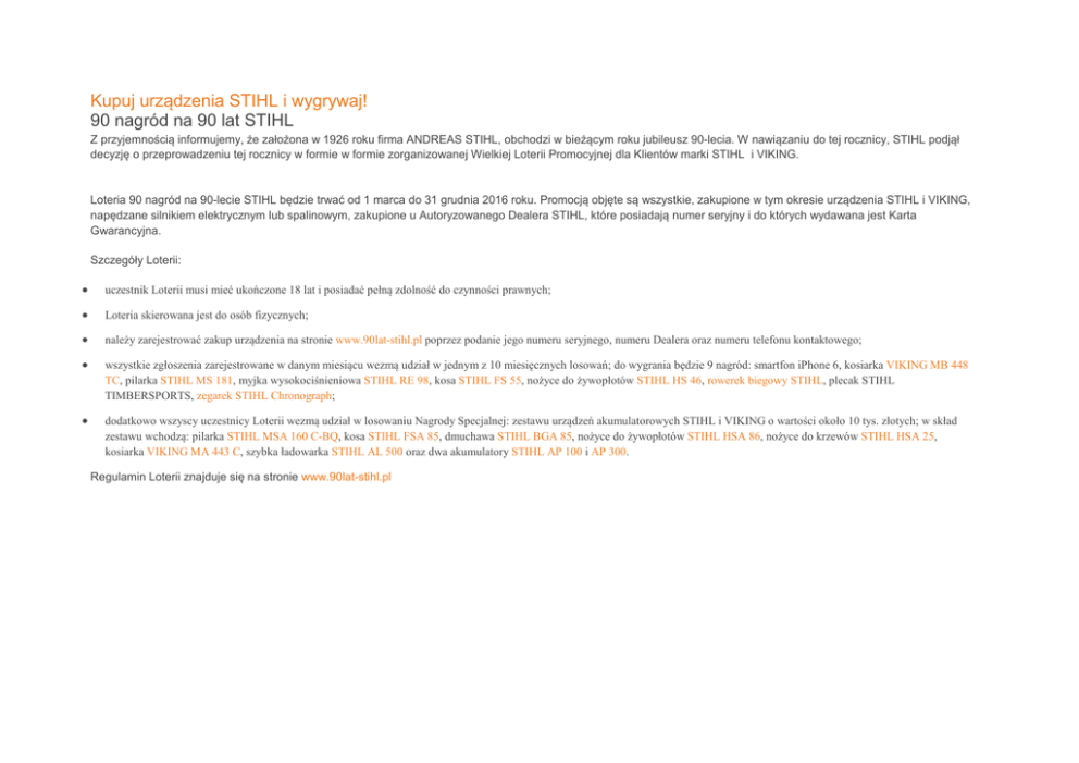 Kupuj urządzenia STIHL i wygrywaj! 90 nagród na 90 lat STIHL Z przyjemnością informujemy, że założona w 1926 roku firma ANDREAS STIHL, obchodzi w bieżącym roku jubileusz 90-lecia. W nawiązaniu do tej rocznicy, STIHL podjął decyzję o przeprowadzeniu tej rocznicy w formie w formie zorganizowanej Wielkiej Loterii Promocyjnej dla Klientów marki STIHL i VIKING. Loteria 90 nagród na 90-lecie STIHL będzie trwać od 1 marca do 31 grudnia 2016 roku. Promocją objęte są wszystkie, zakupione w tym okresie urządzenia STIHL i VIKING, napędzane silnikiem elektrycznym lub spalinowym, zakupione u Autoryzowanego Dealera STIHL, które posiadają numer seryjny i do których wydawana jest Karta Gwarancyjna. Szczegóły Loterii: • uczestnik Loterii musi mieć ukończone 18 lat i posiadać pełną zdolność do czynności prawnych; • Loteria skierowana jest do osób fizycznych; • należy zarejestrować zakup urządzenia na stronie www.90lat-stihl.pl poprzez podanie jego numeru seryjnego, numeru Dealera oraz numeru telefonu kontaktowego; • wszystkie zgłoszenia zarejestrowane w danym miesiącu wezmą udział w jednym z 10 miesięcznych losowań; do wygrania będzie 9 nagród: smartfon iPhone 6, kosiarka VIKING MB 448 TC, pilarka STIHL MS 181, myjka wysokociśnieniowa STIHL RE 98, kosa STIHL FS 55, nożyce do żywopłotów STIHL HS 46, rowerek biegowy STIHL, plecak STIHL TIMBERSPORTS, zegarek STIHL Chronograph; • dodatkowo wszyscy uczestnicy Loterii wezmą udział w losowaniu Nagrody Specjalnej: zestawu urządzeń akumulatorowych STIHL i VIKING o wartości około 10 tys. złotych; w skład zestawu wchodzą: pilarka STIHL MSA 160 C-BQ, kosa STIHL FSA 85, dmuchawa STIHL BGA 85, nożyce do żywopłotów STIHL HSA 86, nożyce do krzewów STIHL HSA 25, kosiarka VIKING MA 443 C, szybka ładowarka STIHL AL 500 oraz dwa akumulatory STIHL AP 100 i AP 300. Regulamin Loterii znajduje się na stronie www.90lat-stihl.pl