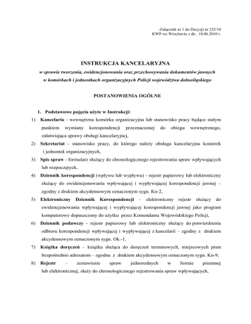 -Załącznik nr 1 do Decyzji nr 232/10 KWP we Wrocławiu z dn . 18.06.2010 r. INSTRUKCJA KANCELARYJNA w sprawie tworzenia, ewidencjonowania oraz przechowywania dokumentów jawnych w komórkach i jednostkach organizacyjnych Policji województwa dolnośląskiego POSTANOWIENIA OGÓLNE 1. Podstawowe pojęcia użyte w Instrukcji: 1) Kancelaria - wewnętrzna komórka organizacyjna lub stanowisko pracy będące stałym punktem wymiany korespondencji przeznaczonej do obiegu wewnętrznego, załatwiająca sprawy obsługi kancelaryjnej, 2) Sekretariat - stanowisko pracy, do którego należy obsługa kancelaryjna komórek i jednostek organizacyjnych, 3) Spis spraw - formularz służący do chronologicznego rejestrowania spraw wpływających lub rozpoczętych, 4) Dziennik korespondencji (wpływu lub wypływu) - rejestr papierowy lub elektroniczny służący do ewidencjonowania wpływającej i wypływającej korespondencji jawnej – zgodny z drukiem akcydensowym oznaczonym sygn. Kn-2, 5) Elektroniczny Dziennik Korespondencji – elektroniczny rejestr służący do ewidencjonowania wpływającej i wypływającej korespondencji jawnej jako program komputerowy dopuszczony do użytku przez Komendanta Wojewódzkiego Policji, 6) Dziennik podawczy - rejestr papierowy lub elektroniczny służący do potwierdzenia odbioru korespondencji wpływającej i wypływającej z kancelarii – zgodny z drukiem akcydensowym oznaczonym sygn. Ok.-1, 7) Książka doręczeń – książka służąca do doręczeń terminowych, miejscowych pism bezpośrednio adresatom – zgodna z drukiem akcydensowym oznaczonym sygn. Kn-9, 8) Rejestr – zestawienie spraw jednorodnych w formie pisemnej lub elektronicznej, służy do chronologicznego rejestrowania spraw wpływających, 9) WKT 111 – Rejestr papierowy lub elektroniczny służący do rejestrowania teczek dokumentów, dzienników i książek ewidencyjnych – zgodny z drukiem akcydensowym oznaczonym sygn. WKT-111, 10) Elektroniczne potwierdzenie odbioru – stwierdzenie faktu otrzymania określonych dokumentów, zrealizowane przy pomocy systemu informatycznego opartego o identyfikacje osoby, na podstawie karty mikroprocesorowej z certyfikatem elektronicznym lub o parę danych identyfikacyjnych w postaci loginu i hasła, 11) Znak sprawy – zespół symboli określających przynależność sprawy do określonej komórki organizacyjnej, 12) Elektroniczny obieg dokumentów – system informatyczny umożliwiający dokładne odwzorowanie dokumentów papierowych na wersję elektroniczną oraz przekazywanie dokumentów elektronicznych między użytkownikami systemu z zachowaniem zdefiniowanych ścieżek przepływu, wraz z niezbędnymi informacjami dodatkowymi. 2. Przykład właściwego oznaczenia dokumentu P-0151-4-243/2010/MK, gdzie: 1) P- symbol literowy komórki organizacyjnej, 2) 0151 – symbol liczbowy hasła według Jednolitego Rzeczowego Wykazu Akt Policji, 3) 4 – kolejna liczba, pod którą sprawa została zarejestrowana w spisie spraw lub rejestrze 4) 243 – znak sprawy który może być uzupełniony o liczbę porządkową z dziennika korespondencyjnego i/lub inne oznaczenie charakteryzujące sprawę 5) 2010 – rok w którym sprawa została wszczęta 6) MK – inicjały osoby merytorycznie odpowiedzialnej za sprawę /element opcjonalny/. 3. Przyjmowanie i obieg korespondencji: 1) Każdą korespondencję jawną wpływającą i wypływającą obowiązkowo rejestruje się w dzienniku korespondencji lub w dzienniku podawczym prowadzonym tylko w kancelarii, 2) Zarejestrowaną korespondencję jawną Kierownik jednostki Policji lub komórki organizacyjnej dekretuje, wskazując również pracownika lub komórkę organizacyjną merytorycznie właściwą dla załatwienia sprawy, 3) Osoba merytorycznie odpowiedzialna za sprawę po uzyskaniu o przydzieleniu sprawy ma obowiązek odebrania jej niezwłocznie, informacji 4) Osoba odbierająca korespondencję wpływającą albo 2 egzemplarz dokumentu przy korespondencji wypływającej, kwituje jej odbiór: w dzienniku korespondencji prowadzonym w formie papierowej czytelnym podpisem i datą odbioru (załącznik nr 1), w Elektronicznym Dzienniku Korespondencji przy użyciu elektronicznego potwierdzenia odbioru, 5) Korespondencja dekretowana przez kierownika jednostki lub komórki organizacyjnej Policji na naczelnika (kierownika) sekcji przekazywana jest pracownikowi merytorycznie odpowiedzialnemu za sprawę, który kwituje jej odbiór, 6) Osoba odpowiedzialna za sprawę lub wyznaczona przez kierownika jednostki lub komórki organizacyjnej rejestruje ją w spisie spraw lub rejestrze - zgodnie z wykazem ujętym w Jednolitym Rzeczowym Wykazie Akt Policji Zarządzenie nr 93 Ministra Spraw Wewnętrznych i Administracji z dnia 17 grudnia 2007 roku (załącznik nr 2 lub 3), 7) Osoba odpowiedzialna po zarejestrowaniu sprawy zobowiązana jest niezwłocznie poinformować pracownika ewidencjonującego dokumenty w dzienniku korespondencji, pod jakim znakiem sprawy została ona zarejestrowana, co stanowi równocześnie rozliczenie liczby porządkowej w dzienniku korespondencji, 8) Sprawę rejestrujemy w spisie spraw lub rejestrze tylko raz. Przy omyłkowej rejestracji w uwagach wpisujemy nowy znak sprawy, 9) Wszystkie dzienniki i rejestry należy ponumerować, przesznurować i zarejestrować w Rejestrze teczek, dokumentów i książek ewidencyjnych jawnych -WKT - 111. Forma elektroniczna dziennika i rejestrów podlega tylko rejestracji w WKT – 111. 10) Spis spraw (również w formie elektronicznej) należy zarejestrować – każdy pod osobną pozycją w WKT – 111, 11) Na pierwszej stronie dziennika, rejestru lub spisu spraw prowadzonych w formie papierowej należy nanieść informację o zarejestrowaniu w WKT – 111. 12) W rubrykach „ treści, określenie sprawy” należy uwzględnić: a) zwięzłą treść dokumentu b) nazwiska osób - nieodmienione przez przypadki c) czas, miejsce zdarzenia d) faktury, dowody rejestracyjne itp. wpisujemy wr