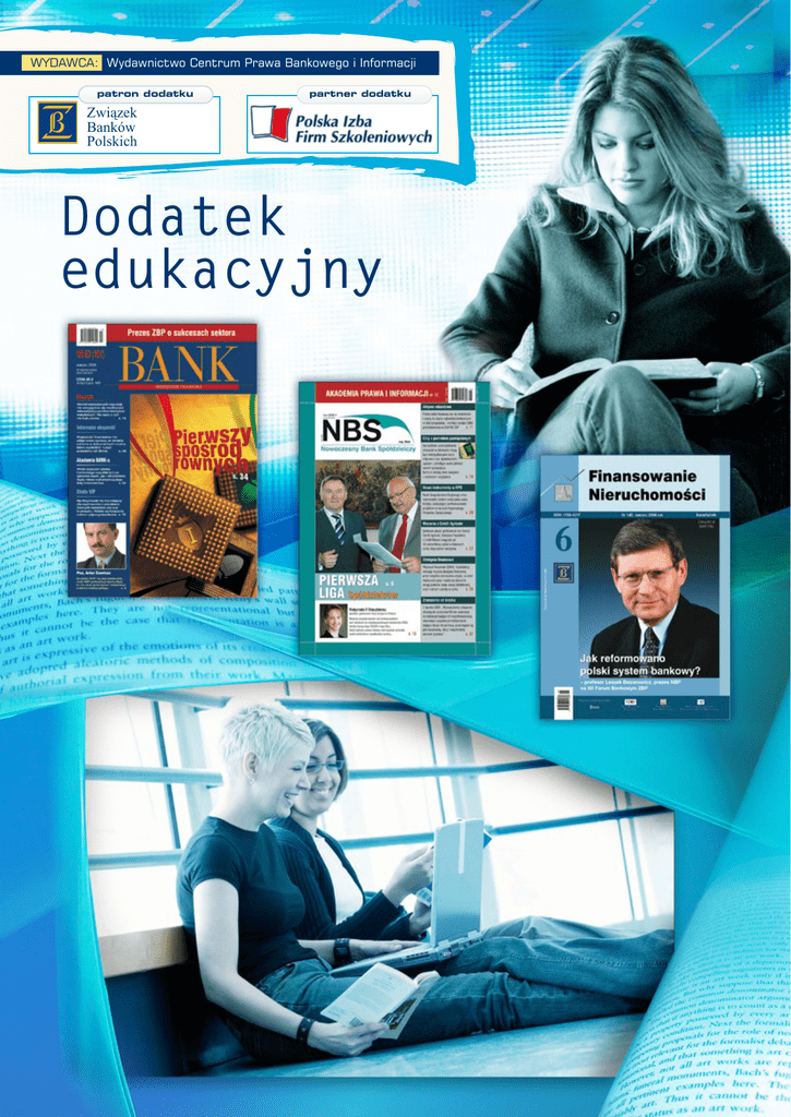 WYDAWCA: Wydawnictwo Centrum Prawa Bankowego i Informacji Wydawnictwo Centrum Prawa Bankowego i Informacji patron dodatku Związek Banków Polskich partner dodatku DANE WYDAWNICZE: Solec 101 / 5 00-382 Warszawa tel: (22) 629 18 75, (022) 629 18 72 fax:(022) 629 18 72 INTERNET: [email protected] [email protected] www.miesiecznikbank.pl Dodatek edukacyjny INFORMACJE MEDIALNE - DODATEK EDUKACYJNY - Wydawnictwo Centrum Prawa Bankowego i Informacji DANE WYDAWNICZE: Solec 101 / 5 00-382 Warszawa tel: (22) 629 18 75, (022) 629 18 72 fax:(022) 629 18 72 nazwa wydawca patron dodatku partner dodatku grupa docelowa INTERNET: [email protected] [email protected] www.miesiecznikbank.pl Dodatek edukacyjny Wydawnictwo Centrum Prawa Bankowego i Informacji Związek Banków Polskich Polska Izba Firm Szkoleniowych średnia i wyższa kadra menedżerska: banków i instytucji finansowych towarzystw ubezpieczeniowych funduszy inwestycyjnych firm leasingowych „74% menedżerów bankowych czyta conajmniej jedno z pism Wydawnictwa CPBiI” (PENTOR 2005) zasieg dodatkowe informacje idea zawartosc dodatku Miesięcznik Finansowy BANK Miesięcznik Nowoczesny Bank Spółdzielczy Finansowanie Nieruchomości Termin edycji: wrzesień 2006 Nakład: 5 000 egz. Wymiary: 200 x 270 mm Planowana objętość: 48 + 4 strony okładki Termin nadsyłania materiałów reklamowych: 31 sierpnia 2006 Ideą przyświecającą wydanie dodatku jest potrzeba ciągłego podwyższania umiejętności zawodowych pracowników z sektora bankowego i finansowego. Naszym zamiarem jest przedstawienie materiału informacyjnego, na który mają składać się propozycje ofert edukacyjnych: uczelni, instytucji zajmujących się organizacją specjalistycznych kursów i szkoleń oraz propozycje wydawnictw książkowych. rozmowy z przedstawicielami banków wywiady z rektorami uczelni zestawienie uczelni i kierunków przydatnych bankowcom informacje o firmach oferujących specjalistyczne kursy INFORMACJE MEDIALNE - DODATEK EDUKACYJNY - oraz szkolenia w tym również kursy językowe Wydawnictwo Centrum Prawa Bankowego i Informacji DANE WYDAWNICZE: Solec 101 / 5 00-382 Warszawa tel: (22) 629 18 75, (022) 629 18 72 fax:(022) 629 18 72 INTERNET: [email protected] [email protected] www.miesiecznikbank.pl Miesięcznik Finansowy BANK Ma∏e i Êrednie firmy NR 7/8 (153/154) lipiec/sierpieƒ 2005 NR INDEKSU 322628 ISSN 1230-9125 CENA 80 z∏ (w tym 0% VAT) MIESI¢CZNIK FINANSOWY Magazyn Miesięcznik Finansowy Bank to profesjonalne pismo środowiska bankowego istniejące już od ponad 13 lat. Porusza zasadnicze problemy rynku bankowego i instytucji finansowych w Polsce. NBP uruchomi∏ system p∏atnoÊci SORBNET–EURO umo˝liwiajàcy rozliczenia s. 10 w euro. Praktyka finansowa KPWiG sprawdza zasady wycen funduszy papierów d∏u˝nych opartych o instrumenty pochodne. s. 42 Technologie informatyczne Straty banków zwiàzane z kradzie˝à to˝samoÊci u˝ytkowników Internetu rosnà w tempie 25 proc. rocznie. s. 63 Nasze pismo patronuje wielu branżowym konferencjom, seminariom i targom. Jest znane i cenione na rynku, przez wielu uznawane za opiniotwórcze w swoim sektorze. Strefa VIP Polisy o charakterze kapita∏owym mogà byç rozsàdnà aletrnatywà dla innych inwestycji. s. 70 Czytelnikami miesięcznika są przede wszystkim wyższego i średniego szczebla menadżerowie banków i innych instytucji finansowych (m.in. towarzystw ubezpieczeniowych, funduszy inwestycyjnych, firm leasingowych), specjaliści, eksperci finansowi i gospodarczy oraz studenci i wykładowcy uczelni o profilu ekonomicznym. Jacek Bartkowiak BG˚ uwa˝a rosyjski rynek za bardzo obiecujàcy; ma swoje przedstawicielstwo w Moskwie. Nie wykluczamy ekspansji równie˝ do innych krajów zza wschodniej granicy np. na Ukrain´. Nr indeksu 374164 ISSN 1644 – 5325 Prenumerata redakcyjna NBS s. 5 Co wa˝y na wynikach? W strukturze wyników sektora BS-ów widoczny jest dynamiczny wzrost nale˝noÊci z tytu∏u dop∏at obszarowych i rozwoju akcji kredytów pomostowych. Strumieƒ Êrodków unijnych staje si´ równie˝ zauwa˝alny na rynku mi´dzybankowym. s. 8 Cena 20,00 z∏ luty 2006 Nowoczesny Bank Spółdzielczy Czas „kopania nisz” Pospieszna konsolidacja trzech zrzeszeƒ mog∏aby prowadziç do powstania du˝ej struktury, która szybko wpad∏aby w pu∏apk´ kosztów przewy˝szajàcych korzyÊci. s. 10 Bankowcu szkol si´! W centralach BS-ów zatrudniani sà przewa˝nie m∏odzi specjaliÊci. Wykszta∏cenie wy˝sze posiada 27 proc. pracowników, dla porównania: w bankach komercyjnych odsetek ten si´ga 70 proc. s. 12 WieÊ @ktywna Internet w gminie Stoszowice b´dzie rozprowadzany przez Êwiat∏owód o d∏ugoÊci 20 km, który po∏àczy wszystkie miejscowoÊci oraz instytucje. Do odbiorców indywidualnych sygna∏ elektroniczny dotrze drogà radiowà. s. 18 Âwiat bez wiedzy 114 mld euro do wzi´cia! s. 3 W latach 2007-2013 do Polski trafi 114 mld euro (rocznie 65 mld z∏), najwi´ksza w historii liczba funduszy strukturalnych pozyskanych przez jeden kraj Unii Europejskiej. s. 20 jest za trudny Miros∏aw Potulski Grupa czysto apeksowa Na poziomie sali operacyjnej banku uruchomiliÊmy stref´ samoobs∏ugi z wp∏atomatem oraz terminalami: transakcyjnym i informacyjnym. Dost´p do strefy jest mo˝liwy z wykorzystaniem kart chipowych przez 24 godziny na dob´. Banki spó∏dzielcze we W∏oszech sà samodzielnymi podmiotami, które podlegajà nadzorowi ze strony 15 federacji regionalnych. Istniejà te˝ dwa banki regionalne, do których przynale˝noÊç jest dobrowolna. s. 25 prezes zarzàdu PowiÊlaƒskiego Banku Spó∏dzielczego w Kwidzynie: s. 6 Finansowanie NieruchomoÊci ISSN 1733-4217 Kwartalnik Finansowanie Nieruchomości kwartalnik Nr 1(6) marzec 2006 rok 6 Jest to jedno z najlepszych i najlepiej odbieranych pism środowiska bankowości spółdzielczej. Jego zadaniem jest pomoc w unowocześnianiu tego sektora, kształcenie kadry w nim pracującej oraz profesjonalna dyskusja nad