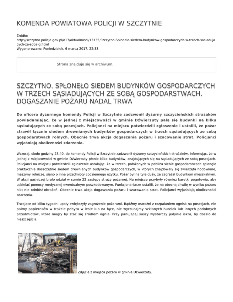 KOMENDA POWIATOWA POLICJI W SZCZYTNIE Źródło: http://szczytno.policja.gov.pl/o17/aktualnosci/13135,Szczytno-Splonelo-siedem-budynkow-gospodarczych-w-trzech-sasiaduja cych-ze-soba-g.html Wygenerowano: Poniedziałek, 6 marca 2017, 22:33 Strona znajduje się w archiwum. SZCZYTNO. SPŁONĘŁO SIEDEM BUDYNKÓW GOSPODARCZYCH W TRZECH SĄSIADUJĄCYCH ZE SOBĄ GOSPODARSTWACH. DOGASZANIE POŻARU NADAL TRWA Do oficera dyżurnego komendy Policji w Szczytnie zadzwonił dyżurny szczycieńskich strażaków powiadamiając, że w jednej z miejscowości w gminie Dźwierzuty palą się budynki na kilku sąsiadujących ze sobą posesjach. Policjanci na miejscu potwierdzili zgłoszenie i ustalili, że pożar strawił łącznie siedem drewnianych budynków gospodarczych w trzech sąsiadujących ze sobą gospodarstwach rolnych. Obecnie trwa akcja dogaszania pożaru i szacowanie strat. Policjanci wyjaśniają okoliczności zdarzenia. Wczoraj, około godziny 23.40, do komendy Policji w Szczytnie zadzwonił dyżurny szczycieńskich strażaków, informując, że w jednej z miejscowości w gminie Dźwierzuty płonie kilka budynków, znajdujących się na sąsiadujących ze sobą posesjach. Policjanci na miejscu potwierdzili zgłoszenie ustalając, że w trzech, położonych w pobliżu siebie gospodarstwach spłonęło praktycznie doszczętnie siedem drewnianych budynków gospodarczych, w których znajdowały się zwierzęta hodowlane, maszyny rolnicze, siano o inne przedmioty codziennego użytku. Pożar był na tyle duży, że zagrażał budynkom mieszkalnym. W akcji gaśniczej brało udział w sumie 22 zastępy straży pożarnej. Na miejsce przybyły również karetki pogotowia, aby udzielać pomocy medycznej ewentualnym poszkodowanym. Funkcjonariusze ustalili, że na obecną chwilę w wyniku pożaru nikt nie odniósł obrażeń. Obecnie trwa akcja dogaszania pożaru i szacowanie strat. Policjanci wyjaśniają okoliczności zdarzenia. Trwające od kilku tygodni upały zwiększyły zagrożenie pożarami. Bądźmy ostrożni z rozpalaniem ognisk na posesjach, nie palmy papierosów w trakcie pobytu w lesie lub na łące, nie wyrzucajmy szklanych butelek lub innych podobnych przedmiotów, które mogły by stać się źródłem ognia. Przy panującej suszy wystarczy jedynie iskra, by doszło do nieszczęścia. Zdjęcie z miejsca pożaru w gminie Dźwierzuty. Zdjęcie z miejsca pożaru w gminie Dźwierzuty. Zdjęcie z miejsca pożaru w gminie Dźwierzuty. Zdjęcie z miejsca pożaru w gminie Dźwierzuty. Zdjęcie z miejsca pożaru w gminie Dźwierzuty. Zdjęcie z miejsca pożaru w gminie Dźwierzuty. Zdjęcie z miejsca pożaru w gminie Dźwierzuty. Zdjęcie z miejsca pożaru w gminie Dźwierzuty. Zdjęcie z miejsca pożaru w gminie Dźwierzuty. Zdjęcie z miejsca pożaru w gminie Dźwierzuty. Zdjęcie z miejsca pożaru w gminie Dźwierzuty. Ocena: 0/5 (0) Tweetnij