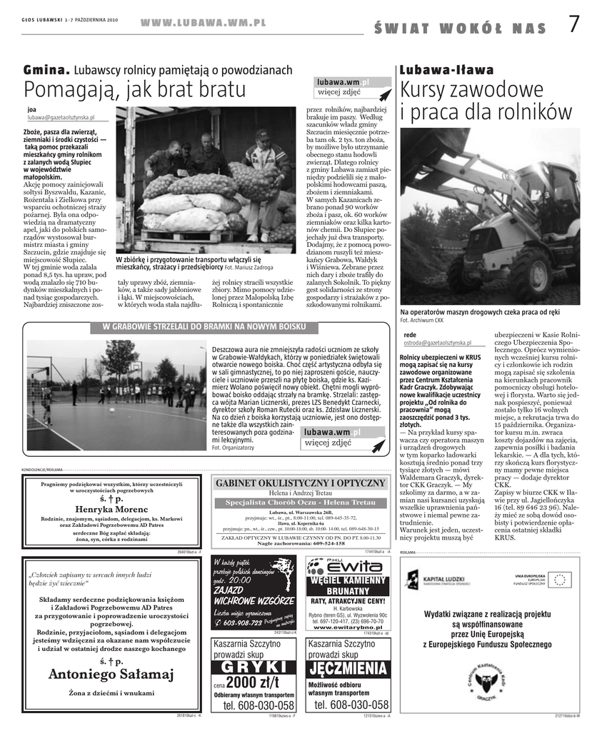 W W W. L U B A W A . W M . P L G Ł O S L U B A W S K I 1 - 7 PAŹDZIERNIKA 2010 Gmina. Lubawscy rolnicy pamiętają o powodzianach Pomagają, jak brat bratu [email protected] W zbiórkę i przygotowanie transportu włączyli się mieszkańcy, strażacy i przedsiębiorcy Fot. Mariusz Zadroga tały uprawy zbóż, ziemniaków, a także sady jabłoniowe i łąki. W miejscowościach, w których woda stała najdłu- lubawa.wm.pl więcej zdjęć joa Zboże, pasza dla zwierząt, ziemniaki i środki czystości — taką pomoc przekazali mieszkańcy gminy rolnikom z zalanych wodą Słupiec w województwie małopolskim. Akcję pomocy zainicjowali sołtysi Byszwałdu, Kazanic, Rożentala i Zielkowa przy wsparciu ochotniczej straży pożarnej. Była ona odpowiedzią na dramatyczny apel, jaki do polskich samorządów wystosował burmistrz miasta i gminy Szczucin, gdzie znajduje się miejscowość Słupiec. W tej gminie woda zalała ponad 8,5 tys. ha upraw, pod wodą znalazło się 710 budynków mieszkalnych i ponad tysiąc gospodarczych. Najbardziej zniszczone zos- 7 ŚWIAT WOKÓŁ NAS żej rolnicy stracili wszystkie zbiory. Mimo pomocy udzielonej przez Małopolską Izbę Rolniczą i spontanicznie przez rolników, najbardziej brakuje im paszy. Według szacunków władz gminy Szczucin miesięcznie potrzeba tam ok. 2 tys. ton zboża, by możliwe było utrzymanie obecnego stanu hodowli zwierząt. Dlatego rolnicy z gminy Lubawa zamiast pieniędzy podzielili się z małopolskimi hodowcami paszą, zbożem i ziemniakami. W samych Kazanicach zebrano ponad 90 worków zboża i pasz, ok. 60 worków ziemniaków oraz kilka kartonów chemii. Do Słupiec pojechały już dwa transporty. Dodajmy, że z pomocą powodzianom ruszyli też mieszkańcy Grabowa, Wałdyk i Wiśniewa. Zebrane przez nich dary i zboże trafiły do zalanych Sokolnik. To piękny gest solidarności ze strony gospodarzy i strażaków z poszkodowanymi rolnikami. Lubawa-Iława Kursy zawodowe i praca dla rolników Na operatorów maszyn drogowych czeka praca od ręki Fot. Archiwum CKK W GRABOWIE STRZELALI DO BRAMKI NA NOWYM BOISKU rede [email protected] Deszczowa aura nie zmniejszyła radości uczniom ze szkoły w Grabowie-Wałdykach, którzy w poniedziałek świętowali otwarcie nowego boiska. Choć część artystyczna odbyła się w sali gimnastycznej, to po niej zaproszeni goście, nauczyciele i uczniowie przeszli na płytę boiska, gdzie ks. Kazimierz Wolano poświęcił nowy obiekt. Chętni mogli wypróbować boisko oddając strzały na bramkę. Strzelali: zastępca wójta Marian Licznerski, prezes LZS Benedykt Czarnecki, dyrektor szkoły Roman Rutecki oraz ks. Zdzisław Licznerski. Na co dzień z boiska korzystają uczniowie, jest ono dostępne także dla wszystkich zainteresowanych poza godzina- lubawa.wm.pl mi lekcyjnymi. więcej zdjęć Fot. Organizatorzy KONDOLENCJE/REKLAMA Pragniemy podziękować wszystkim, którzy uczestniczyli w uroczystościach pogrzebowych ś. † p. Henryka Morenc Rodzinie, znajomym, sąsiadom, delegacjom, ks. Markowi oraz Zakładowi Pogrzebowemu AD Patres serdeczne Bóg zapłać składają: żona, syn, córka z rodzinami GABINET OKULISTYCZNY I OPTYCZNY Helena i Andrzej Tretau Specjalista Chorób Oczu - Helena Tretau Lubawa, ul. Warszawska 26B, przyjmuje: wt., śr., pt., 8:00-11:00, tel. 089-645-35-72, Iława, ul. Kopernika 6a przyjmuje: pn., wt., śr., czw., pt. 10:00-18:00, sb. 10:00- 14:00, tel. 089-648-30-15 ZAKŁAD OPTYCZNY W LUBAWIE CZYNNY OD PN. DO PT. 8.00-11.30 Nagłe zachorowania: 609-524-158 174410luzl-a -A 264010luzl-a -F W każdy piątek przeboje polskich dancingów godz. 20:00 „Człowiek zapisany w sercach innych ludzi będzie żyć wiecznie“ Składamy serdeczne podziękowania księżom i Zakładowi Pogrzebowemu AD Patres za przygotowanie i poprowadzenie uroczystości pogrzebowej. Rodzinie, przyjaciołom, sąsiadom i delegacjom jesteśmy wdzięczni za okazane nam współczucie i udział w ostatniej drodze naszego kochanego ZAJAZD WICHROWE WZGÓRZE Liczba miejsc ograniczona pisy ujemy za O 603-908-723 Przyjm na andrzejki 243110luzl-J-K Antoniego Sałamaj Żona z dziećmi i wnukami H. Karbowska Rybno (teren GS), ul. Wyzwolenia 90c tel. 697-120-417, (23) 696-70-70 www.ewitarybno.pl 174310luzl-a -W cena Możliwość odbioru własnym transportem tel. 608-030-058 261810luzl-c -K RATY, ATRAKCYJNE CENY! Kaszarnia Szczytno prowadzi skup Odbieramy własnym transportem 119810szws-a -F REKLAMA WĘGIEL KAMIENNY BRUNATNY Kaszarnia Szczytno prowadzi skup GRYKI 2000 zł/t ś. † p. Rolnicy ubezpieczeni w KRUS mogą zapisać się na kursy zawodowe organizowane przez Centrum Kształcenia Kadr Graczyk. Zdobywając nowe kwalifikacje uczestnicy projektu „Od rolnika do pracownia“ mogą zaoszczędzić ponad 3 tys. złotych. — Na przykład kursy spawacza czy operatora maszyn i urządzeń drogowych w tym koparko ładowarki kosztują średnio ponad trzy tysiące złotych — mówi Waldemara Graczyk, dyrektor CKK Graczyk. — My szkolimy za darmo, a w zamian nasi kursanci uzyskują wszelkie uprawnienia państwowe i niemal pewne zatrudnienie. Warunek jest jeden, uczestnicy projektu muszą być ubezpieczeni w Kasie Rolniczego Ubezpieczenia Społecznego. Oprócz wymienionych wcześniej kursu rolnicy i członkowie ich rodzin mogą zapisać się szkolenia na kierunkach pracownik pomocniczy obsługi hotelowej i florysta. Warto się jednak pospieszyć, ponieważ zostało tylko 16 wolnych miejsc, a rekrutacja trwa do 15 października. Organizator kursu m.in. zwraca koszty dojazdów na zajęcia, zapewnia posiłki i badania lekarskie. — A dla tych, którzy skończą kurs florystyczny mamy pewne miejsca pracy — dodaje dyrektor CKK. Zapisy w biurze CKK w Iławie przy ul. Jagiellończyka 16 (tel. 89 646 23 96). Należy mieć ze sobą dowód osobisty i potwierdzenie opłacenia ostatniej składki KRUS. Wydatki związane z realizacją projektu są współfinansowane przez Unię Europejską z Europejskiego Funduszu Społecznego JĘCZ