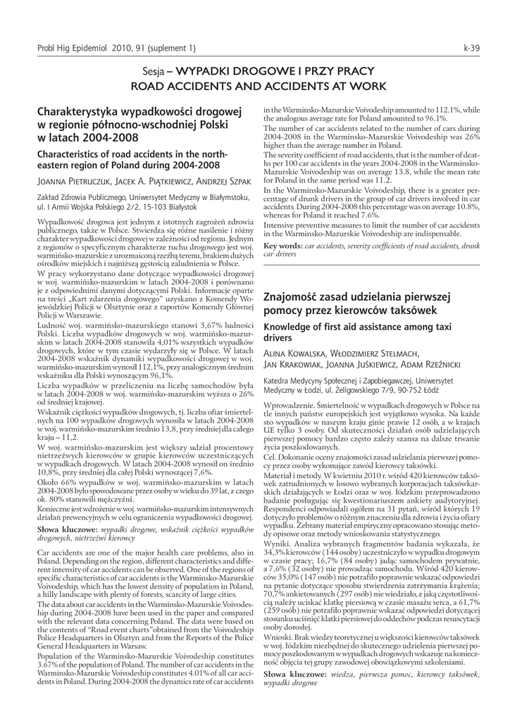 Probl Hig Epidemiol 2010, 91 (suplement 1) k-39 Sesja – WYPADKI DROGOWE I PRZY PRACY ROAD ACCIDENTS AND ACCIDENTS AT WORK Charakterystyka wypadkowości drogowej w regionie północno-wschodniej Polski w latach 2004-2008 Characteristics of road accidents in the northeastern region of Poland during 2004-2008 Joanna Pietruczuk, Jacek A. Piątkiewicz, Andrzej Szpak Zakład Zdrowia Publicznego, Uniwersytet Medyczny w Białymstoku, ul. I Armii Wojska Polskiego 2/2, 15-103 Białystok Wypadkowość drogowa jest jednym z istotnych zagrożeń zdrowia publicznego, także w Polsce. Stwierdza się różne nasilenie i różny charakter wypadkowości drogowej w zależności od regionu. Jednym z regionów o specyficznym charakterze ruchu drogowego jest woj. warmińsko-mazurskie z urozmaiconą rzeźbą terenu, brakiem dużych ośrodków miejskich i najniższą gęstością zaludnienia w Polsce. W pracy wykorzystano dane dotyczące wypadkowości drogowej w woj. warmińsko-mazurskim w latach 2004-2008 i porównano je z odpowiednimi danymi dotyczącymi Polski. Informacje oparte na treści „Kart zdarzenia drogowego” uzyskano z Komendy Wojewódzkiej Policji w Olsztynie oraz z raportów Komendy Głównej Policji w Warszawie. Ludność woj. warmińsko-mazurskiego stanowi 3,67% ludności Polski. Liczba wypadków drogowych w woj. warmińsko-mazurskim w latach 2004-2008 stanowiła 4,01% wszystkich wypadków drogowych, które w tym czasie wydarzyły się w Polsce. W latach 2004-2008 wskaźnik dynamiki wypadkowości drogowej w woj. warmińsko-mazurskim wynosił 112,1%, przy analogicznym średnim wskaźniku dla Polski wynoszącym 96,1%. Liczba wypadków w przeliczeniu na liczbę samochodów była w latach 2004-2008 w woj. warmińsko-mazurskim wyższa o 26% od średniej krajowej. Wskaźnik ciężkości wypadków drogowych, tj. liczba ofiar śmiertelnych na 100 wypadków drogowych wynosiła w latach 2004-2008 w woj. warmińsko-mazurskim średnio 13,8, przy średniej dla całego kraju – 11,2. W woj. warmińsko-mazurskim jest większy udział procentowy nietrzeźwych kierowców w grupie kierowców uczestniczących w wypadkach drogowych. W latach 2004-2008 wynosił on średnio 10,8%, przy średniej dla całej Polski wynoszącej 7,6%. Około 66% wypadków w woj. warmińsko-mazurskim w latach 2004‑2008 było spowodowane przez osoby w wieku do 39 lat, z czego ok. 80% stanowili mężczyźni. Konieczne jest wdrożenie w woj. warmińsko-mazurskim intensywnych działań prewencyjnych w celu ograniczenia wypadkowości drogowej. Słowa kluczowe: wypadki drogowe, wskaźnik ciężkości wypadków drogowych, nietrzeźwi kierowcy Car accidents are one of the major health care problems, also in Poland. Depending on the region, different characteristics and different intensity of car accidents can be observed. One of the regions of specific characteristics of car accidents is the Warminsko-Mazurskie Voivodeship, which has the lowest density of population in Poland, a hilly landscape with plenty of forests, scarcity of large cities. The data about car accidents in the Warminsko-Mazurskie Voivodeship during 2004-2008 have been used in the paper and compared with the relevant data concerning Poland. The data were based on the contents of “Road event charts”obtained from the Voivodeship Police Headquarters in Olsztyn and from the Reports of the Police General Headquarters in Warsaw. Population of the Warminsko-Mazurskie Voivodeship constitutes 3.67% of the population of Poland. The number of car accidents in the Warminsko-Mazurskie Voivodeship constitutes 4.01% of all car accidents in Poland. During 2004-2008 the dynamics rate of car accidents in the Warminsko-Mazurskie Voivodeship amounted to 112.1%, while the analogous average rate for Poland amounted to 96.1%. The number of car accidents related to the number of cars during 2004-2008 in the Warminsko-Mazurskie Voivodeship was 26% higher than the average number in Poland. The severity coefficient of road accidents, that is the number of deaths per 100 car accidents in the years 2004-2008 in the WarminskoMazurskie Voivodeship was on average 13.8, while the mean rate for Poland in the same period was 11.2. In the Warminsko-Mazurskie Voivodeship, there is a greater percentage of drunk drivers in the group of car drivers involved in car accidents. During 2004-2008 this percentage was on average 10.8%, whereas for Poland it reached 7.6%. Intensive preventive measures to limit the number of car accidents in the Warminsko-Mazurskie Voivodeship are indispensable. Key words: car accidents, severity coefficients of road accidents, drunk car drivers Znajomość zasad udzielania pierwszej pomocy przez kierowców taksówek Knowledge of first aid assistance among taxi drivers Alina Kowalska, Włodzimierz Stelmach, Jan Krakowiak, Joanna Juśkiewicz, Adam Rzeźnicki Katedra Medycyny Społecznej i Zapobiegawczej, Uniwersytet Medyczny w Łodzi, ul. Żeligowskiego 7/9, 90-752 Łódź Wprowadzenie. Śmiertelność w wypadkach drogowych w Polsce na tle innych państw europejskich jest wyjątkowo wysoka. Na każde sto wypadków w naszym kraju ginie prawie 12 osób, a w krajach UE tylko 3 osoby. Od skuteczności działań osób udzielających pierwszej pomocy bardzo często zależy szansa na dalsze trwanie życia poszkodowanych. Cel. Dokonanie oceny znajomości zasad udzielania pierwszej pomocy przez osoby wykonujące zawód kierowcy taksówki. Materiał i metody. W kwietniu 2010 r. wśród 420 kierowców taksówek zatrudnionych w losowo wybranych korporacjach taksówkarskich działających w Łodzi oraz w woj. łódzkim przeprowadzono badanie posługując się kwestionariuszem ankiety audytoryjnej. Respondenci odpowiadali ogółem na 31 pytań, wśród których 19 dotyczyło problemów o różnym znaczeniu dla zdrowia i życia ofiary wypadku. Zebrany materiał empiryczny opracowano stosując metody opisowe oraz metody wnioskowania statystycznego. Wyniki. Analiza wybranych fragmentów badania wyka