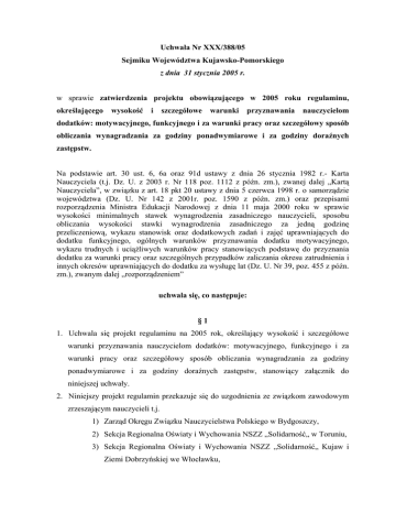 Uchwała Nr XXX/388/05 Sejmiku Województwa Kujawsko-Pomorskiego z dnia 31 stycznia 2005 r. w sprawie zatwierdzenia projektu obowiązującego w 2005 roku regulaminu, określającego wysokość i szczegółowe warunki przyznawania nauczycielom dodatków: motywacyjnego, funkcyjnego i za warunki pracy oraz szczegółowy sposób obliczania wynagradzania za godziny ponadwymiarowe i za godziny doraźnych zastępstw. Na podstawie art. 30 ust. 6, 6a oraz 91d ustawy z dnia 26 stycznia 1982 r.- Karta Nauczyciela (t.j. Dz. U. z 2003 r. Nr 118 poz. 1112 z późn. zm.), zwanej dalej „Kartą Nauczyciela”, w związku z art. 18 pkt 20 ustawy z dnia 5 czerwca 1998 r. o samorządzie województwa (Dz. U. Nr 142 z 2001r. poz. 1590 z późn. zm.) oraz przepisami rozporządzenia Ministra Edukacji Narodowej z dnia 11 maja 2000 roku w sprawie wysokości minimalnych stawek wynagrodzenia zasadniczego nauczycieli, sposobu obliczania wysokości stawki wynagrodzenia zasadniczego za jedną godzinę przeliczeniową, wykazu stanowisk oraz dodatkowych zadań i zajęć uprawniających do dodatku funkcyjnego, ogólnych warunków przyznawania dodatku motywacyjnego, wykazu trudnych i uciążliwych warunków pracy stanowiących podstawę do przyznania dodatku za warunki pracy oraz szczególnych przypadków zaliczania okresu zatrudnienia i innych okresów uprawniających do dodatku za wysługę lat (Dz. U. Nr 39, poz. 455 z późn. zm.), zwanym dalej „rozporządzeniem” uchwala się, co następuje: §1 1. Uchwala się projekt regulaminu na 2005 rok, określający wysokość i szczegółowe warunki przyznawania nauczycielom dodatków: motywacyjnego, funkcyjnego i za warunki pracy oraz szczegółowy sposób obliczania wynagradzania za godziny ponadwymiarowe i za godziny doraźnych zastępstw, stanowiący załącznik do niniejszej uchwały. 2. Niniejszy projekt regulamin przekazuje się do uzgodnienia ze związkom zawodowym zrzeszającym nauczycieli t.j. 1) Zarząd Okręgu Związku Nauczycielstwa Polskiego w Bydgoszczy, 2) Sekcja Regionalna Oświaty i Wychowania NSZZ „Solidarność„ w Toruniu, 3) Sekcja Regionalna Oświaty i Wychowania NSZZ „Solidarność„ Kujaw i Ziemi Dobrzyńskiej we Włocławku, 4) Komisja Międzyzakładowa Pracowników Oświaty i Wychowania NSZZ „Solidarność” w Bydgoszczy 5) Wolny Związek Zawodowy „Solidarność-Oświata” w Bydgoszczy. §2 Wykonanie uchwały powierza się Wicemarszałkowi Pomorskiego Janowi Szopińskiemu. §3 Uchwała wchodzi w życie z dniem podjęcia. Województwa Kujawsko- Uzasadnienie W związku ze zmianą art. 30 ust. 6 Karty nauczyciela, na organie prowadzącym spoczywa obowiązek ustalenia w drodze regulaminu obowiązującego od dnia 1 stycznia do dnia 31 grudnia każdego roku, szczegółowych kryteriów określających zasady przyznawania nauczycielom dodatków: motywacyjnego, funkcyjnego i za warunki pracy oraz niektórych innych składników wynagrodzenia a także wysokości, szczegółowych zasad przyznawania i wypłacania dodatku mieszkaniowego. Zgodnie z art. 30 ust. 6a powyższej ustawy, zapisy regulaminu podlegają uzgodnieniom ze związkami zawodowymi zrzeszającymi nauczycieli. W powyższej uchwale nie ujęto zasad przyznawania i wypłacania dodatku mieszkaniowego z uwagi na fakt, iż Samorząd Województwa nie jest organem prowadzącym dla szkół na terenach wiejskich i w miejscowościach do 5 000 mieszkańców. Tabelę zaszeregowania oraz minimalne stawki wynagrodzenia zasadniczego dla nauczycieli, a także zasady ustalania wysokości wynagrodzenia zasadniczego nauczyciela określa „rozporządzenie”. Wysokość, warunki oraz zasady wypłacania nauczycielom: 1. dodatku za wysługę lat, 2. dodatkowego wynagrodzenia w porze nocnej, 3. nagród jubileuszowych, 4. dodatkowego wynagrodzenia rocznego, 5. zasiłku na zagospodarowanie, 6. odpraw z tytułu rozwiązania stosunku pracy, 7. odpraw z tytułu przejścia na emeryturę lub rentę , określają odpowiednie przepisy Karty Nauczyciela oraz przepisy „rozporządzenia”. Wysokość, warunki oraz zasady wypłacania nauczycielom dotychczasowych dodatków specjalistycznych reguluje przepis art. 9 ustawy z dnia 18 lutego 2000 r. o zmianie ustawyKarta nauczyciela oraz o zmianie niektórych ustaw (DZ. U. Nr 19, poz.239). W związku z powyższym, niezbędne jest uchwalenie przez Sejmik Województwa projektu w.w regulaminu. Projekt ten będzie podlegał uzgodnieniom ze związkami zawodowymi zrzeszającymi nauczycieli.