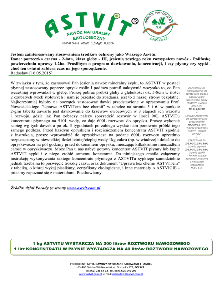 Jestem zainteresowany stosowaniem środków ochrony jako Waszego Asvitu. Dane: porzeczka czarna - 2-lata, klasa gleby - III, jesienią zeszłego roku rozsypałem nawóz - Polifoskę, powierzchnia uprawy 1.2ha. Prosiłbym o program dawkowania, koncentracji, i czy płynny czy sypki choć ten ostatni zabiera czas na jego sporządzenie. Radosław [16.05.2015] W związku z tym, że zastosował Pan jesienią nawóz mineralny sypki, to ASTVIT w postaci płynnej zastosowany poprzez oprysk roślin i podłoża potrafi uaktywnić wszystko to, co Pan wcześniej wprowadził w glebę. Proszę pobrać próbki gleby z głębokości ok. 5-8cm w ilości 2 czubatych łyżek stołowych i nam je przesłać do zbadania, jest to z naszej strony bezpłatne. Najkorzystniej byłoby na początek zastosować dawki przedstawione w opracowaniu Prof. Nowosielskiego "Uprawa ASTVITem bez chemii" w tabelce na stronie 5 i 6. w punkcie 2-gim tabelki zawarte jest dawkowanie do krzewów owocowych w 3 etapach ich wzrostu i rozwoju, gdzie jak Pan zobaczy należy sporządzić roztwór w ilości 90L ASTVITu koncentratu płynnego na 510L wody, co daje 600L roztworu do oprysku. Proszę wykonać zabieg wg tych dawek a po ok. 3 tygodniach po zabiegu wysłać nam ponownie próbki tego samego podłoża. Przed każdym opryskiem i rozcieńczeniem koncentratu ASTVIT zgodnie z instrukcją, proszę wprowadzić do opryskiwacza na podane 600L roztworu uprzednio rozpuszczony w niewielkiej ilości letniej/ciepłej wody 1kg cukru (np. w wiadrze) i dolać to do opryskiwacza na pół godziny przed dokonaniem oprysku, mieszając kilkakrotnie mieszadłem całość w opryskiwaczu. Może Pan u nas nabyć gotowy koncentrat ASTVIT płynny lub kupić ASTVIT sypki i z niego zrobić samemu koncentrat. Do niniejszego emaila załączamy instrukcję wykonywania takiego koncentratu płynnego z ASTVITu sypkiego samodzielnie jednak trzeba na to poświęcić troszkę czasu, oraz dokument "Uprawa bez chemii ASTVITem" z tabelką, o której wyżej pisaliśmy, certyfikaty ekologiczne, i inne materiały o ASTVICIE prosimy zapoznać się z materiałami. Pozdrawiamy. Zezwolenie na wprowadzenie do obrotu jako środek poprawiający właściwości gleby "ASTVIT" wydane przez MR Nr G-134/10 * Decyzja zezwolenia do obrotu wydana przez MRiRW Nr299/12 jako "Nawóz organiczny ASTVIT - nawóz płynny" * CERTYFIKAT Nr Z/13/20129/15/PC (nawóz płynny) Z/13/20128/15/PC (nawóz sypki) - Potwierdzające zgodność z Ustawą o nawozach i nawożeniu PCBC S.A. Źródło: dział Porady ze strony www.astvit.com.pl 1 kg ASTVITU WYSTARCZA NA 200 litrów ROZTWORU NAWOZOWEGO 1 litr KONCENTRATU W PŁYNIE WYSTARCZA NA 40 litrów ROZTWORU NAWOZOWEGO PRODUCENT: AST R. NAWOZY NATURALNE PAKOWANIE I HANDEL 63-400 Ostrów Wielkopolski, ul. Gorzycka 173, POLSKA tel. (62) 735 54 32 tel. kom. 605 546 095 www.astvit.com.pl e-mail: [email protected]