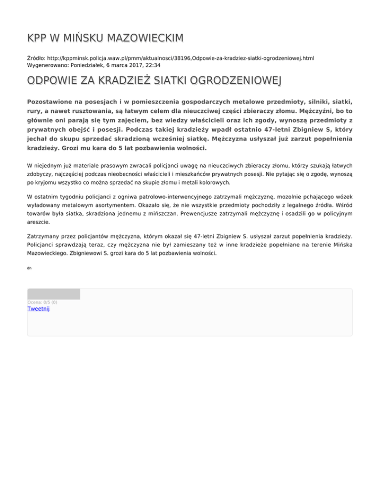 KPP W MIŃSKU MAZOWIECKIM Źródło: http://kppminsk.policja.waw.pl/pmm/aktualnosci/38196,Odpowie-za-kradziez-siatki-ogrodzeniowej.html Wygenerowano: Poniedziałek, 6 marca 2017, 22:34 ODPOWIE ZA KRADZIEŻ SIATKI OGRODZENIOWEJ Pozostawione na posesjach i w pomieszczenia gospodarczych metalowe przedmioty, silniki, siatki, rury, a nawet rusztowania, są łatwym celem dla nieuczciwej części zbieraczy złomu. Mężczyźni, bo to głównie oni parają się tym zajęciem, bez wiedzy właścicieli oraz ich zgody, wynoszą przedmioty z prywatnych obejść i posesji. Podczas takiej kradzieży wpadł ostatnio 47-letni Zbigniew S, który jechał do skupu sprzedać skradzioną wcześniej siatkę. Mężczyzna usłyszał już zarzut popełnienia kradzieży. Grozi mu kara do 5 lat pozbawienia wolności. W niejednym już materiale prasowym zwracali policjanci uwagę na nieuczciwych zbieraczy złomu, którzy szukają łatwych zdobyczy, najczęściej podczas nieobecności właścicieli i mieszkańców prywatnych posesji. Nie pytając się o zgodę, wynoszą po kryjomu wszystko co można sprzedać na skupie złomu i metali kolorowych. W ostatnim tygodniu policjanci z ogniwa patrolowo-interwencyjnego zatrzymali mężczyznę, mozolnie pchającego wózek wyładowany metalowym asortymentem. Okazało się, że nie wszystkie przedmioty pochodziły z legalnego źródła. Wśród towarów była siatka, skradziona jednemu z mińszczan. Prewencjusze zatrzymali mężczyznę i osadzili go w policyjnym areszcie. Zatrzymany przez policjantów mężczyzna, którym okazał się 47-letni Zbigniew S. usłyszał zarzut popełnienia kradzieży. Policjanci sprawdzają teraz, czy mężczyzna nie był zamieszany też w inne kradzieże popełniane na terenie Mińska Mazowieckiego. Zbigniewowi S. grozi kara do 5 lat pozbawienia wolności. dn Ocena: 0/5 (0) Tweetnij