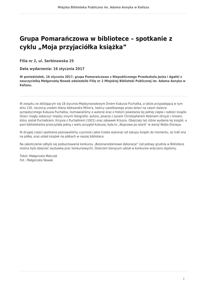 Miejska Biblioteka Publiczna im. Adama Asnyka w Kaliszu Grupa Pomarańczowa w bibliotece – spotkanie z cyklu „Moja przyjaciółka książka” Filia nr 2, ul. Serbinowska 25 Data wydarzenia: 16 stycznia 2017 W poniedziałek, 16 stycznia 2017, grupa Pomarańczowa z Niepublicznego Przedszkola Jacka i Agatki z nauczycielką Małgorzatą Nowak odwiedziła Filię nr 2 Miejskiej Biblioteki Publicznej im. Adama Asnyka w Kaliszu. W związku ze zbliżającym się 18 stycznia Międzynarodowym Dniem Kubusia Puchatka, a także przypadającą w tym dniu 135. rocznicą urodzin Alana Aleksandra Milne'a, twórcy uwielbianego przez dzieci na całym świecie sympatycznego Kubusia Puchatka, rozmawialiśmy o autorze oraz o historii powstania tej pełnej ciepła i radości książki. Dzieci mogły zobaczyć między innymi fotografie: autora, pisarza z synem Christopherem Robinem (Krzyś) i misiem, który został Puchatkiem; Krzysia z Puchatkiem (1921) oraz zabawek Krzysia. Obejrzały też różne wydania tej książki, a pani bibliotekarka przeczytała jedną z wielu przygód Kubusia, była to „Wyprawa po skarb” w wersji Walta Disneya. W drugiej części spotkania poznawaliśmy czynności jakie trzeba wykonać od zakupu książki do momentu, aż trafi ona na półkę, oraz układ książek na półkach w naszej bibliotece. Na zakończenie odbyło się podsumowanie konkursu „Bożonarodzeniowe dekoracje” (od połowy grudnia w Bibliotece można było obejrzeć wystawkę prac konkursowych). Dzieciom biorącym udział w konkursie wręczono dyplomy. Tekst: Małgorzata Matczak Fot.: Małgorzata Nowak 1