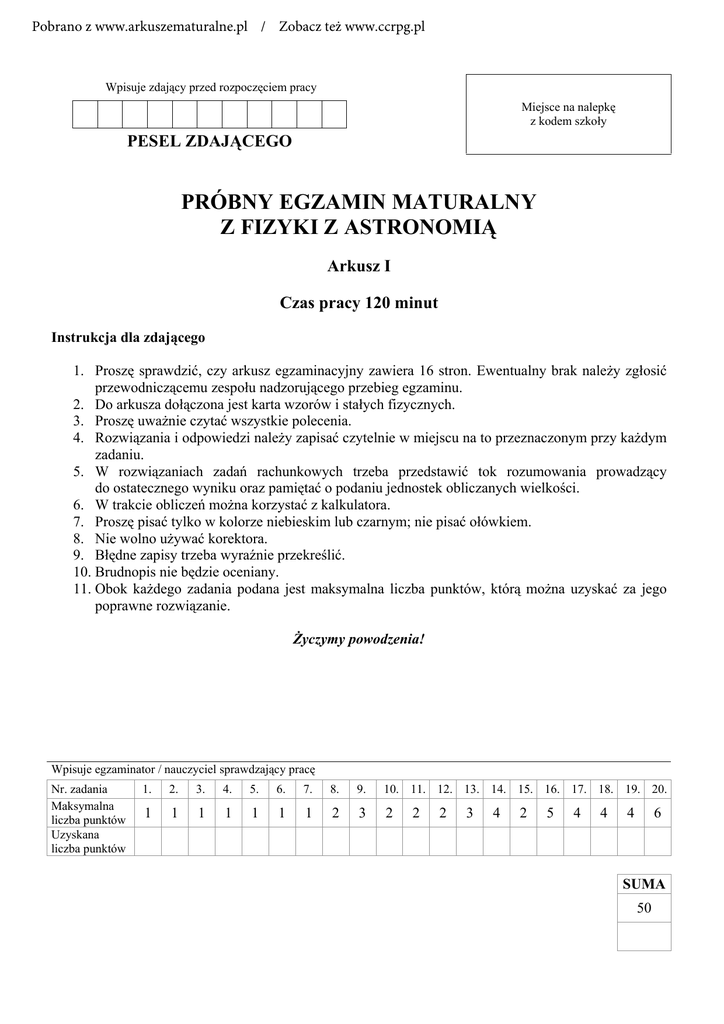 Pobrano z www.arkuszematuralne.pl / Zobacz też www.ccrpg.pl Wpisuje zdający przed rozpoczęciem pracy Miejsce na nalepkę z kodem szkoły PESEL ZDAJĄCEGO PRÓBNY EGZAMIN MATURALNY Z FIZYKI Z ASTRONOMIĄ Arkusz I Czas pracy 120 minut Instrukcja dla zdającego 1. Proszę sprawdzić, czy arkusz egzaminacyjny zawiera 16 stron. Ewentualny brak należy zgłosić przewodniczącemu zespołu nadzorującego przebieg egzaminu. 2. Do arkusza dołączona jest karta wzorów i stałych fizycznych. 3. Proszę uważnie czytać wszystkie polecenia. 4. Rozwiązania i odpowiedzi należy zapisać czytelnie w miejscu na to przeznaczonym przy każdym zadaniu. 5. W rozwiązaniach zadań rachunkowych trzeba przedstawić tok rozumowania prowadzący do ostatecznego wyniku oraz pamiętać o podaniu jednostek obliczanych wielkości. 6. W trakcie obliczeń można korzystać z kalkulatora. 7. Proszę pisać tylko w kolorze niebieskim lub czarnym; nie pisać ołówkiem. 8. Nie wolno używać korektora. 9. Błędne zapisy trzeba wyraźnie przekreślić. 10. Brudnopis nie będzie oceniany. 11. Obok każdego zadania podana jest maksymalna liczba punktów, którą można uzyskać za jego poprawne rozwiązanie. Życzymy powodzenia! Wpisuje egzaminator / nauczyciel sprawdzający pracę Nr. zadania Maksymalna liczba punktów Uzyskana liczba punktów 1. 2. 3. 4. 5. 6. 7. 8. 9. 10. 11. 12. 13. 14. 15. 16. 17. 18. 19. 20. 1 1 1 1 1 1 1 2 3 2 2 2 3 4 2 5 4 4 4 6 SUMA 50 Zadanie 1. (1 pkt) Z wysokości h rzucono dwie piłki z prędkościami o tej samej wartości vo – jedną pionowo do góry, a drugą pionowo w dół. Jeśli nie uwzględnimy oporu powietrza, to o wartościach prędkości v1 i v2 piłek w chwili upadku na ziemię możemy powiedzieć, że A. v1 < v2 B. v1 > v2 C. v1 = v2 D. prędkości zależą od mas piłek. Zadanie 2. (1 pkt) Długość wskazówki minutowej zegara na wieży kościelnej wynosi 1,2 m, a godzinowej 1 m. Stosunek wartości prędkości liniowej końca wskazówki godzinowej do minutowej wynosi A. 1 : 12 B. 1 : 14,4 C. 1,2 : 1 D. 6,28 : 1,2 Zadanie 3. (1 pkt) Skrzynię o masie m przesuwamy ruchem jednostajnym na odległość s, raz pchając ją z siłą skierowaną poziomo, a drugi raz ciągnąc z siłą o tej samej wartości skierowaną pod kątem 600 do poziomu. O pracach W1 i W2 wykonanych w obu przypadkach możemy powiedzieć, że A. W1 = W2 B. W1 = 2W2 C. W1 = 1 W2 2 D. W2 = 2W1 Zadanie 4. (1 pkt) Jeśli ciało rzucone pionowo do góry z prędkością o wartości vo wzniosło się na pewną wysokość h blisko powierzchni Ziemi, to na planecie o przyspieszeniu grawitacyjnym 2 razy większym niż na Ziemi wzniosłoby się na wysokość hp. Pomiędzy tymi wysokościami zachodzi zależność A. hp = 2h B. hp = h C. hp = h 2 D. hp = h 4 Zadanie 5. (1 pkt) Jaka jest długość fali emitowanej przez atom wodoru przy przejściu ze stanu energetycznego o n = 3 do stanu podstawowego? Przyjmij, że stała Rydberga wynosi 107 m–1. A. 9 ⋅ 10− 7 m 8 B. 8 ⋅ 10−7 m 9 C. 8 ⋅ 107 m 9 Strona 2 z 16 D. 2,25·10–7 m Zadanie 6. (1 pkt) Na rysunku przedstawiono bieg promieni światła monochromatycznego w trzech ośrodkach: powietrzu (n = 1), wodzie (n = 1,3) i szkle (n = 1,5). 45º Ośrodki te to A. powietrze woda szkło B. C. szkło woda powietrze D. woda powietrze szkło szkło powietrze woda Zadanie 7. (1 pkt) Dwa ładunki dodatnie o wartościach Q1 = Q i Q2 = 4Q znajdowały się w odległości r od siebie. Pomiędzy nimi umieszczono ładunek q. r 3 I A r 3 h Q r 2 I I B C r 2 h 4Q Aby ładunek q nie poruszał się, należało umieścić go w punkcie A. w punkcie A B. w punkcie B C. w punkcie C D. w punkcie D Strona 3 z 16 I D Zadanie 8. Prawa Keplera (2 pkt) Okres od równonocy jesiennej 21 września do równonocy wiosennej 21 marca jest o 3 doby krótszy niż od 21 marca do 21 września. W każdym z tych okresów odcinki łączące środki Ziemi i Słońca leżą na jednej prostej. Na podstawie tych informacji i praw Keplera zrób rysunek i podaj, w którym z tych okresów Ziemia jest bliżej Słońca. Zadanie 9. Prawo Hooke`a (3 pkt) Poniżej przedstawiono wartości modułu Younga dla różnych materiałów. Aluminium 70 Gpa Guma 0,01 Gpa Miedź 130 Gpa Ołów 18 Gpa Pleksiglas 3 Gpa a) Uporządkuj te materiały począwszy od tego, który najłatwiej odkształcić. b) Przy działaniu siłą 140 N, pręt aluminiowy wydłuża się o x. Jaką siłą należy podziałać na pręt ołowiany o tych samych wymiarach początkowych, aby uzyskać takie samo wydłużenie? Strona 4 z 16 Zadanie 10. Magnetyki (2 pkt) Jakie właściwości materiałów ferromagnetycznych decydują o tym, że wykonuje się z nich rdzenie elektromagnesów i transformatorów? Czy powinny to być materiały magnesujące się trwale, czy nietrwale? Odpowiedzi uzasadnij. Zadanie 11. Drgania (2 pkt) Przez rów przerzucono deskę. Tak zrobioną kładką przebiegało dziecko z różnymi prędkościami. Odpowiedz na poniższe pytania, zakładając, że opory ruchu są zaniedbywalnie małe. a) Co się wydarzyło, gdy częstotliwość kroków dziecka była równa częstotliwości drgań własnych deski? b) Jak nazywa się i na czym polega to zjawisko? Strona 5 z 16 Zadanie 12. Wahadło (2 pkt) Wahadło matematyczne odchylono o niewielki kąt od położenia równowagi. Narysuj i opisz siły działające na kulkę wahadła w tym położeniu. Zadanie 13. Fale materii (3 pkt) Elektrony w mikroskopie elektronowym przyśpieszane napięciem 100 kV uzyskują prędkość równą 0,6c. Oblicz długość fali de Broglie’a tych elektronów. Potrzebne dane weź z tablic. Strona 6 z 16 Zadanie 14. Bracia (4 pkt) Dwaj bracia wracający ze szkoły nie zdążyli wsiąść do tramwaju. Jeden z nich poszedł z prędkością 5 km/h do domu odległego o 2 km, drugi zaczekał na tramwaj, który przyjechał po 10 minutach. Tramwaj poruszał się ze średnią prędkością 24 km/h. a) Sporządź wykres zależności prędkości od czasu dla obu braci. b) Oblicz, 
